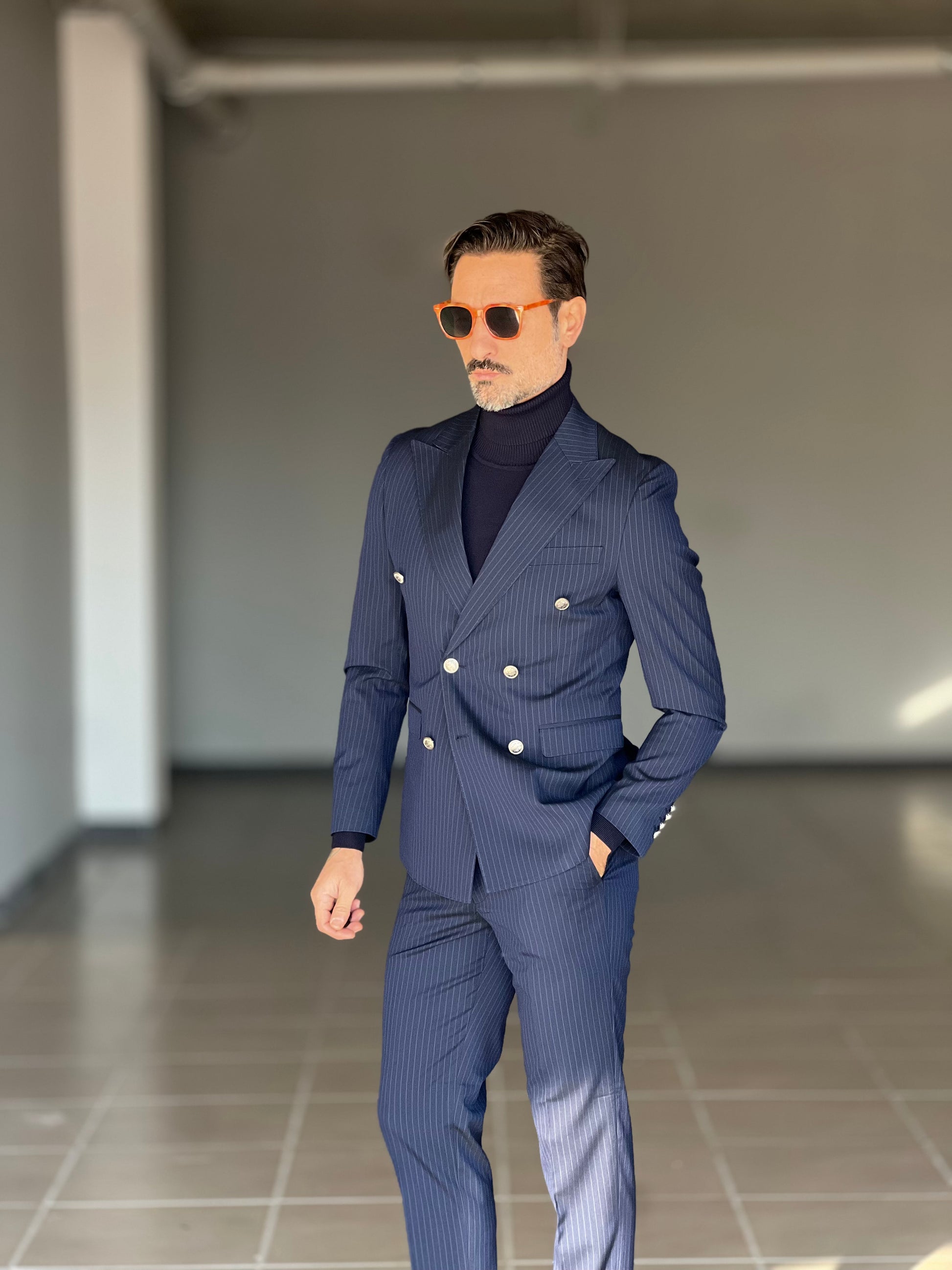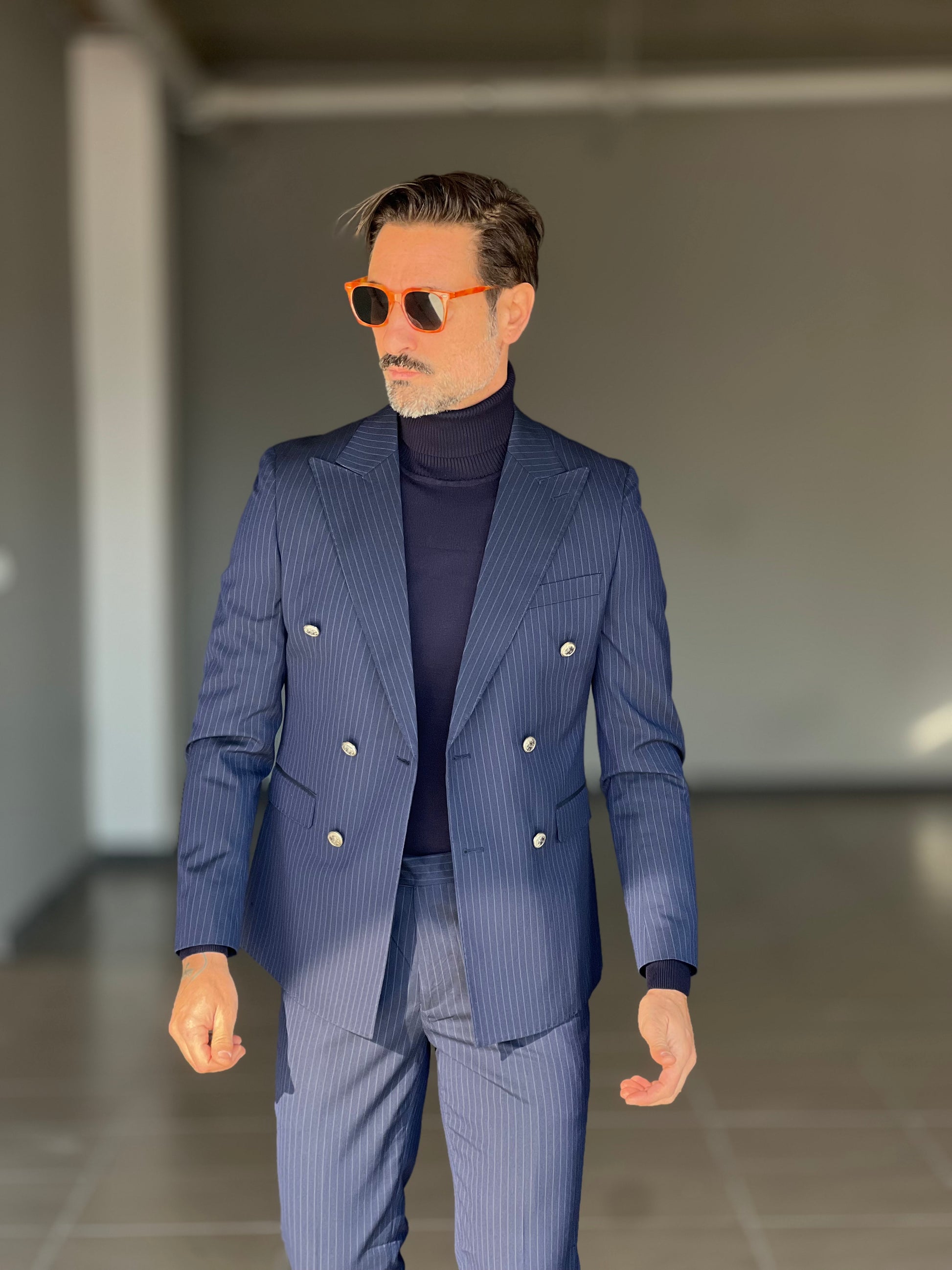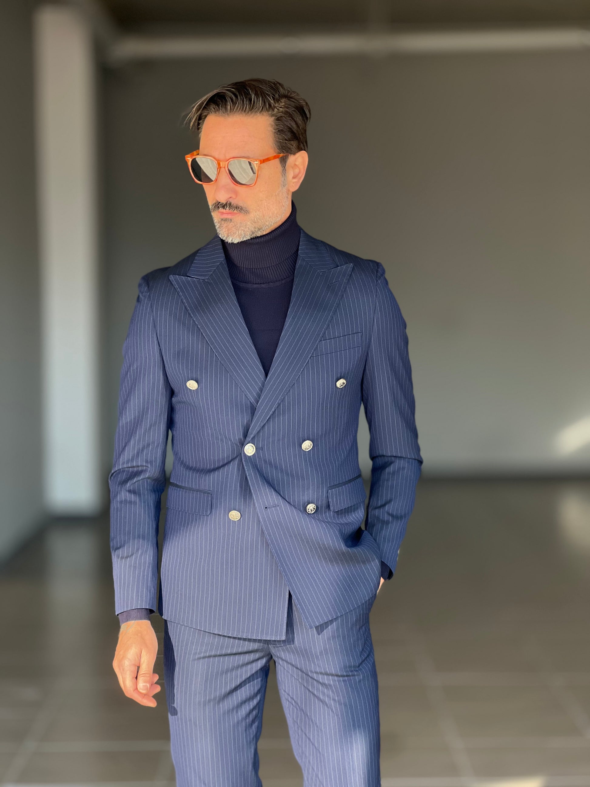 Elegant and sophisticated, this double-breasted suit combines the shine of a metal button with the fluidity of viscose and blended fabrics. The double buttoning accentuates the silhouette, ensuring a confident and professional fit. Perfect for those seeking a versatile piece, capable of accompanying both formal and more sophisticated occasions with style and comfort.