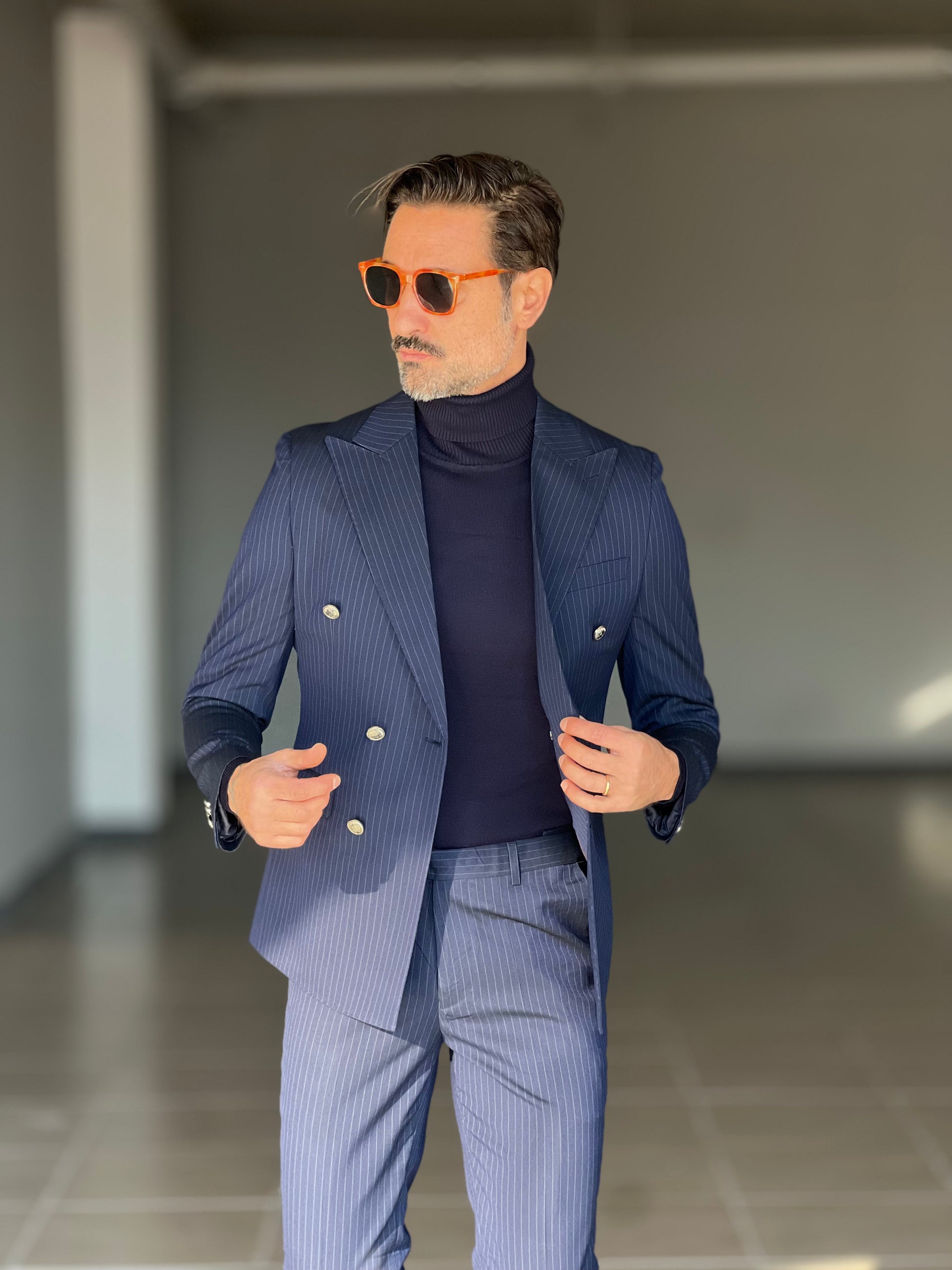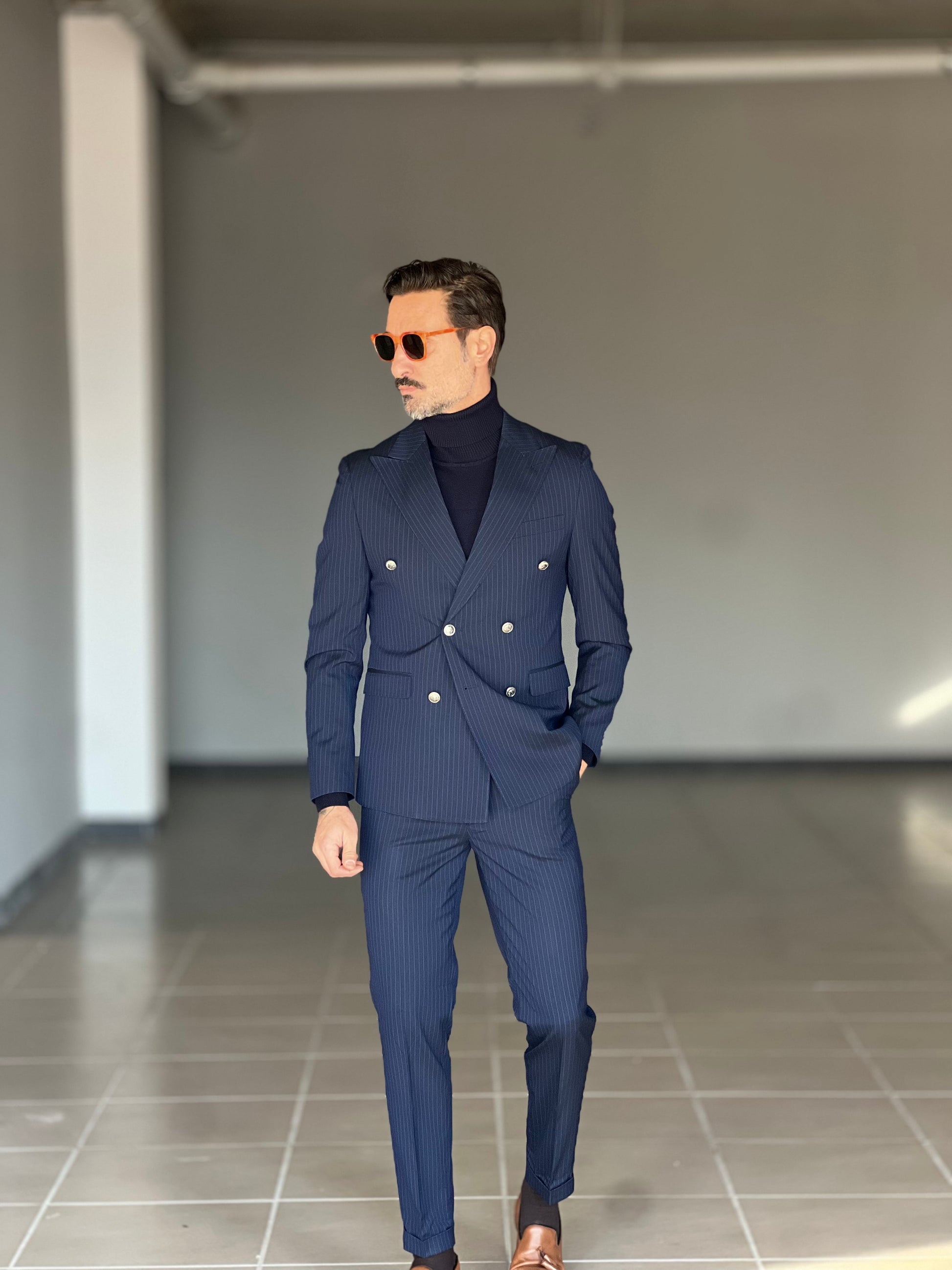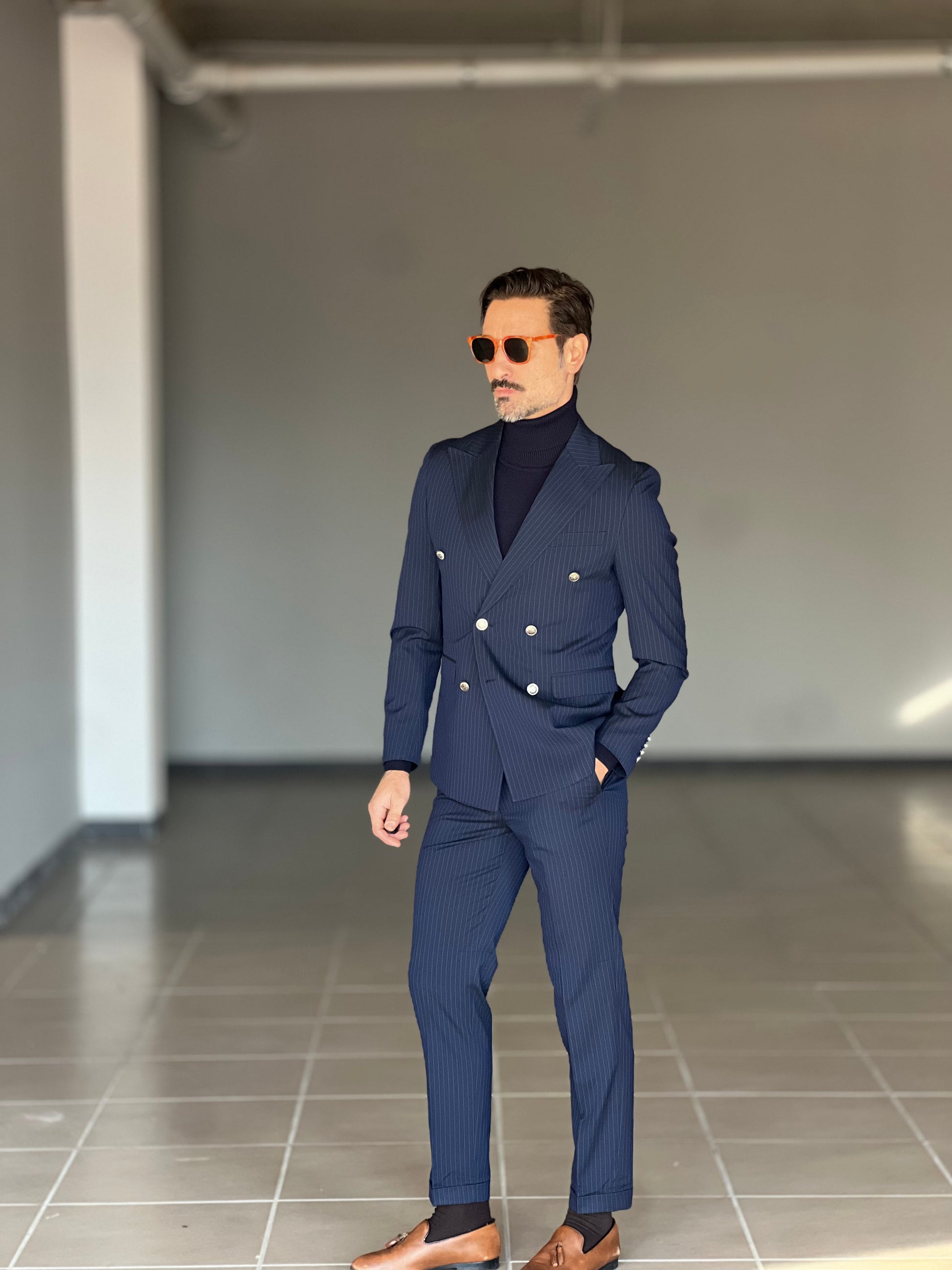 Elegant and sophisticated, this double-breasted suit combines the shine of a metal button with the fluidity of viscose and blended fabrics. The double buttoning accentuates the silhouette, ensuring a confident and professional fit. Perfect for those seeking a versatile piece, capable of accompanying both formal and more sophisticated occasions with style and comfort.