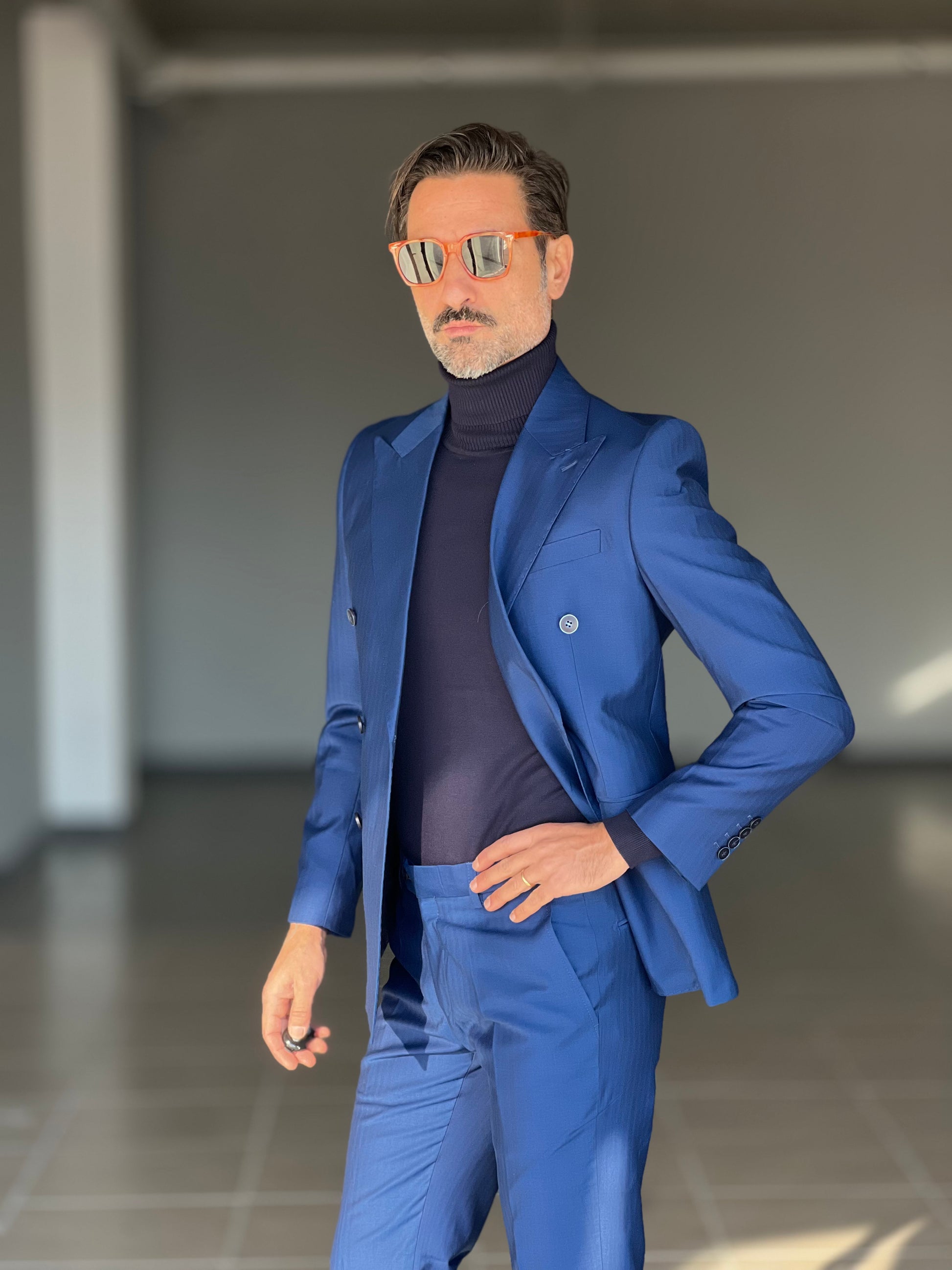 Elegant and sophisticated, this double-breasted suit combines the shine of button with the fluidity of viscose and blended fabrics. The double buttoning accentuates the silhouette, ensuring a confident and professional fit. Perfect for those seeking a versatile piece, capable of accompanying both formal and more sophisticated occasions with style and comfort.