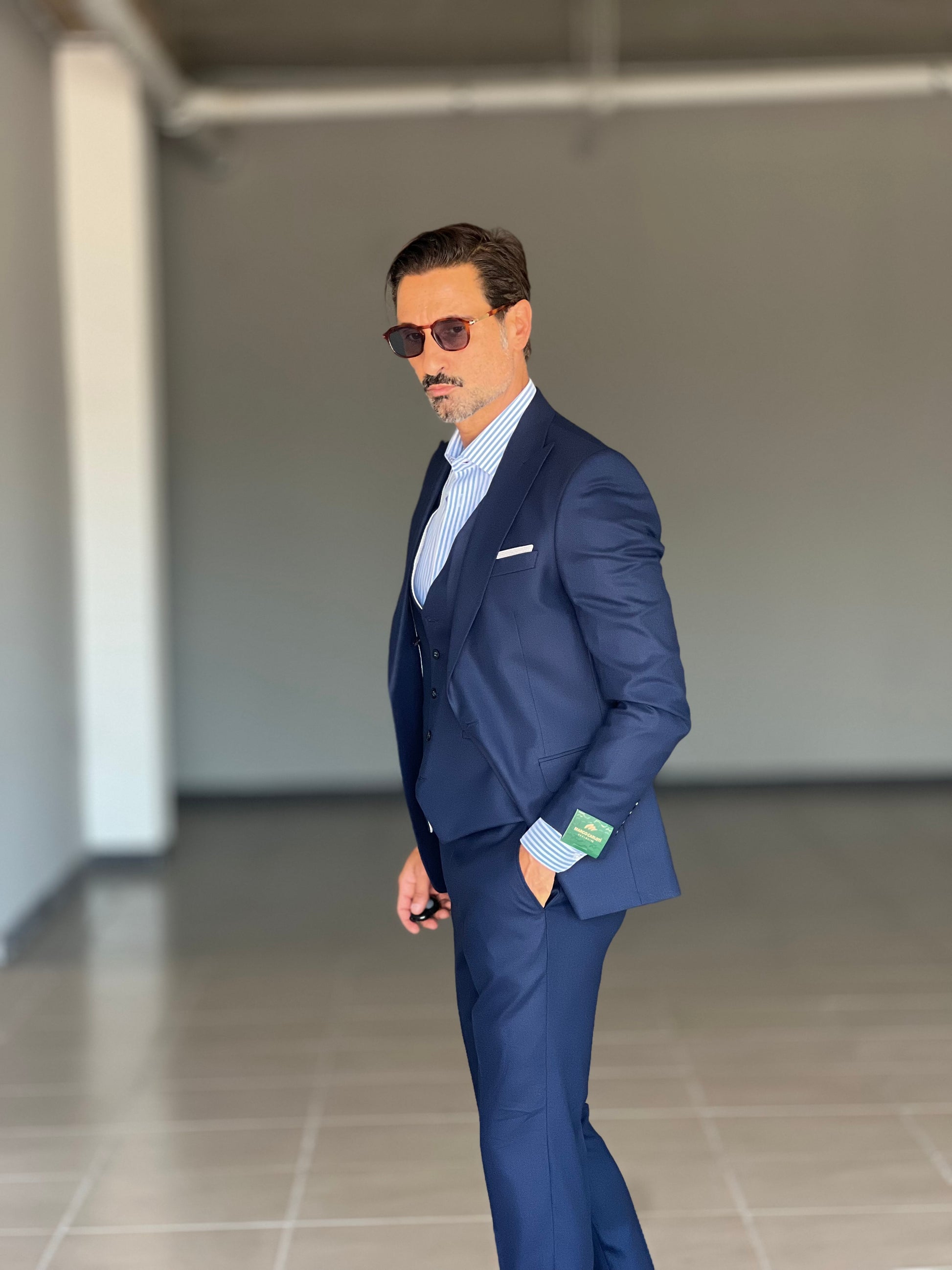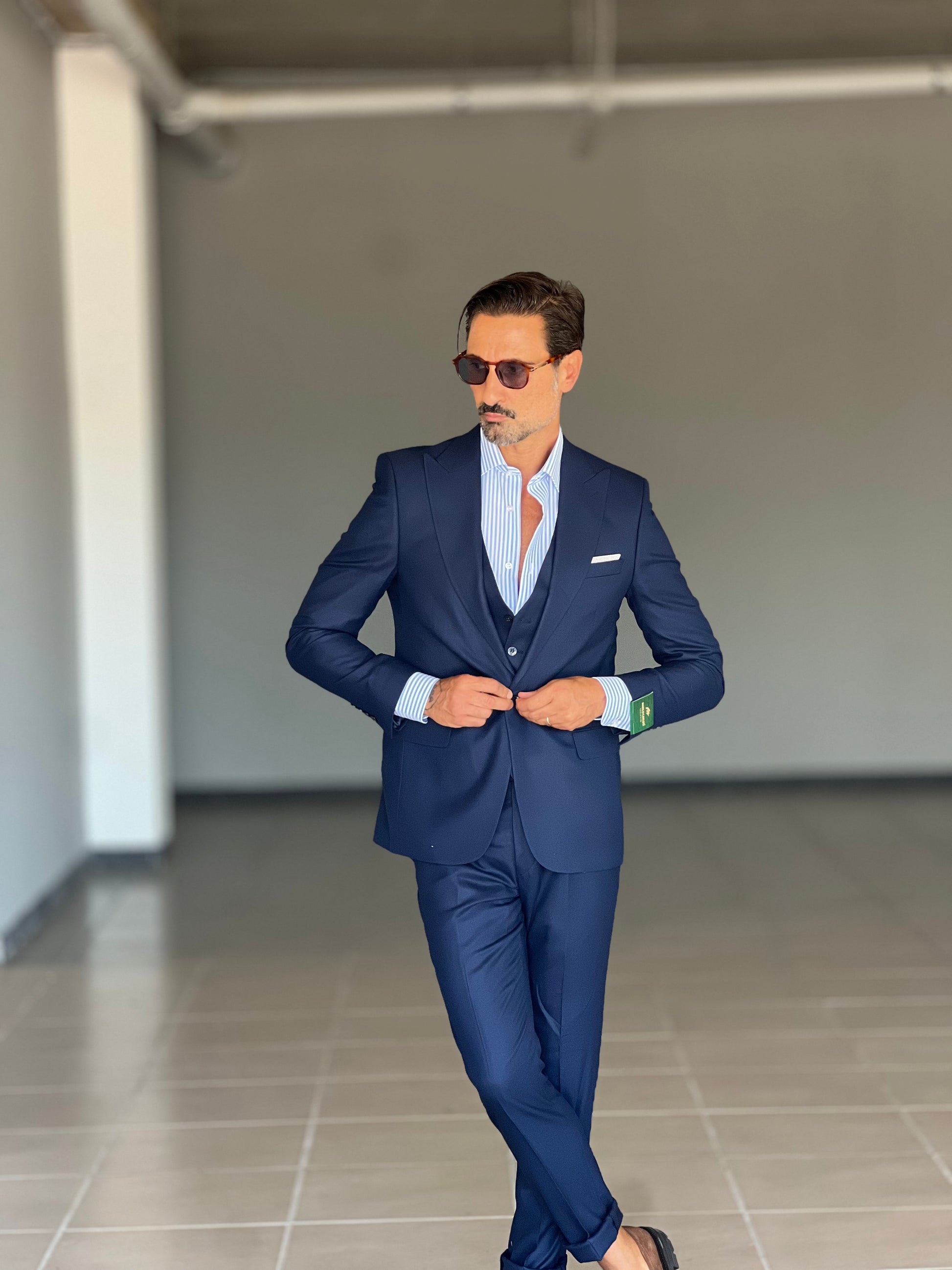 Elegant and sophisticated, this suit combines the shine of a metal button with the fluidity of viscose and blended fabrics. The double buttoning accentuates the silhouette, ensuring a confident and professional fit. Perfect for those seeking a versatile piece, capable of accompanying both formal and more sophisticated occasions with style and comfort.