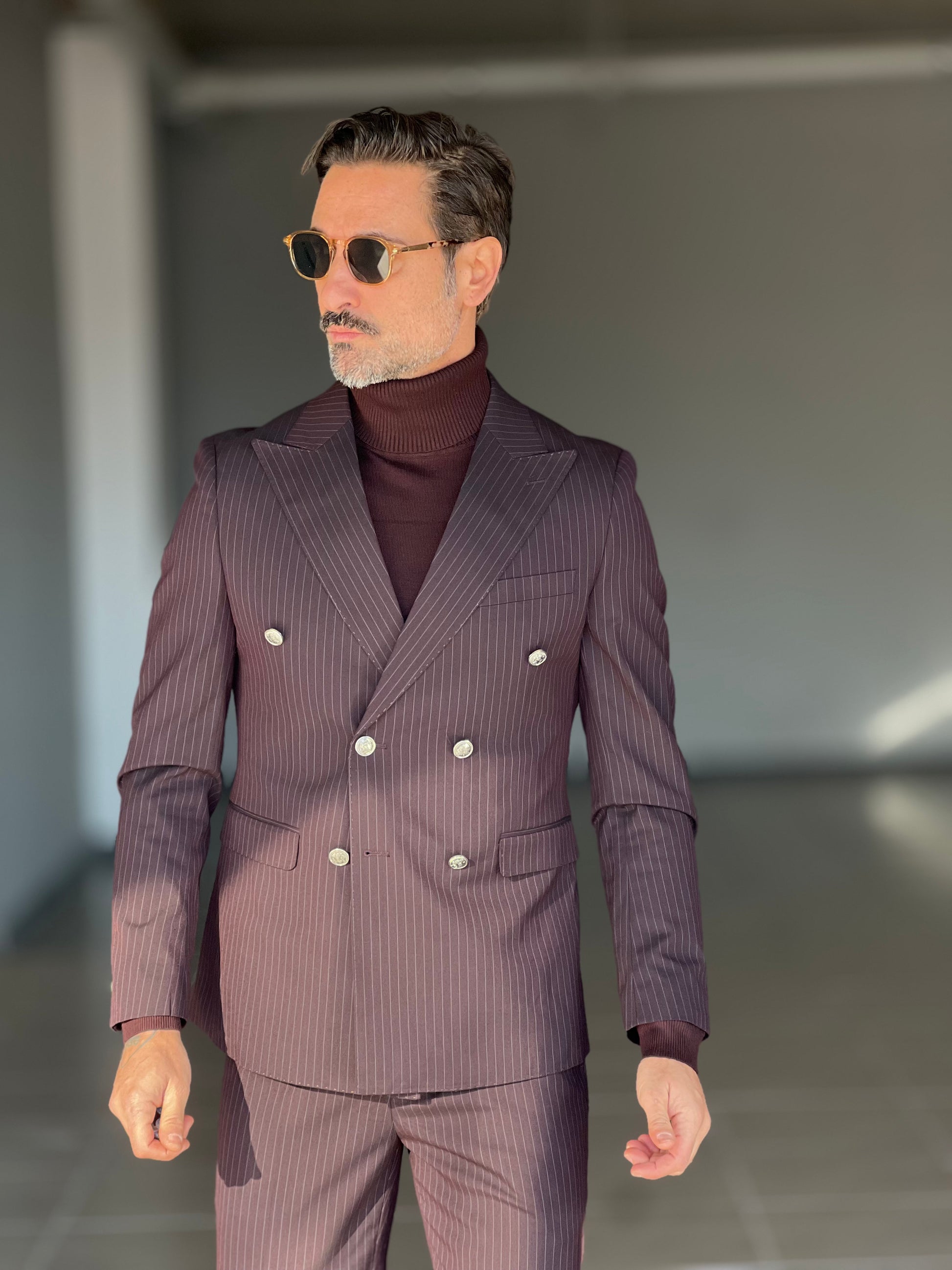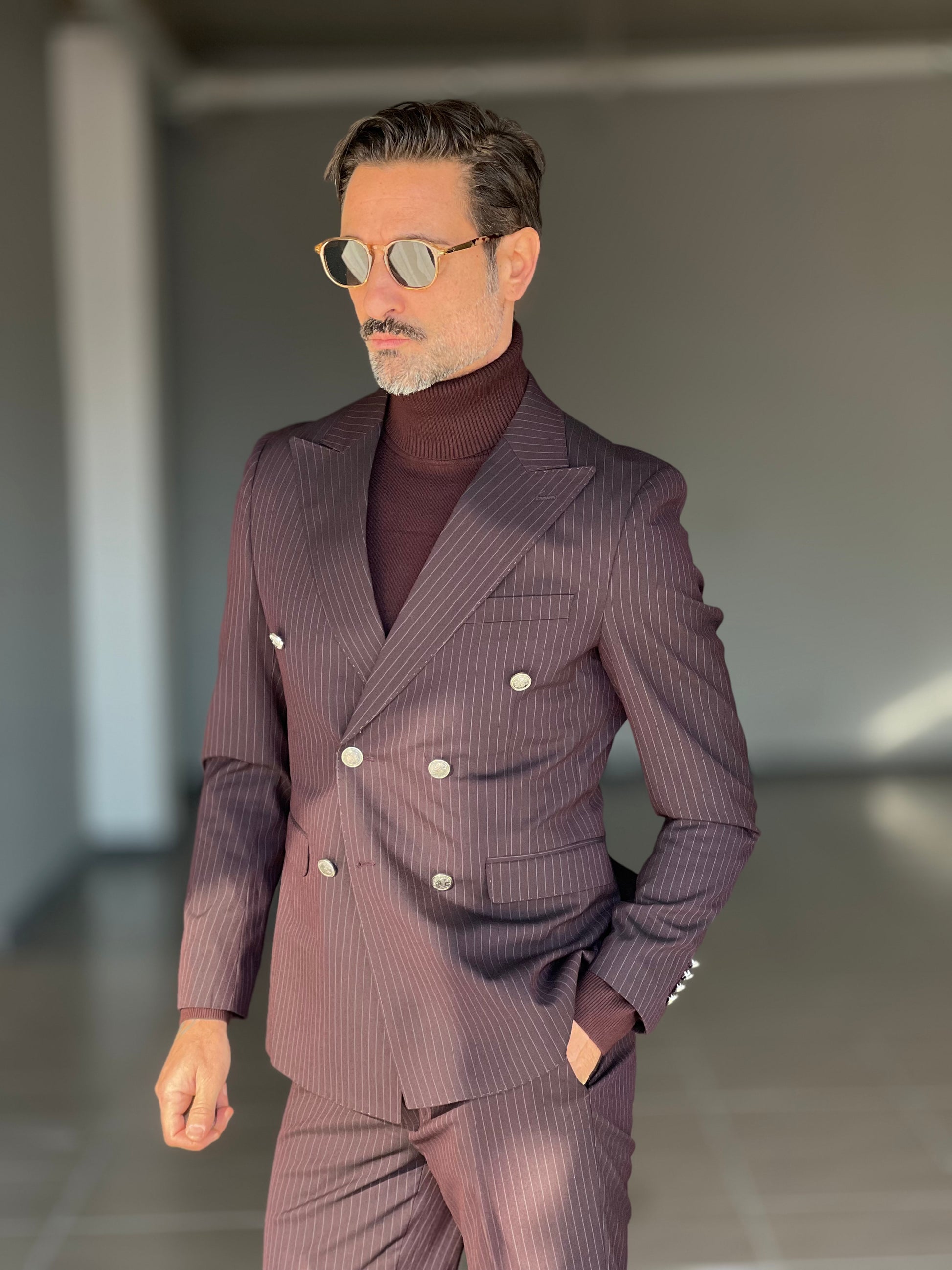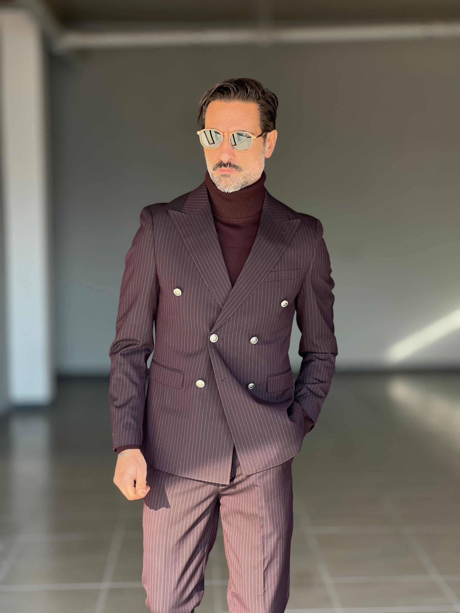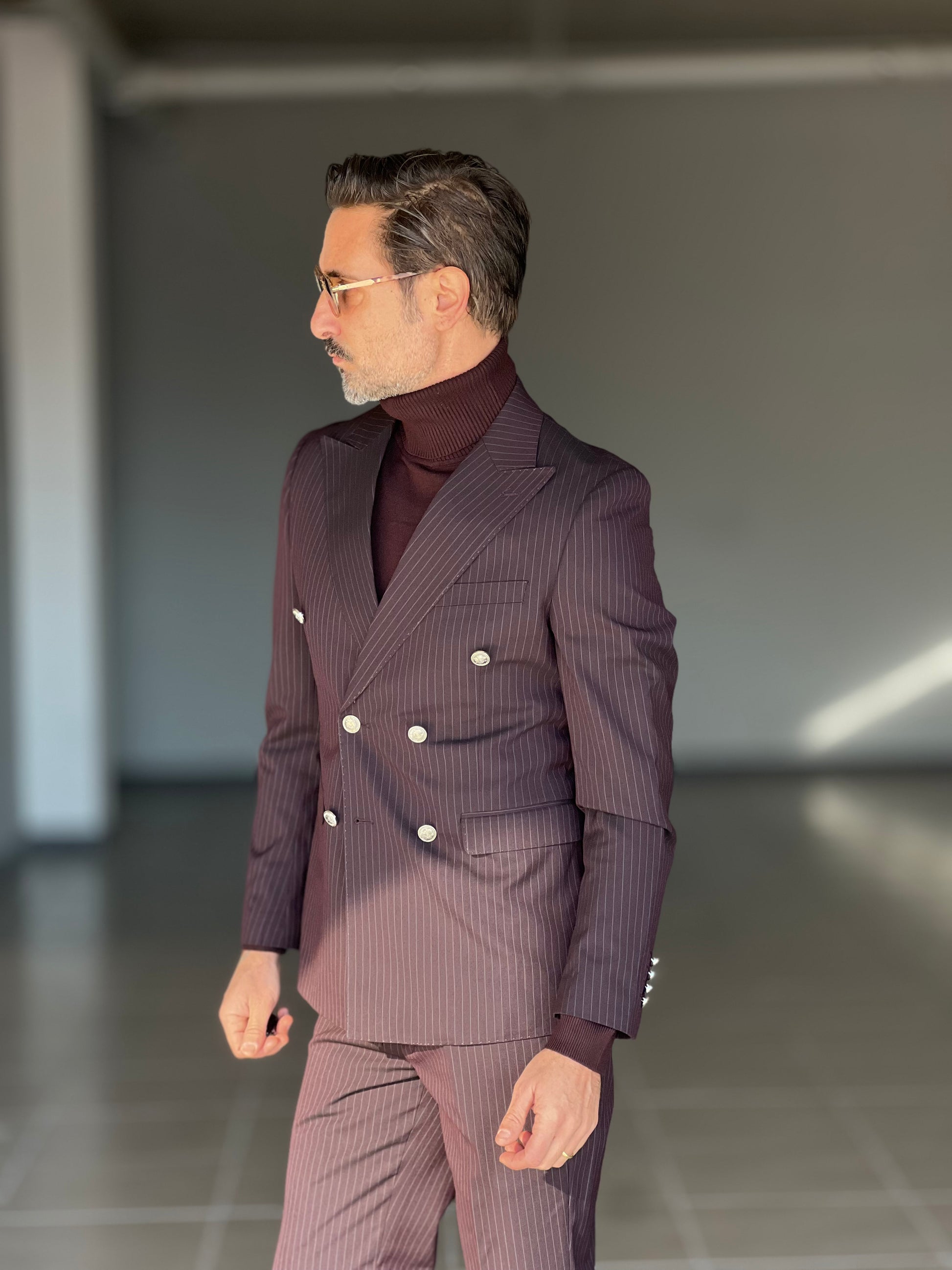Elegant and sophisticated, this double-breasted suit combines the shine of a metal button with the fluidity of viscose and blended fabrics. The double buttoning accentuates the silhouette, ensuring a confident and professional fit. Perfect for those seeking a versatile piece, capable of accompanying both formal and more sophisticated occasions with style and comfort.