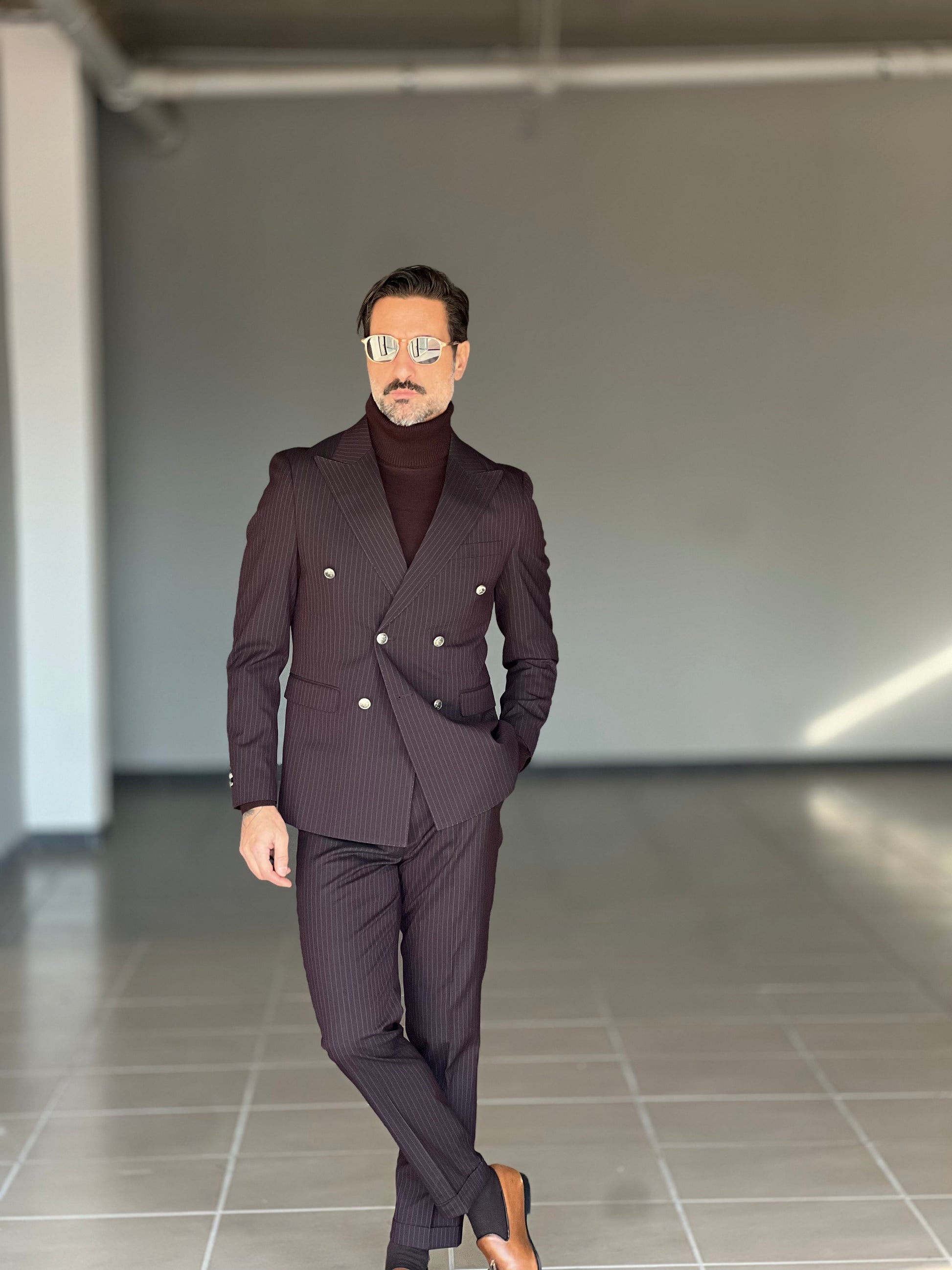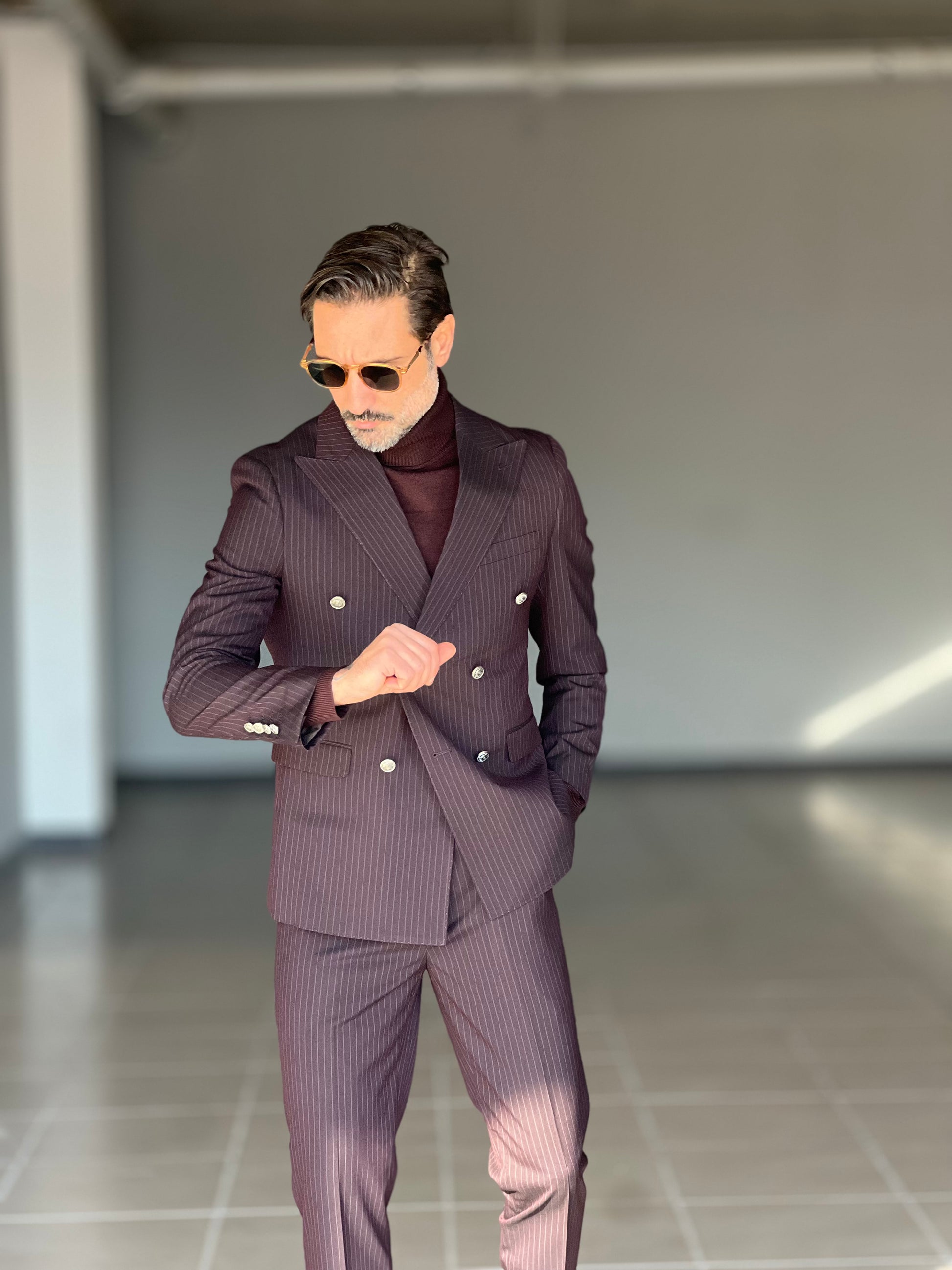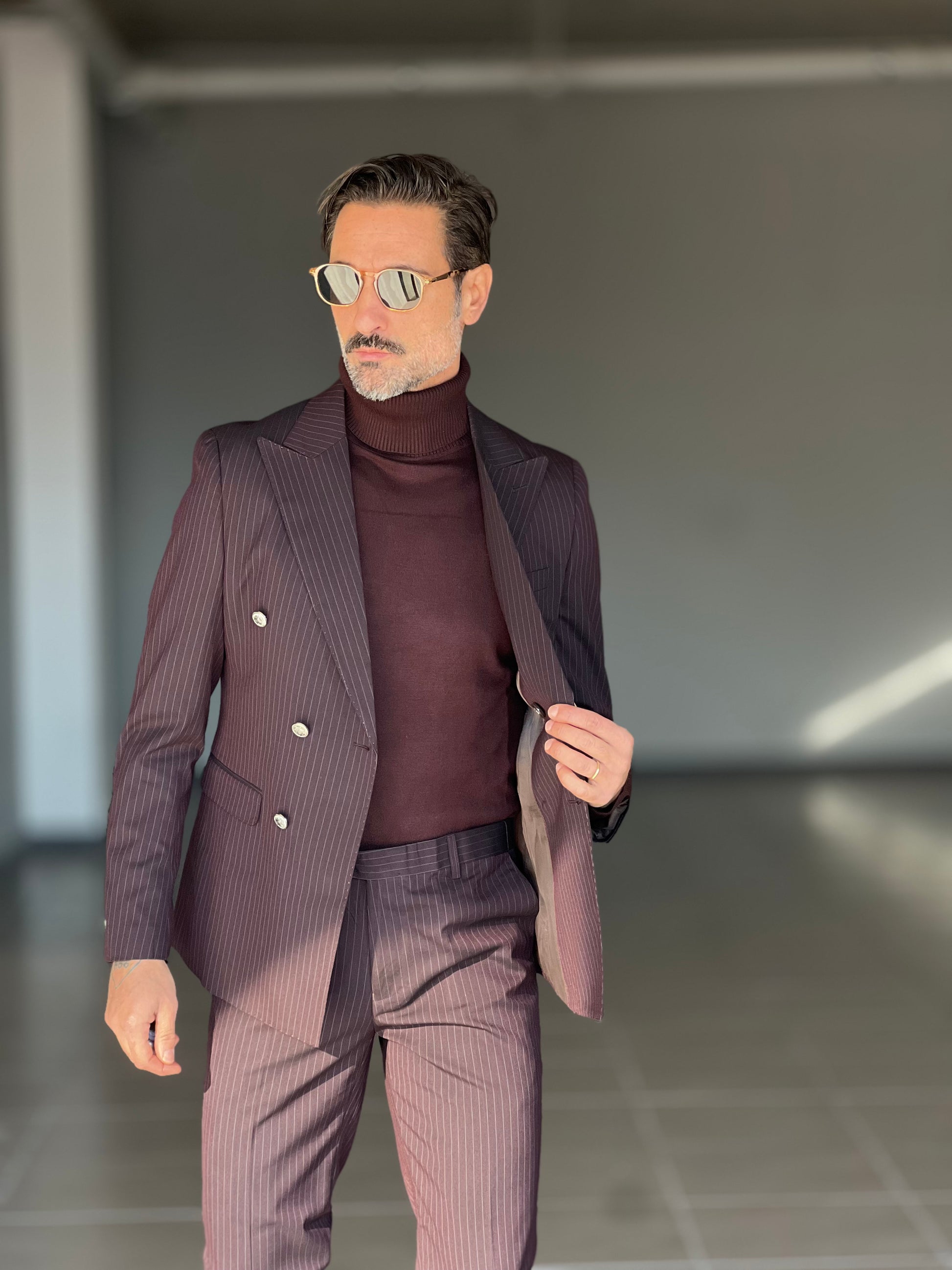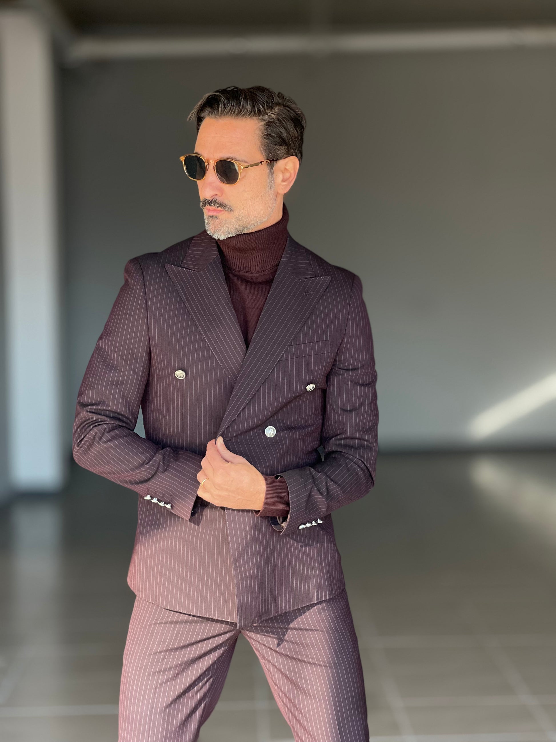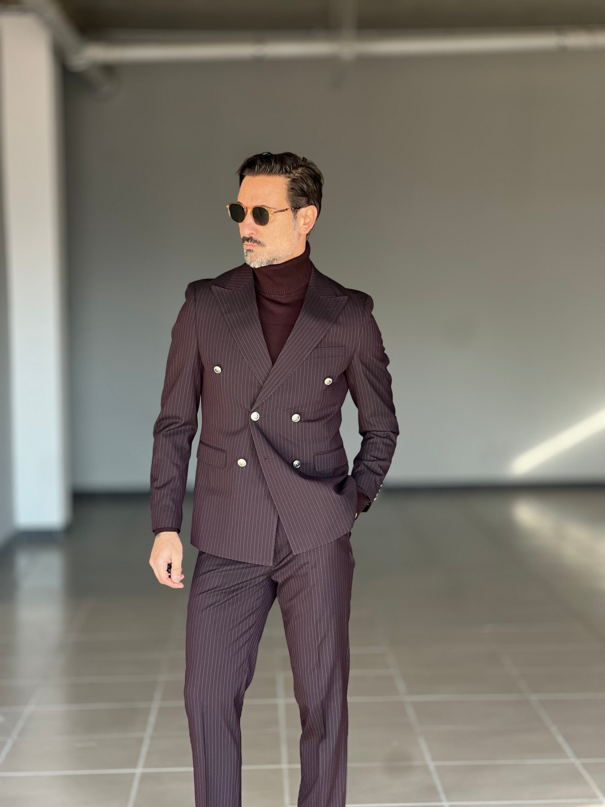 Elegant and sophisticated, this double-breasted suit combines the shine of a metal button with the fluidity of viscose and blended fabrics. The double buttoning accentuates the silhouette, ensuring a confident and professional fit. Perfect for those seeking a versatile piece, capable of accompanying both formal and more sophisticated occasions with style and comfort.