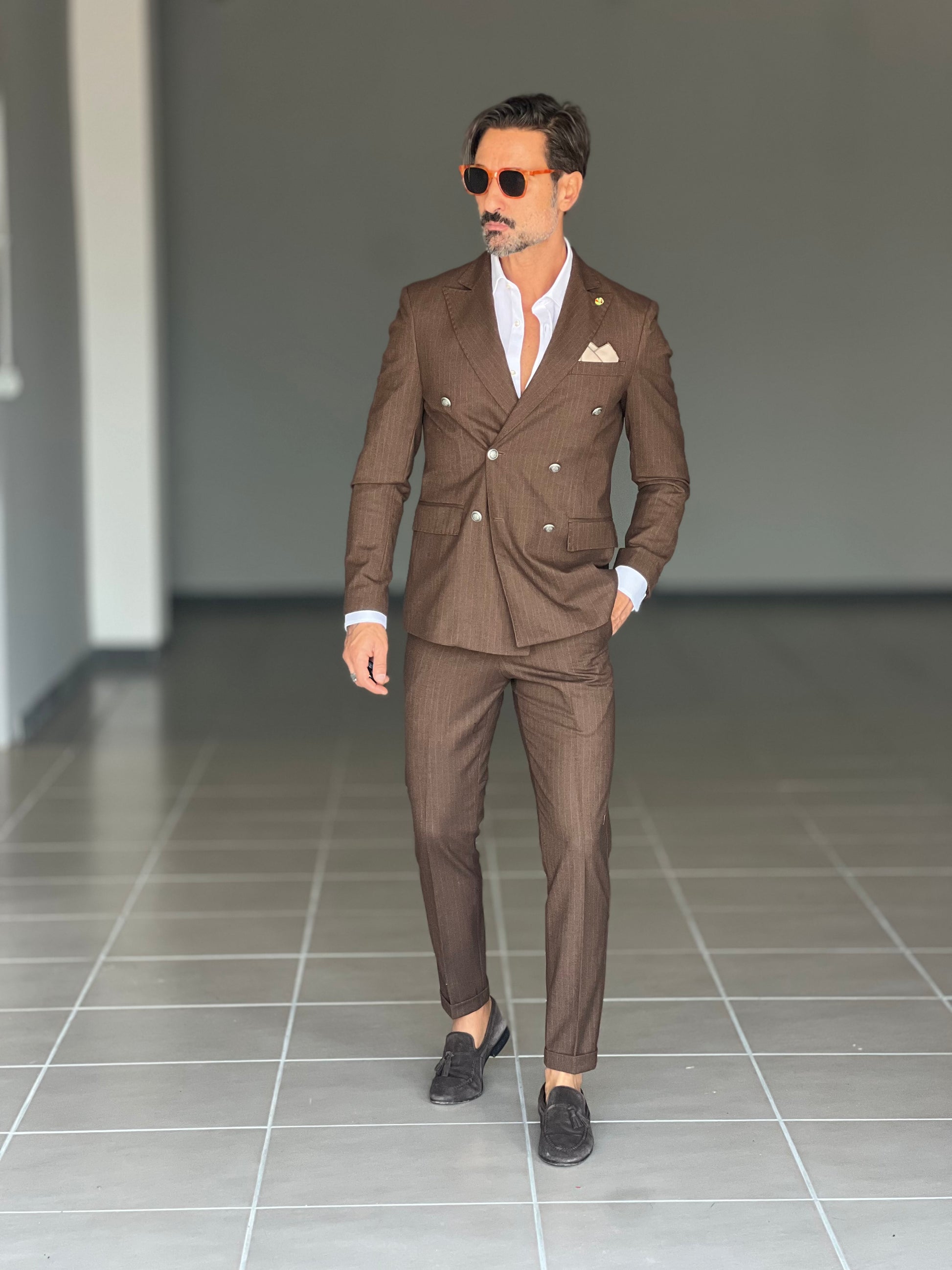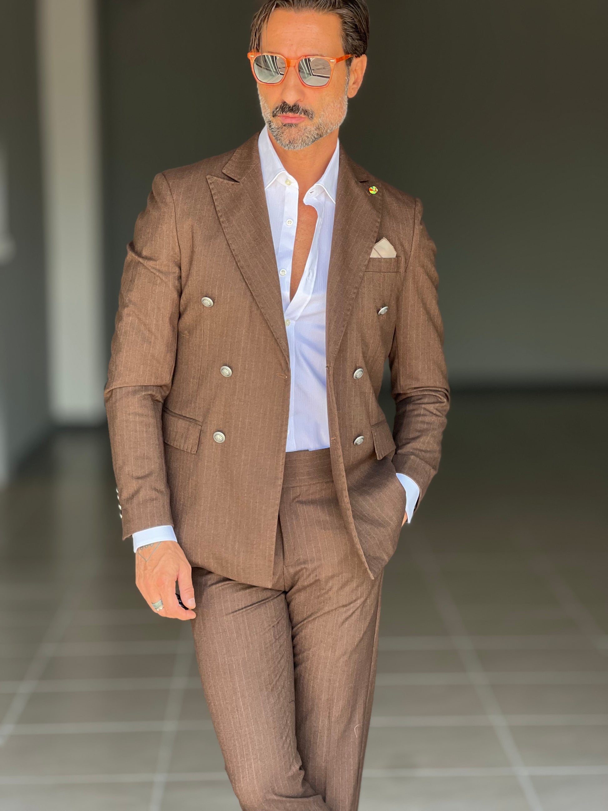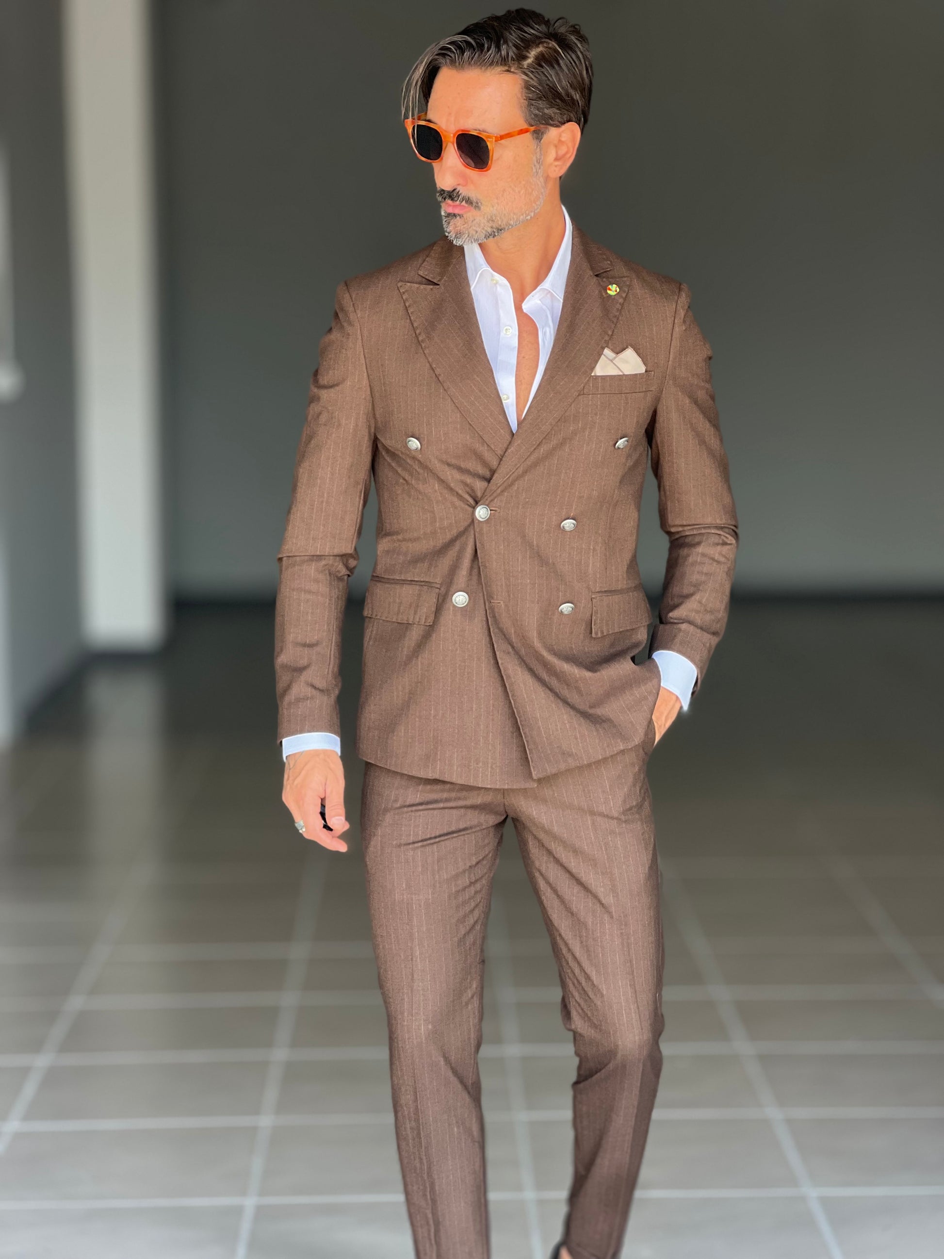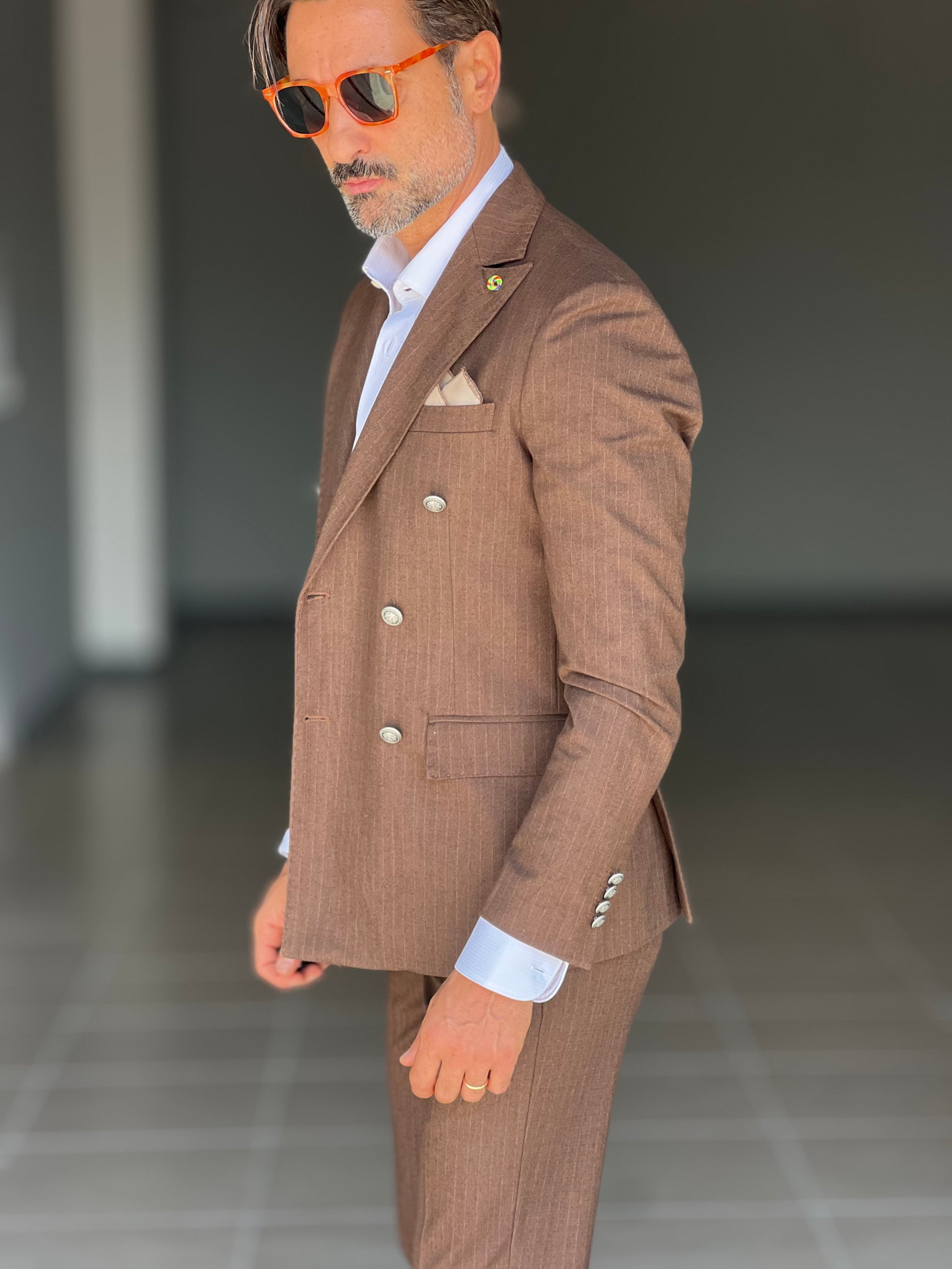 Elegant and sophisticated, this double-breasted suit combines the shine of a metal button with the fluidity of viscose and blended fabrics. The double buttoning accentuates the silhouette, ensuring a confident and professional fit. Perfect for those seeking a versatile piece, capable of accompanying both formal and more sophisticated occasions with style and comfort.