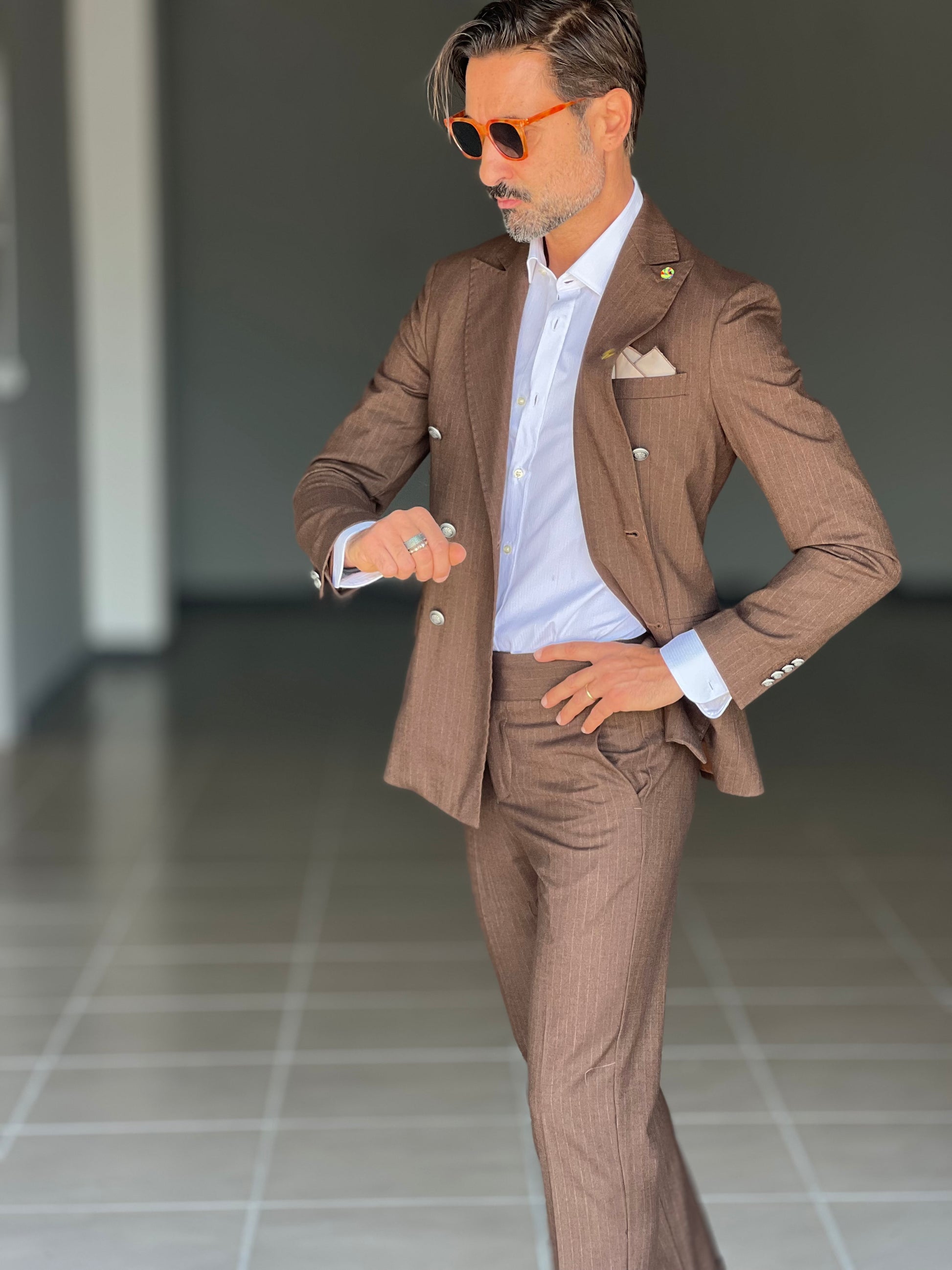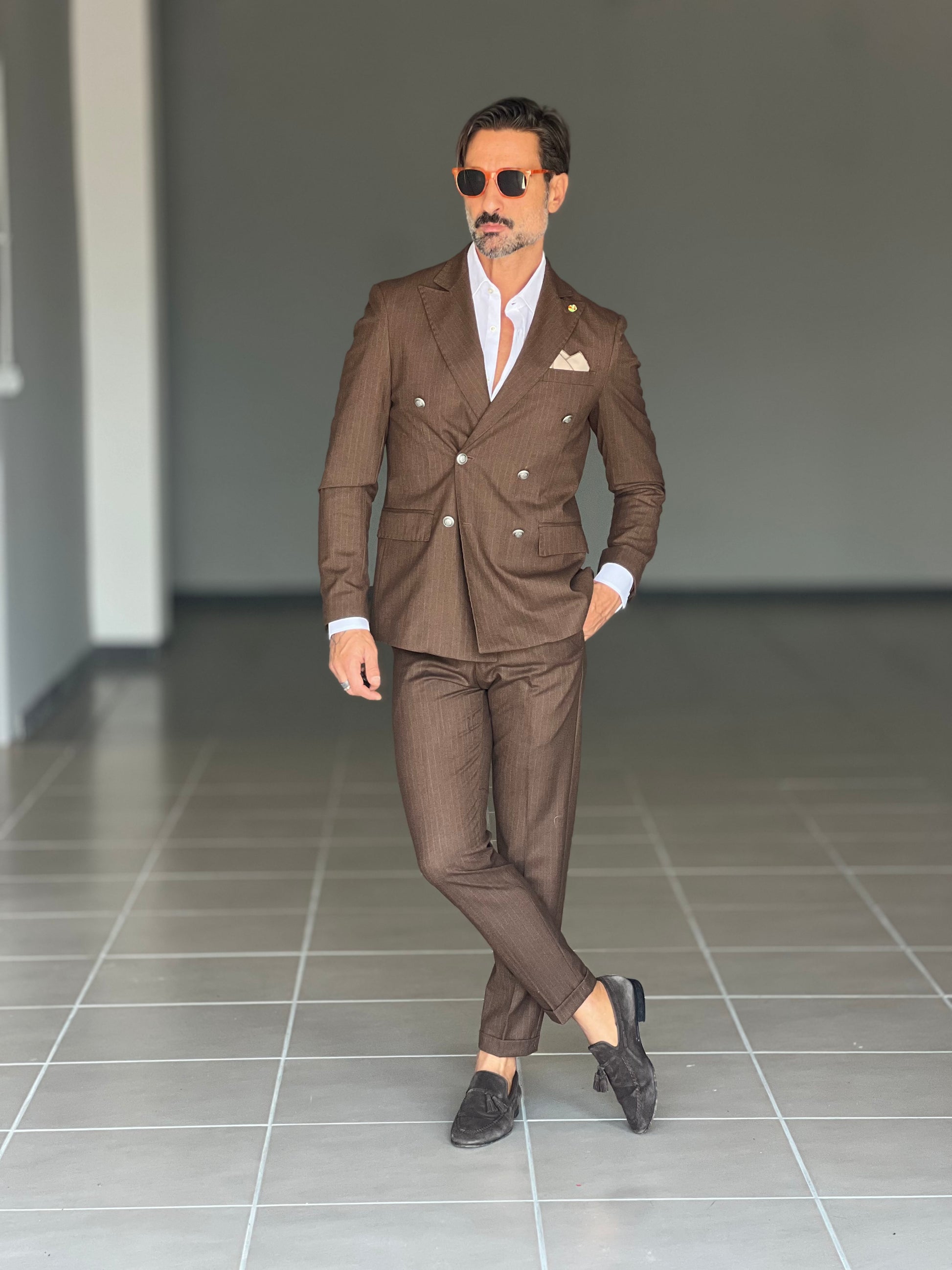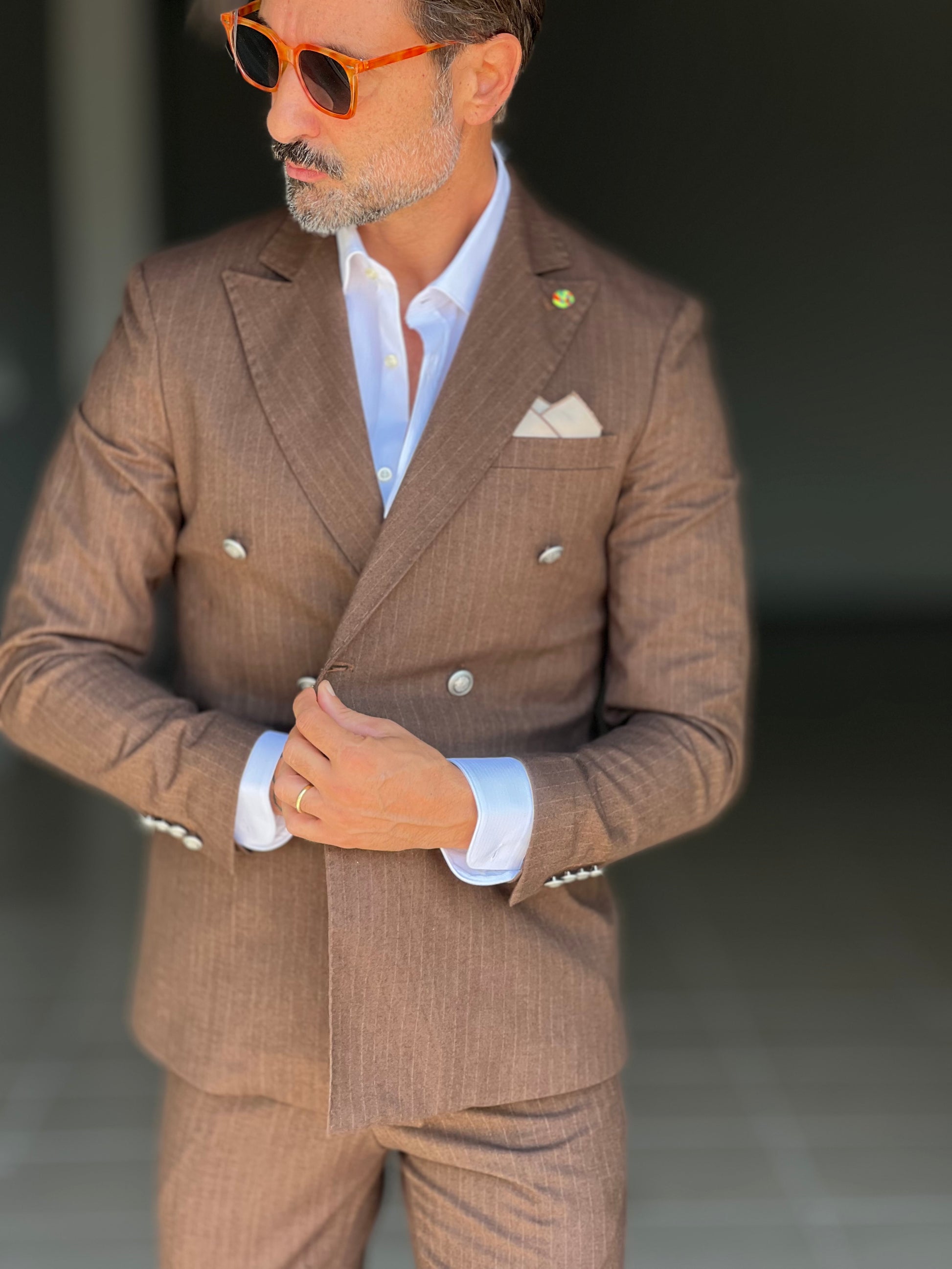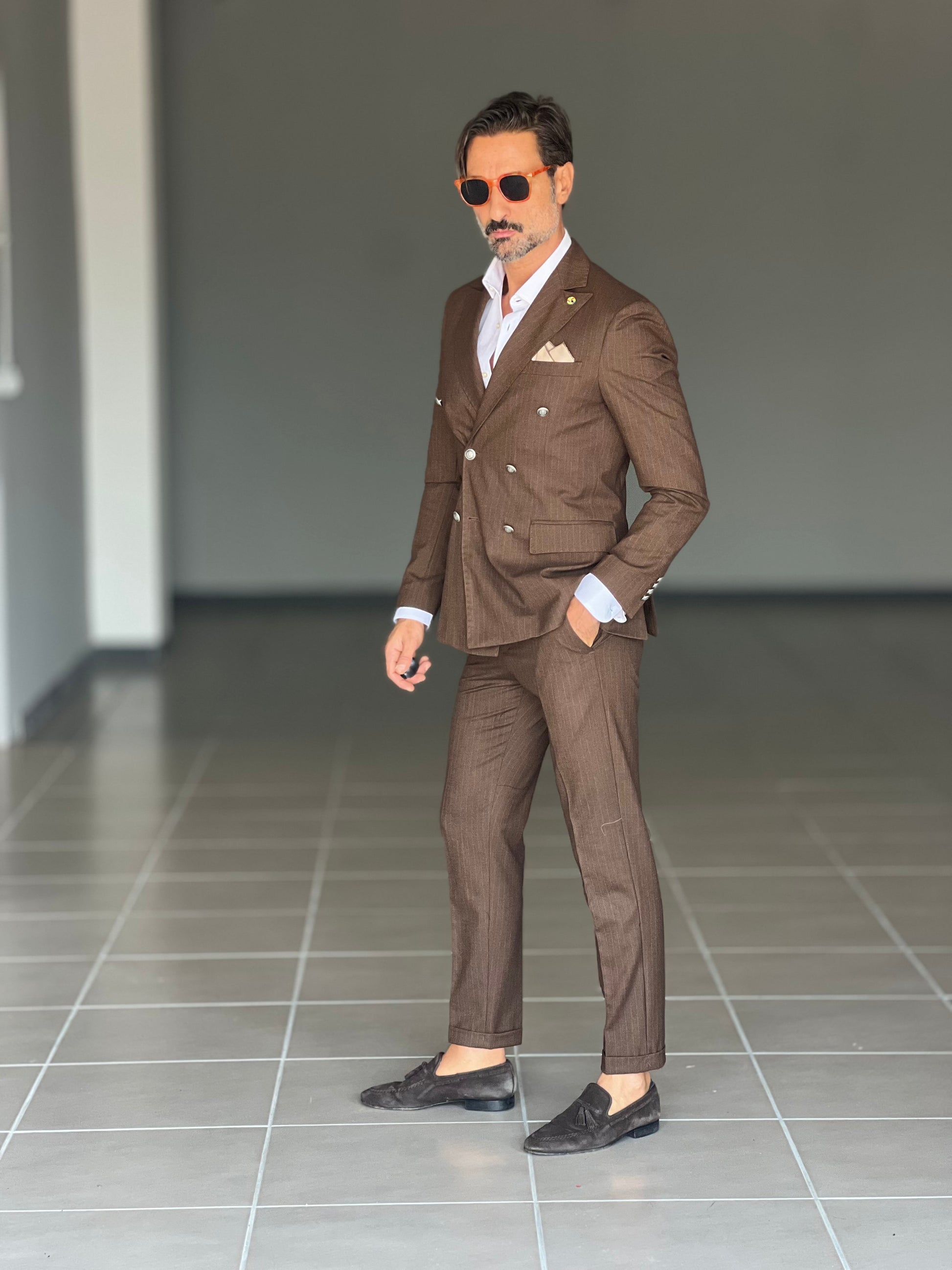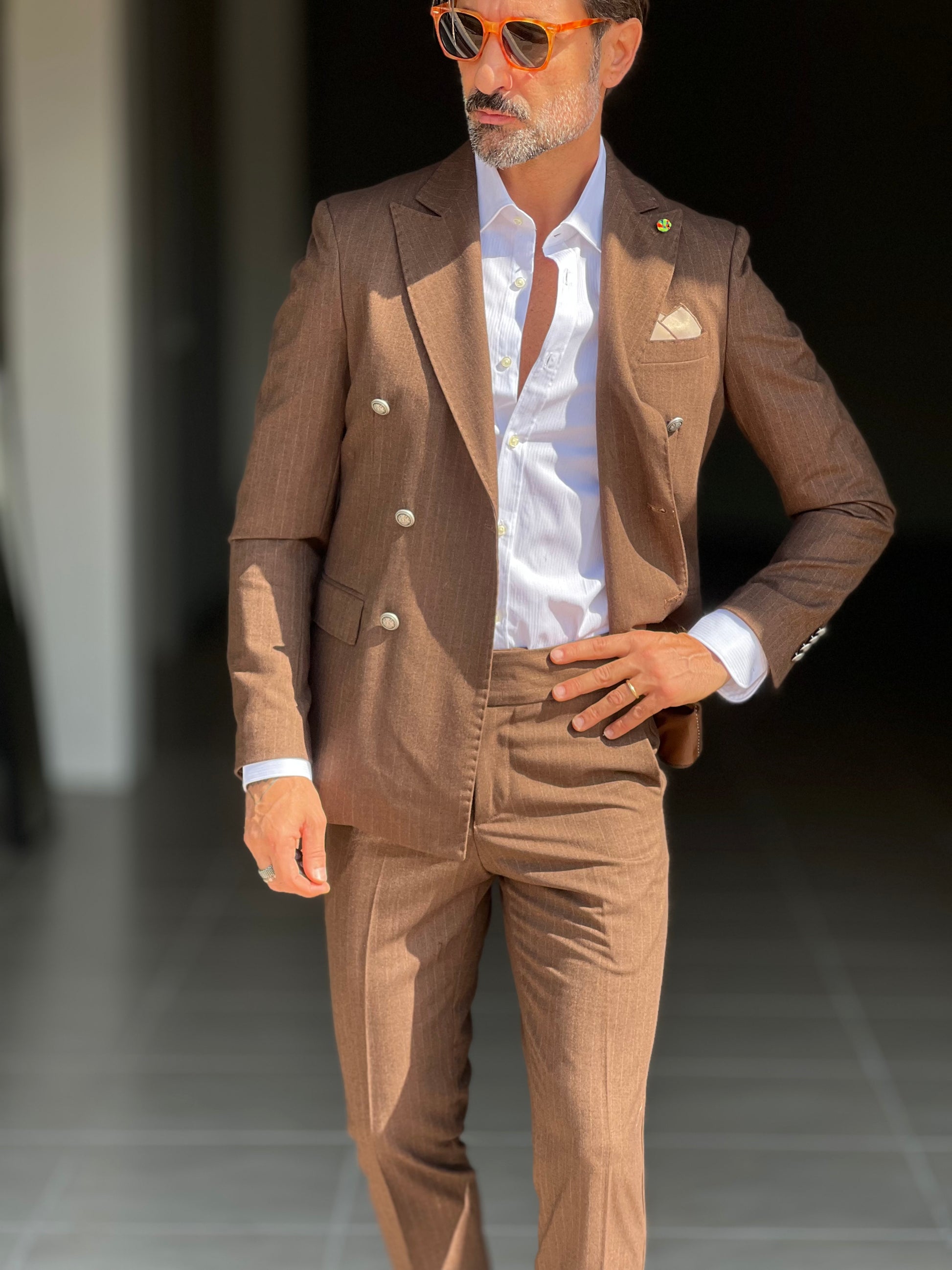 Elegant and sophisticated, this double-breasted suit combines the shine of a metal button with the fluidity of viscose and blended fabrics. The double buttoning accentuates the silhouette, ensuring a confident and professional fit. Perfect for those seeking a versatile piece, capable of accompanying both formal and more sophisticated occasions with style and comfort.