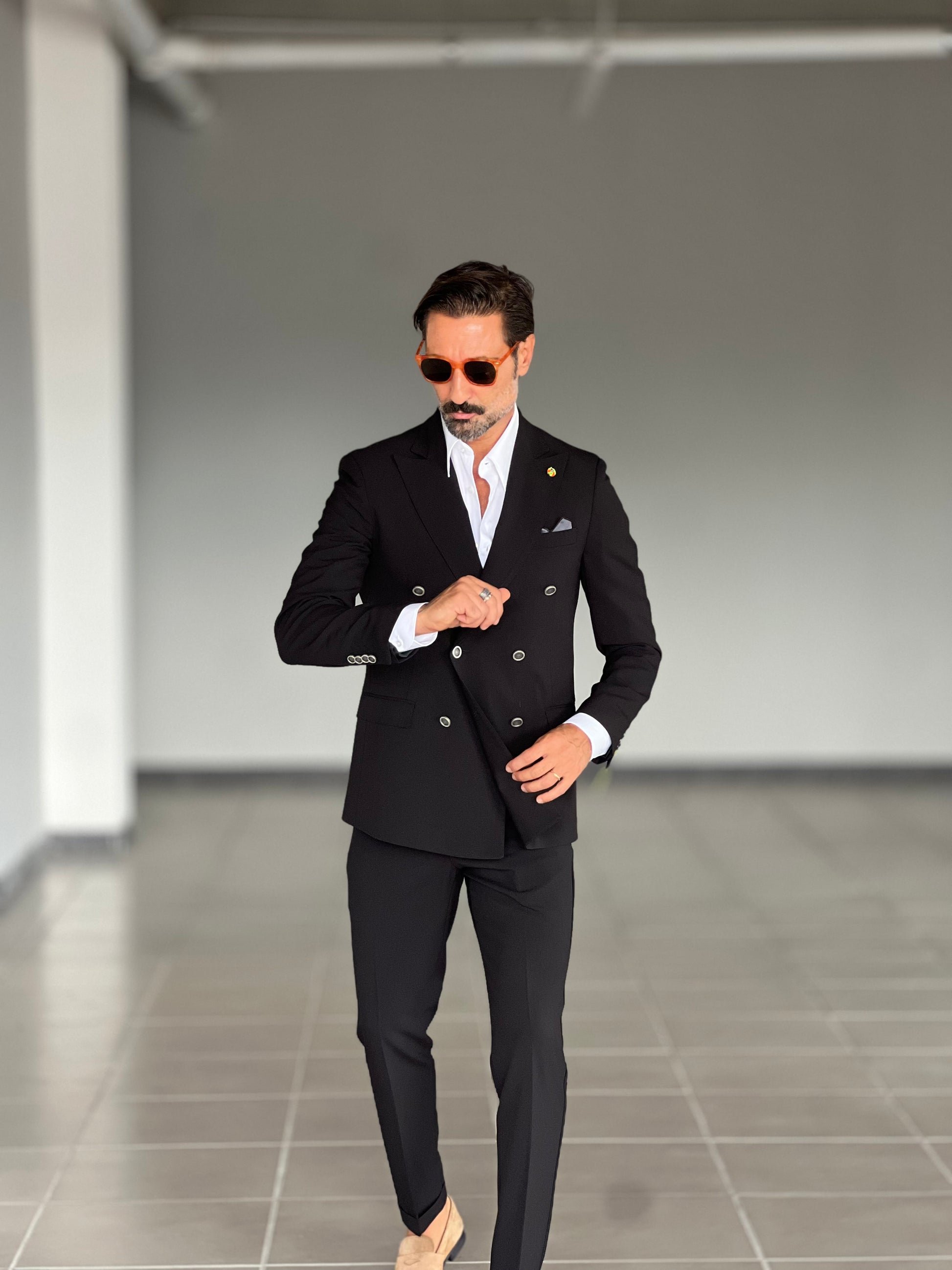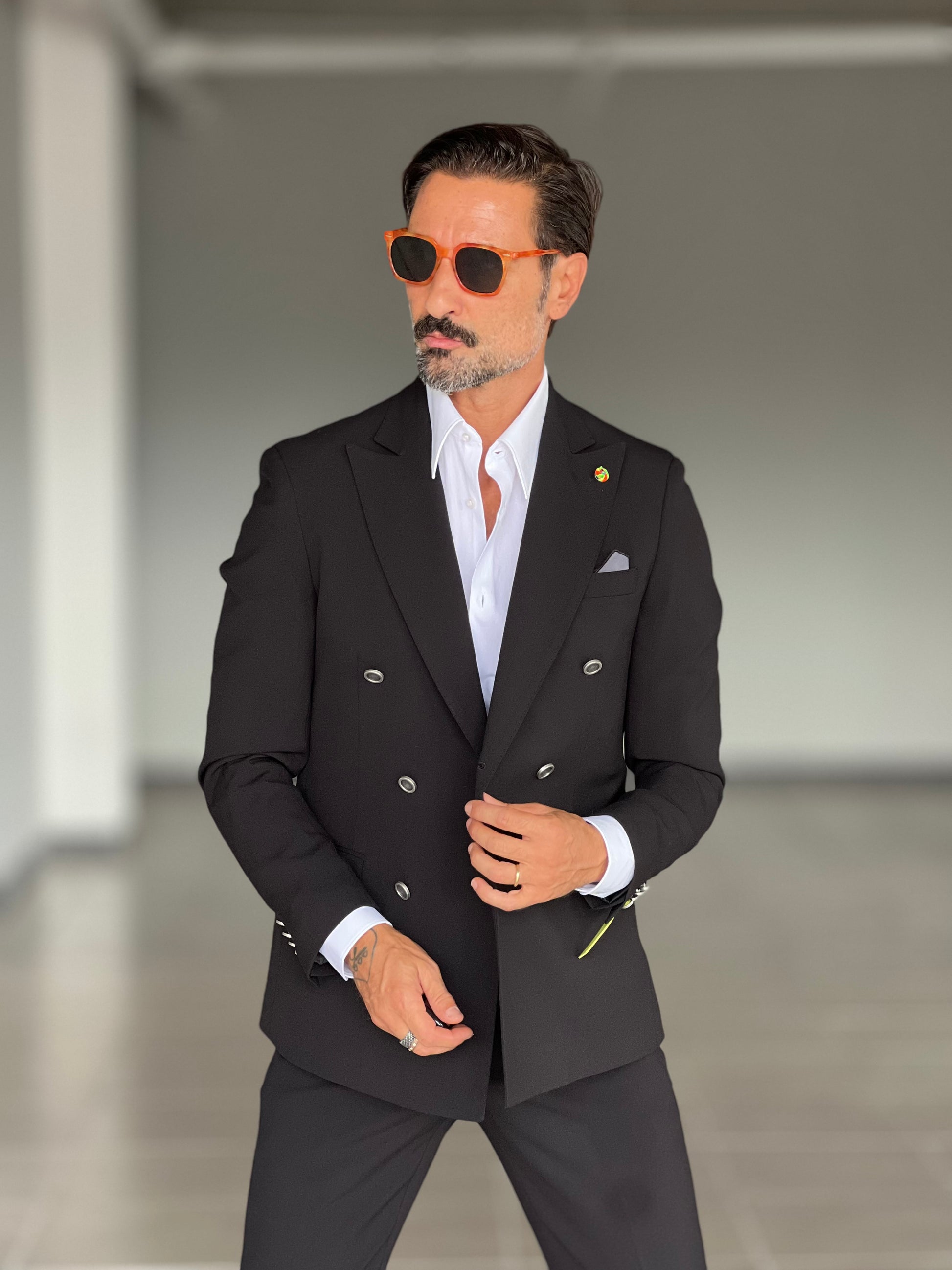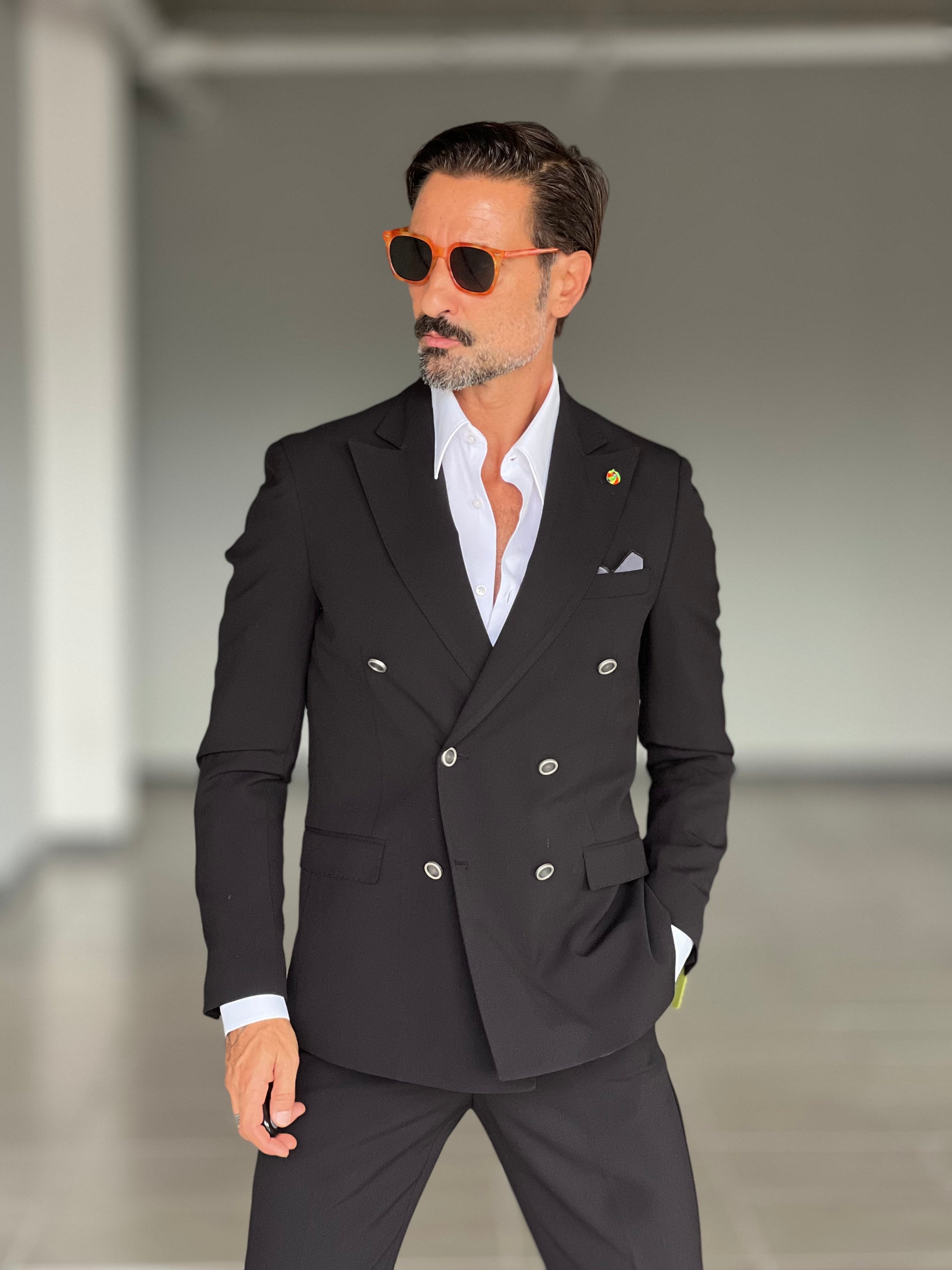Elegant and sophisticated, this double-breasted suit combines the shine of a metal button with the fluidity of viscose and blended fabrics. The double buttoning accentuates the silhouette, ensuring a confident and professional fit. Perfect for those seeking a versatile piece, capable of accompanying both formal and more sophisticated occasions with style and comfort.