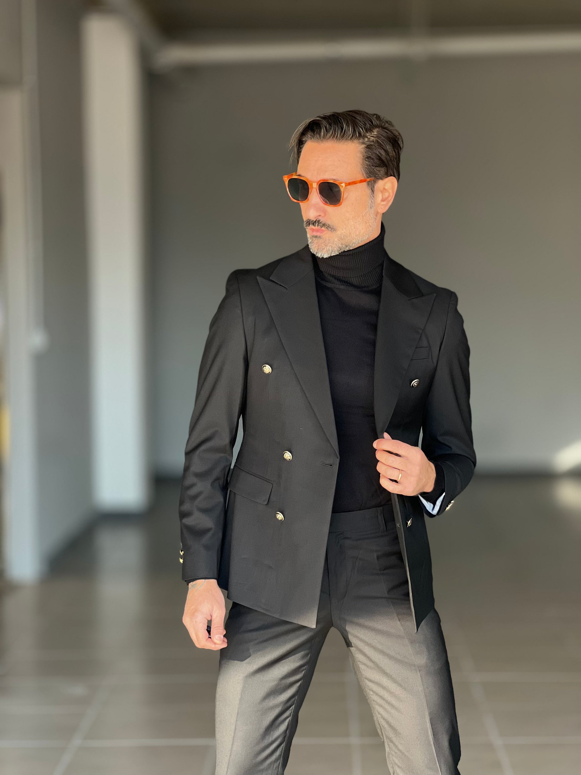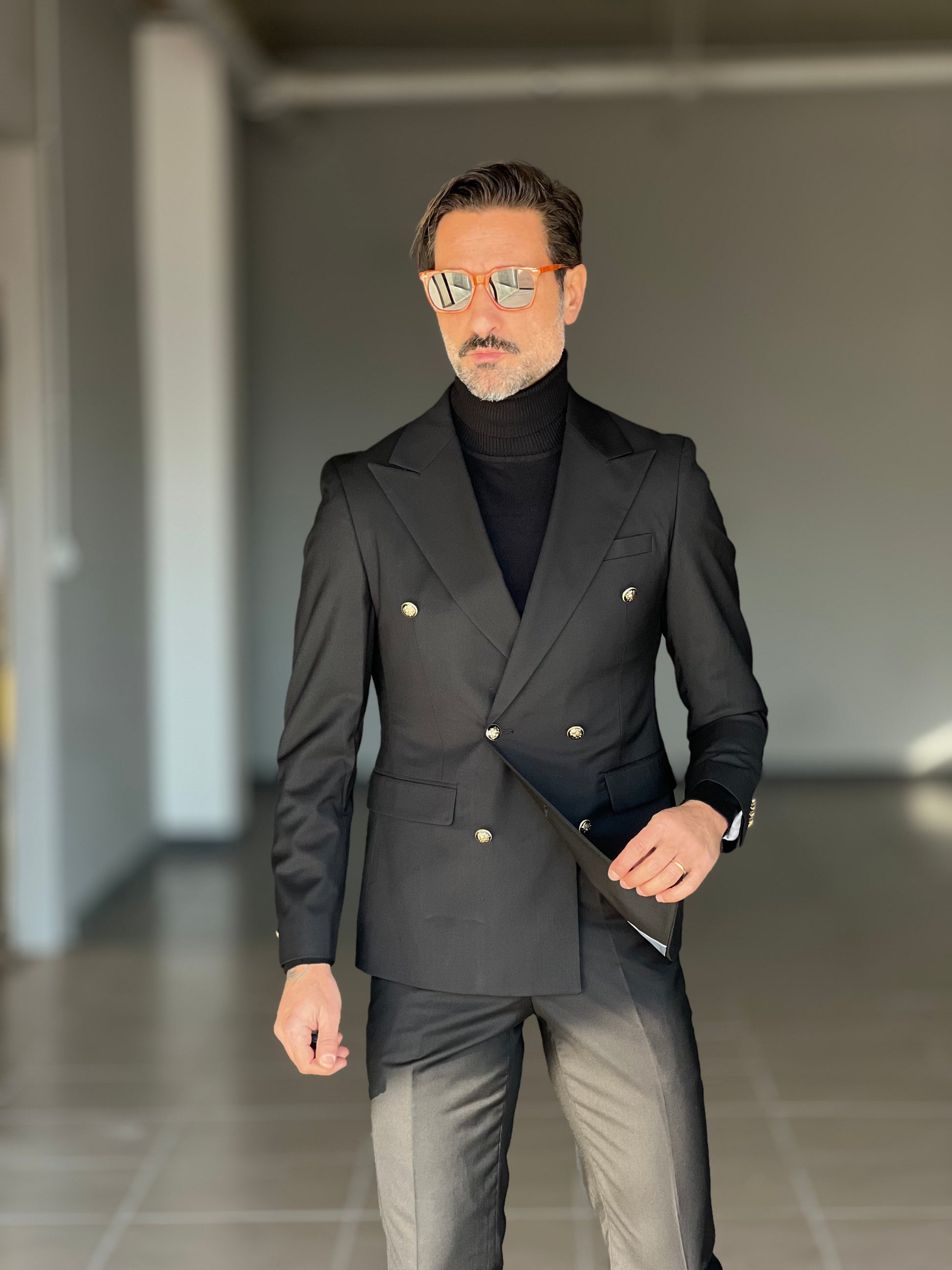 Elegant and sophisticated, this double-breasted suit combines the shine of a metal button with the fluidity of viscose and blended fabrics. The double buttoning accentuates the silhouette, ensuring a confident and professional fit. Perfect for those seeking a versatile piece, capable of accompanying both formal and more sophisticated occasions with style and comfort.