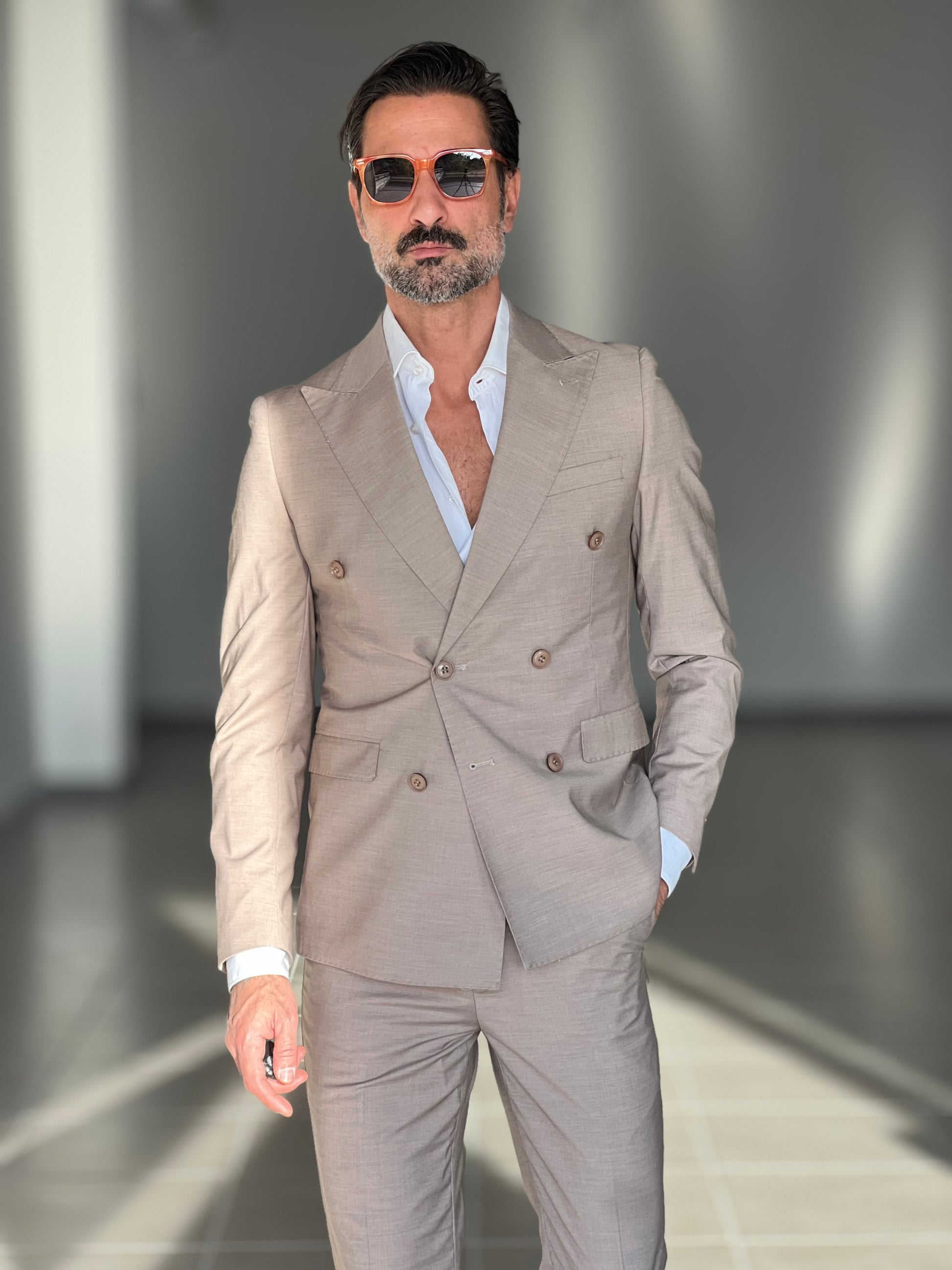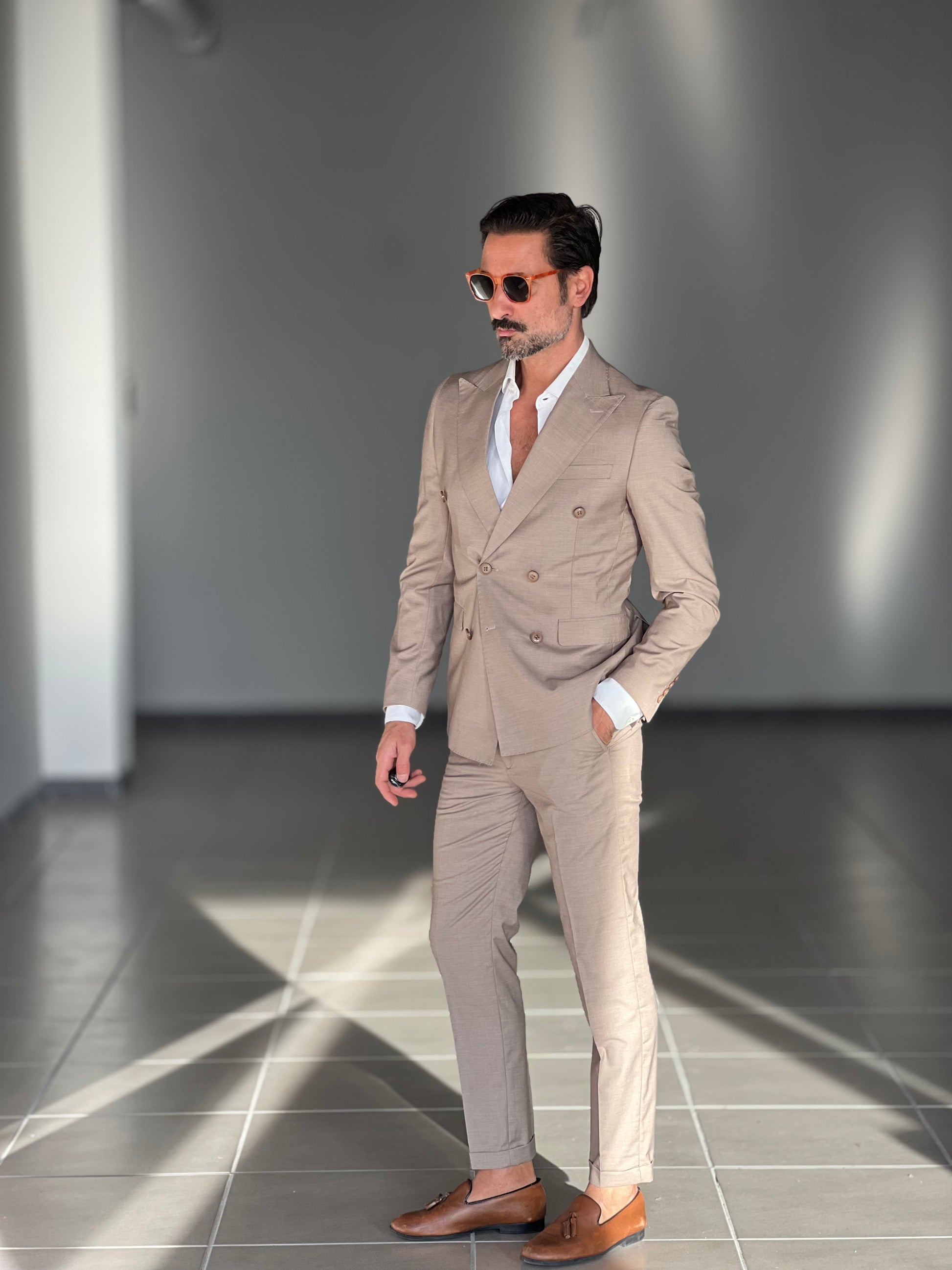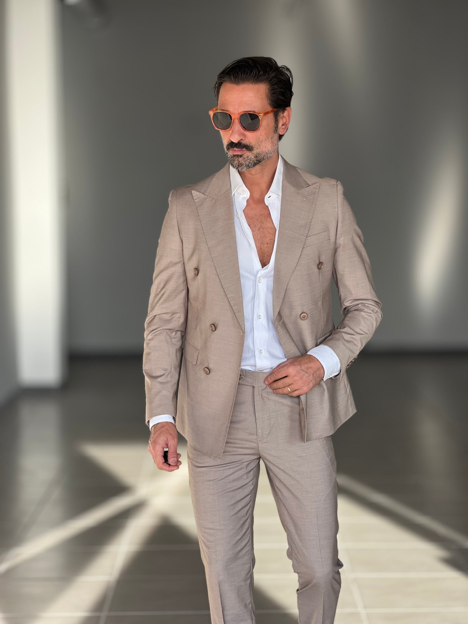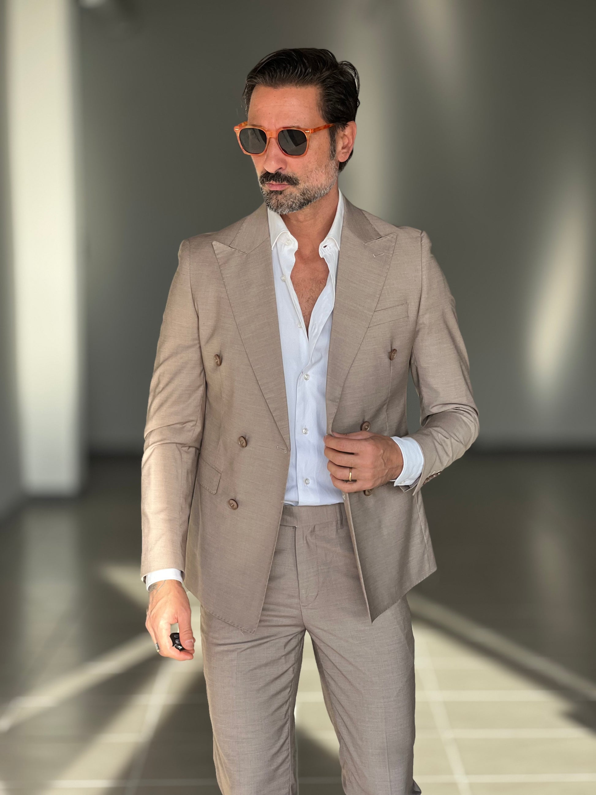 Elegant and sophisticated, this double-breasted suit combines the shine of a metal button with the fluidity of viscose and blended fabrics. The double buttoning accentuates the silhouette, ensuring a confident and professional fit. Perfect for those seeking a versatile piece, capable of accompanying both formal and more sophisticated occasions with style and comfort.