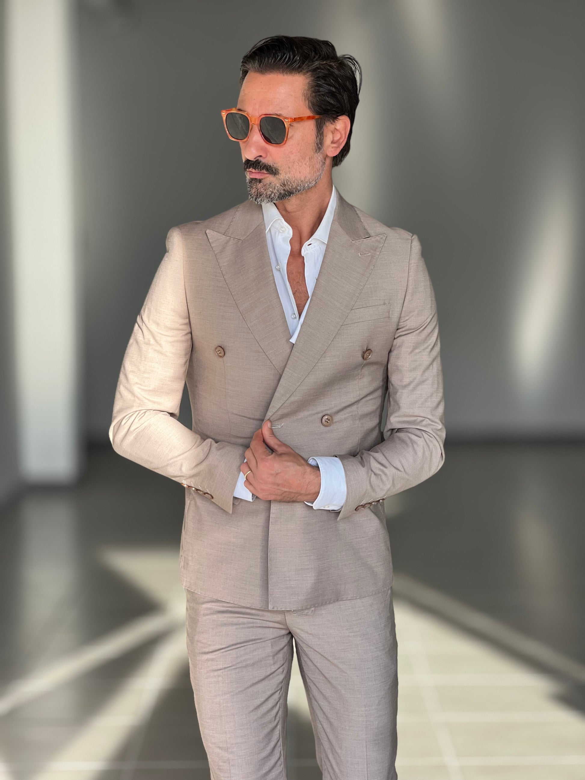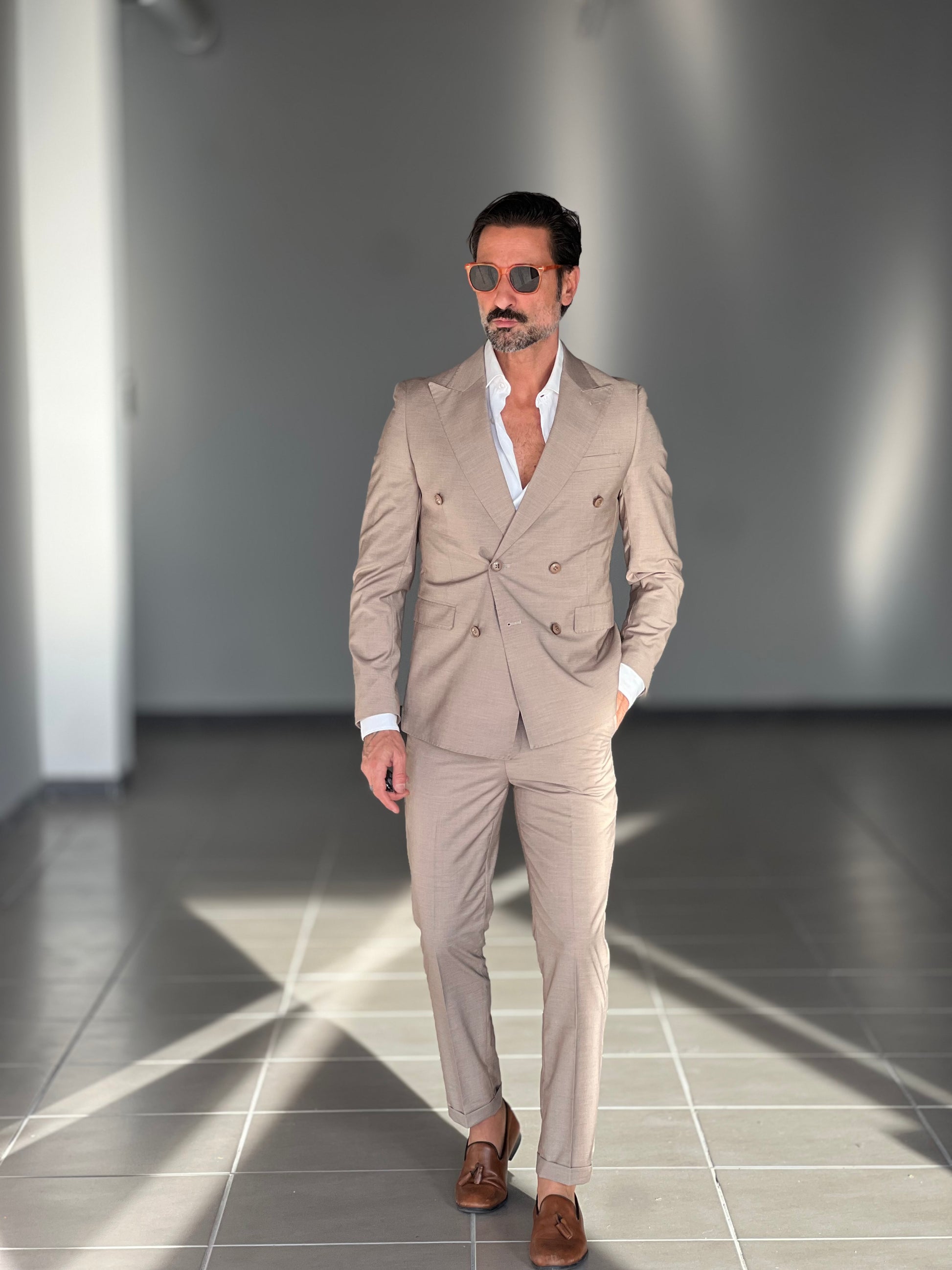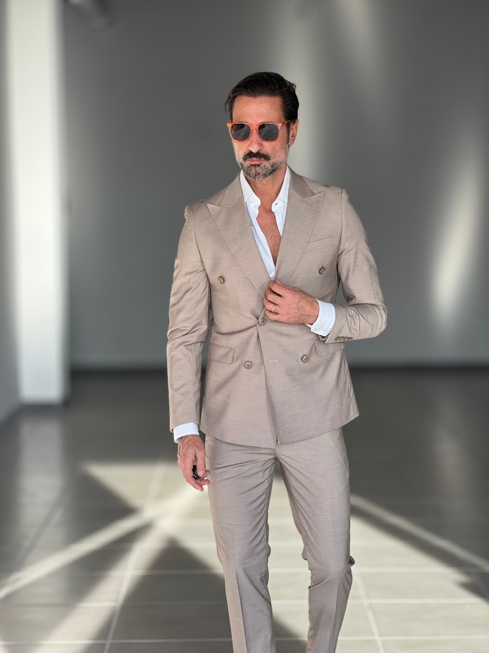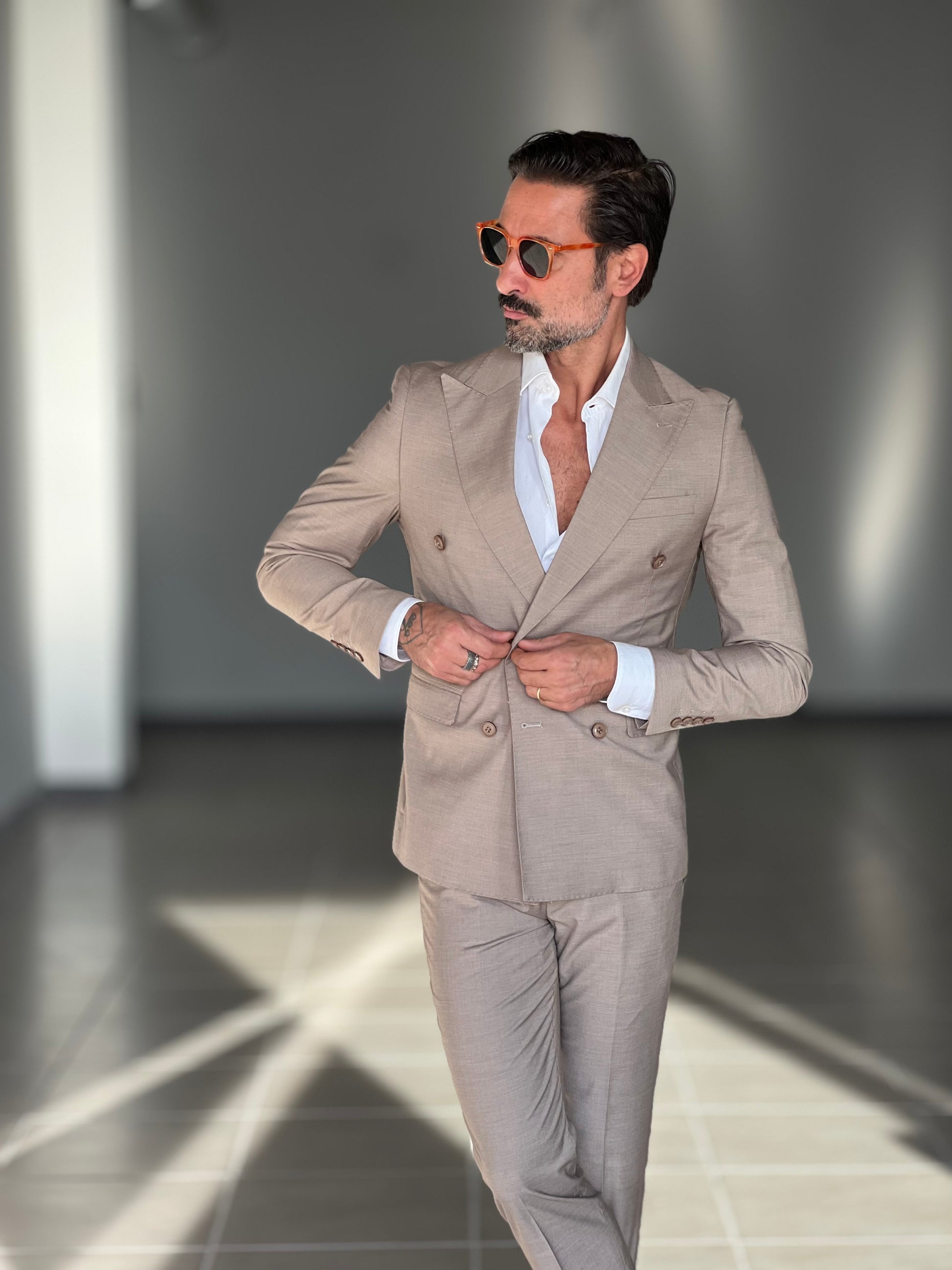 Elegant and sophisticated, this double-breasted suit combines the shine of a metal button with the fluidity of viscose and blended fabrics. The double buttoning accentuates the silhouette, ensuring a confident and professional fit. Perfect for those seeking a versatile piece, capable of accompanying both formal and more sophisticated occasions with style and comfort.