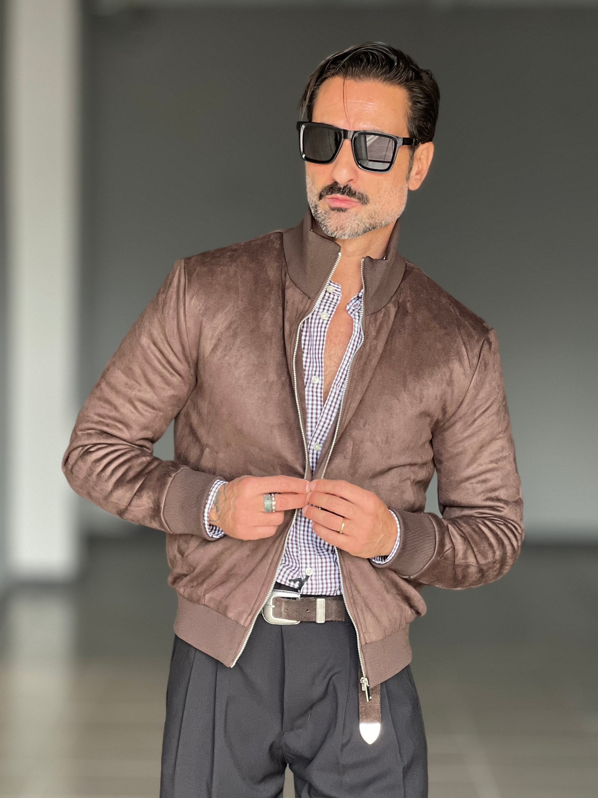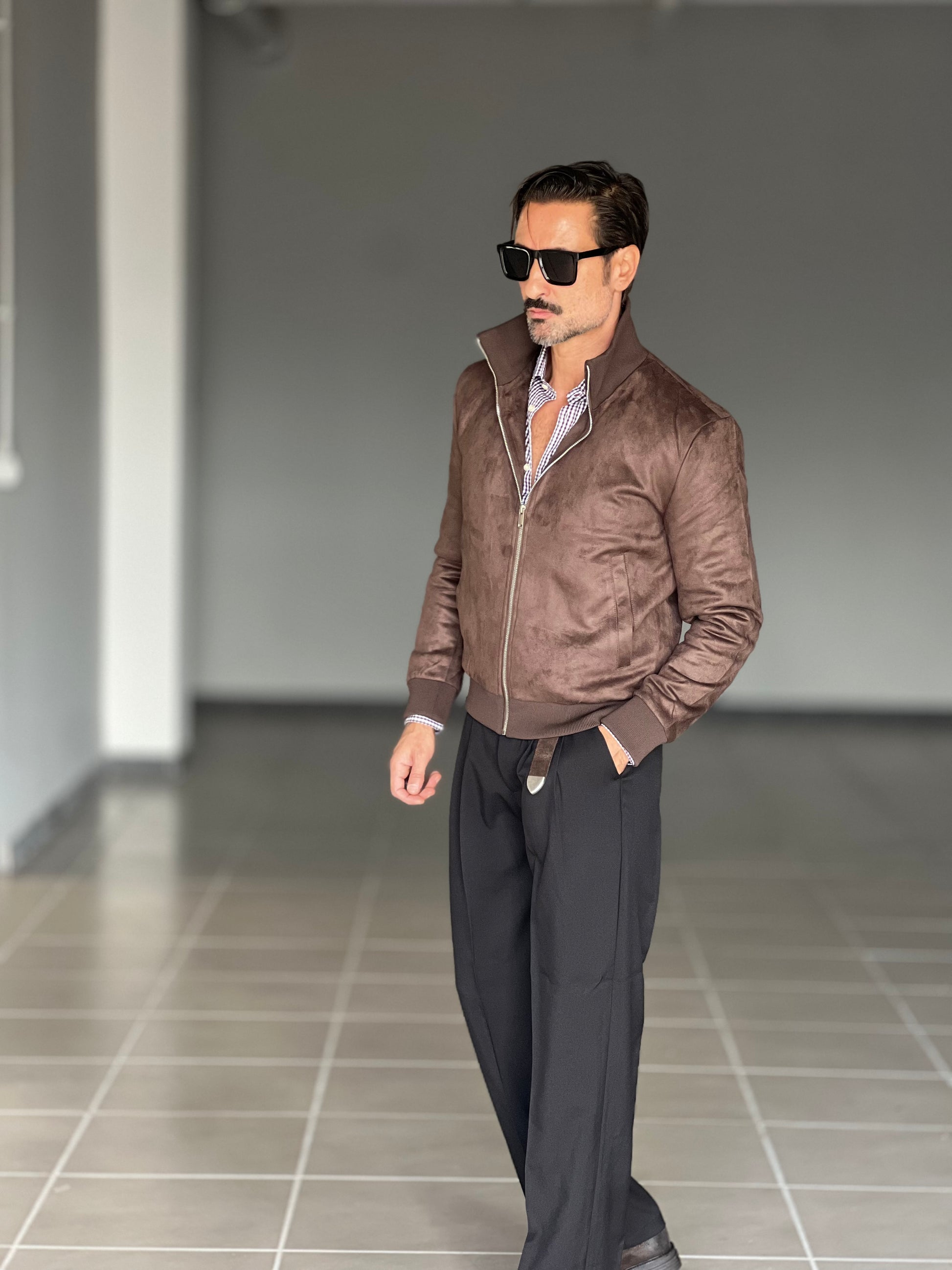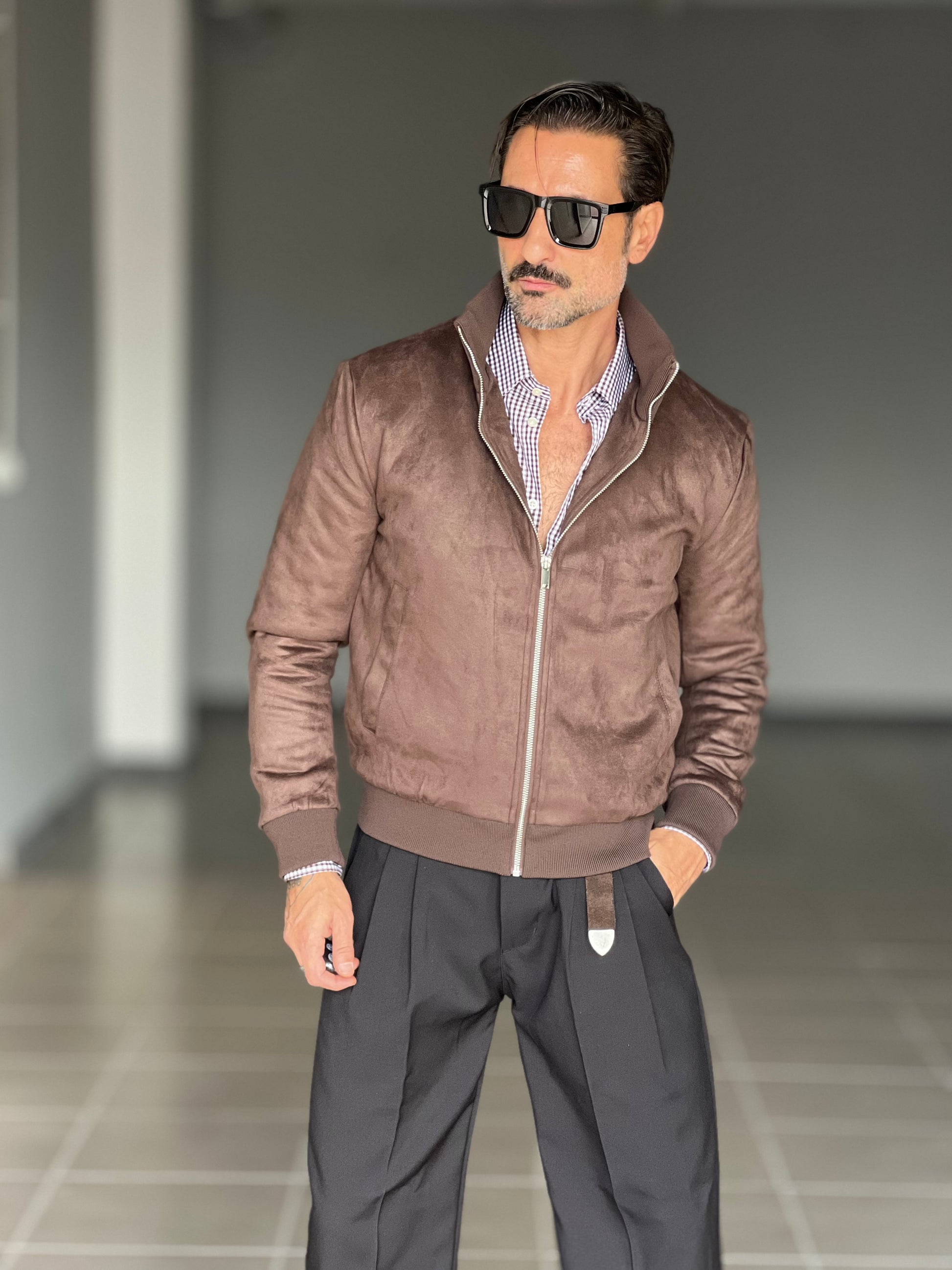 This bomber jacket features innovative double zips for adjustable fit and enhanced ventilation. Crafted from eco-friendly suede, it offers both durability and a refined look while supporting sustainable fashion. Its sleek design and functional details make it a versatile choice for modern wardrobes seeking style and environmental responsibility.