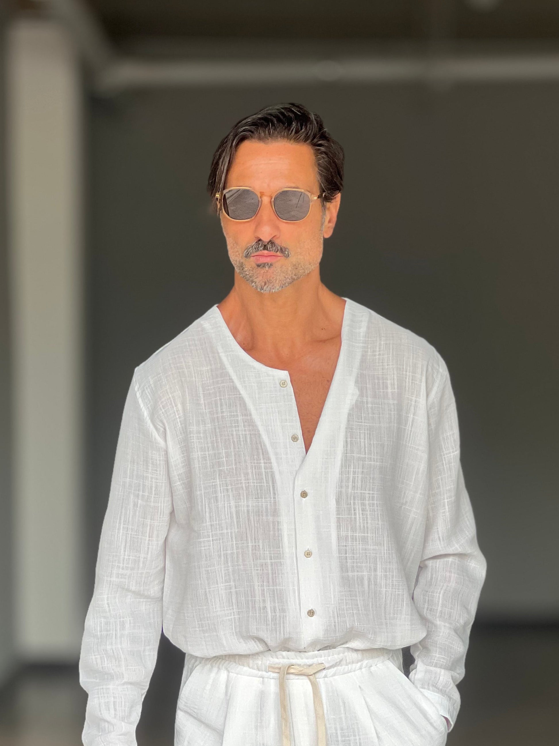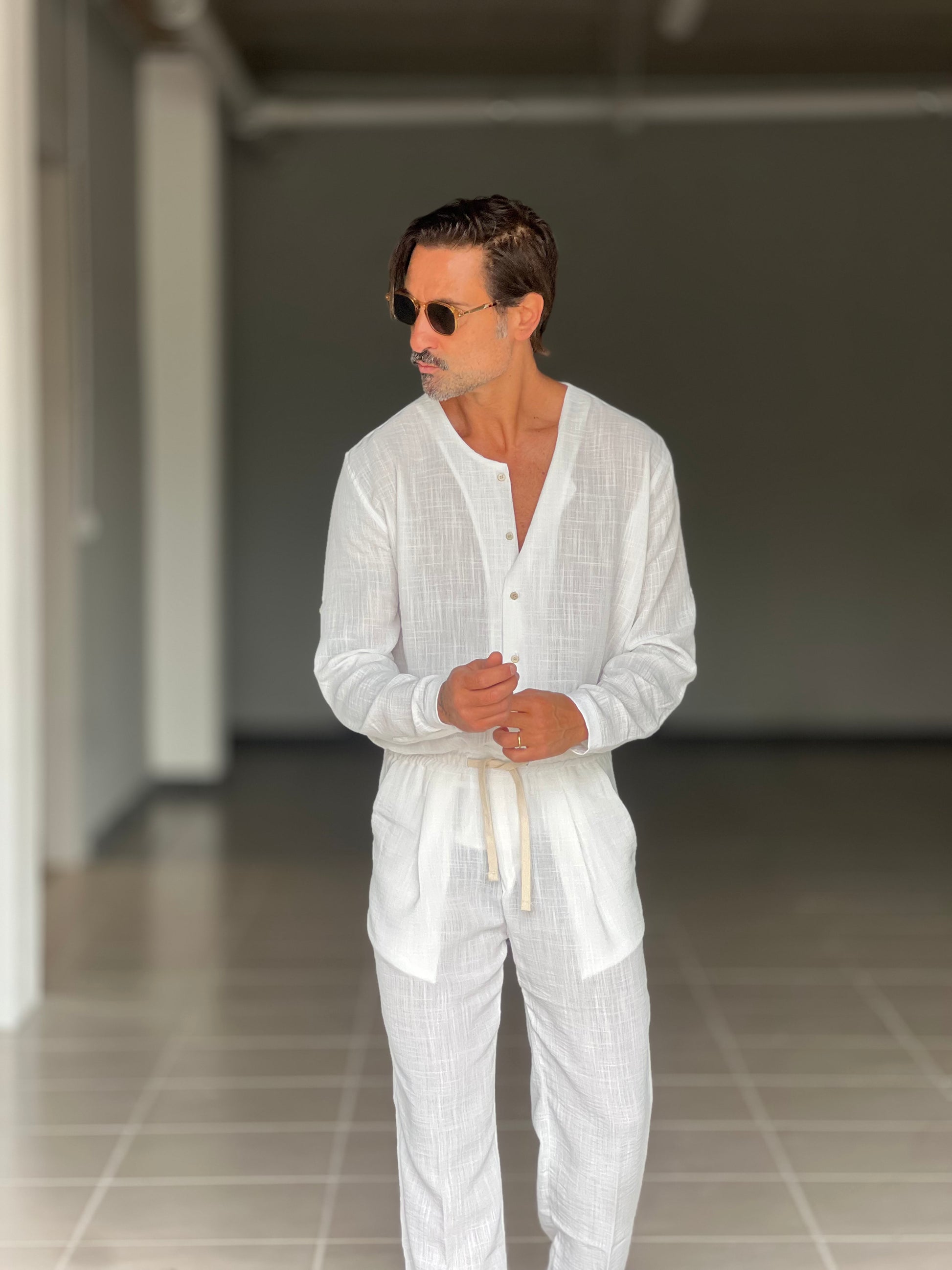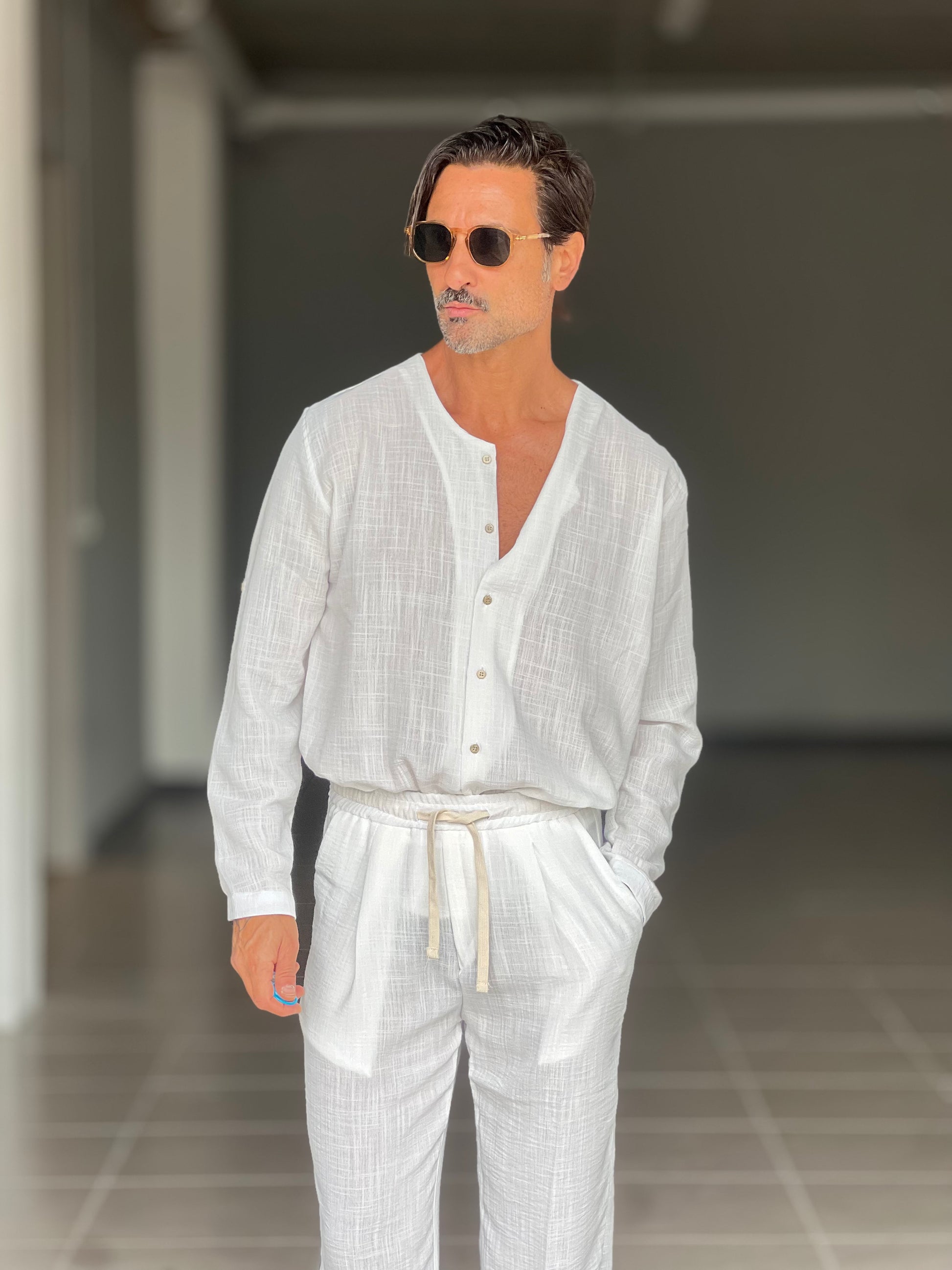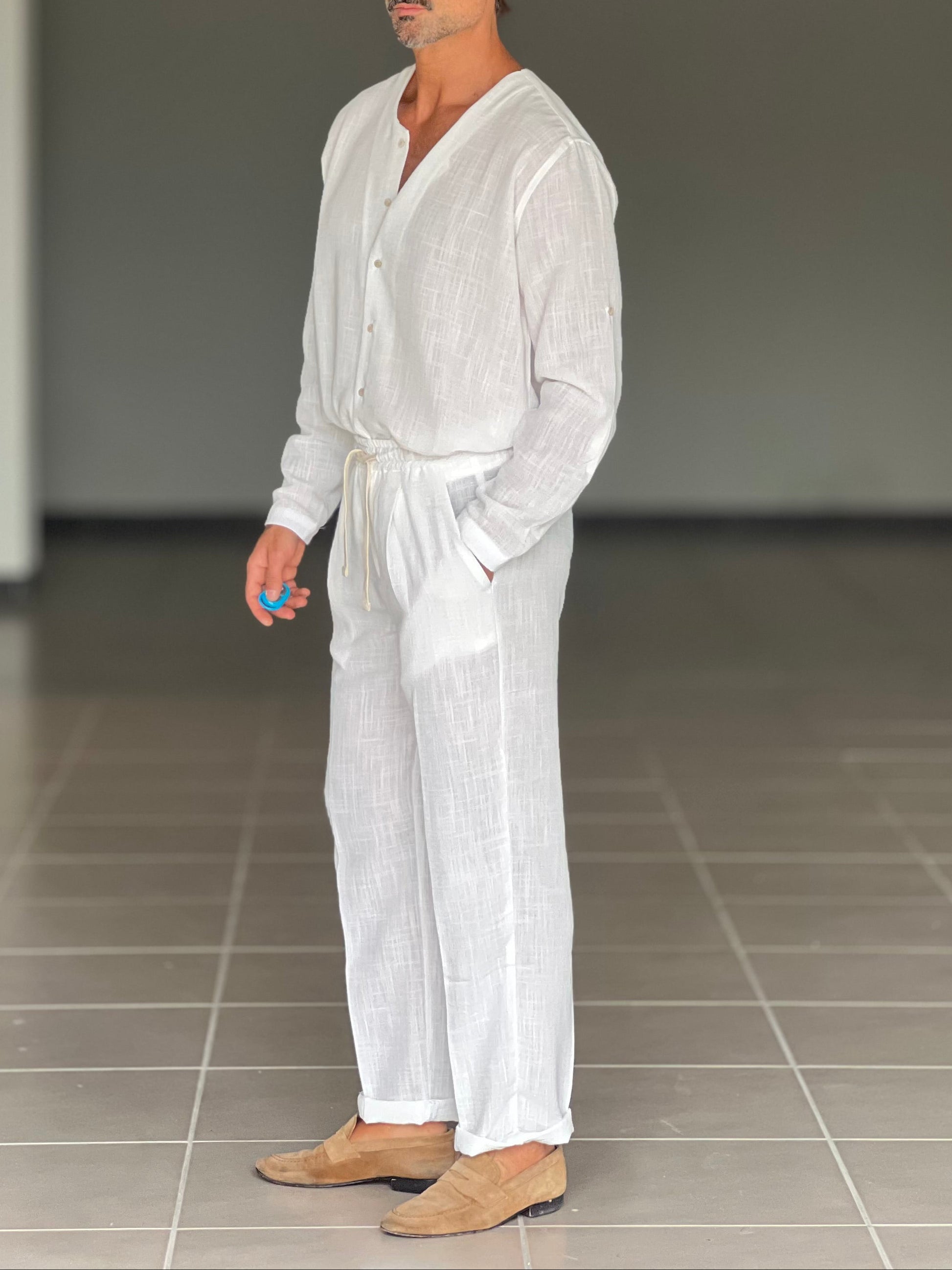 COORDINATO CAMICIA PANTALACCIO BIANCO COREANA GIROCOLLO COTENE VISCOSA EFFETTO LINO. 00201