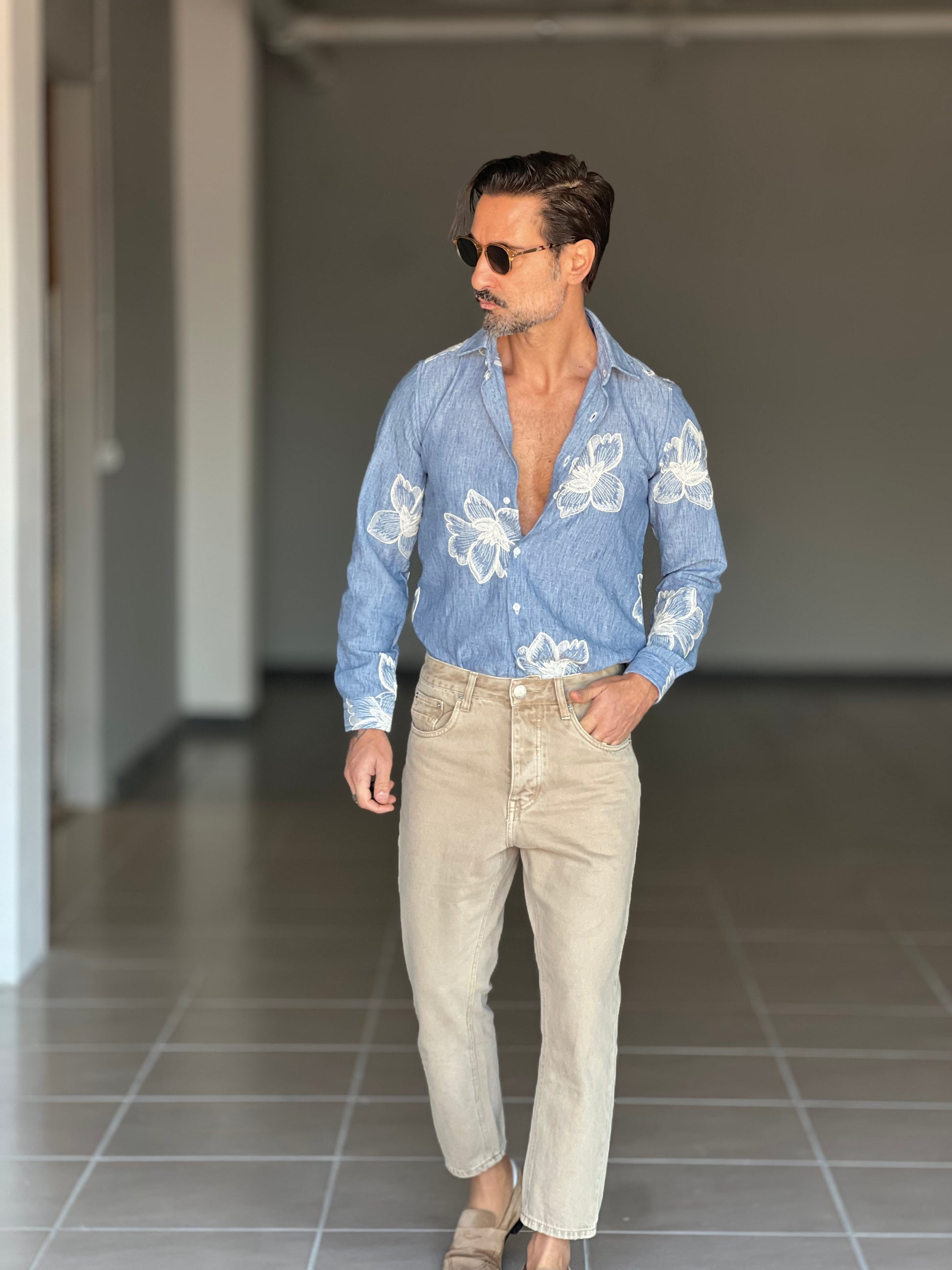 CAMICIA CELESTE FANTASIA KENIA IN COTONE FIAMMATO RICAMATA