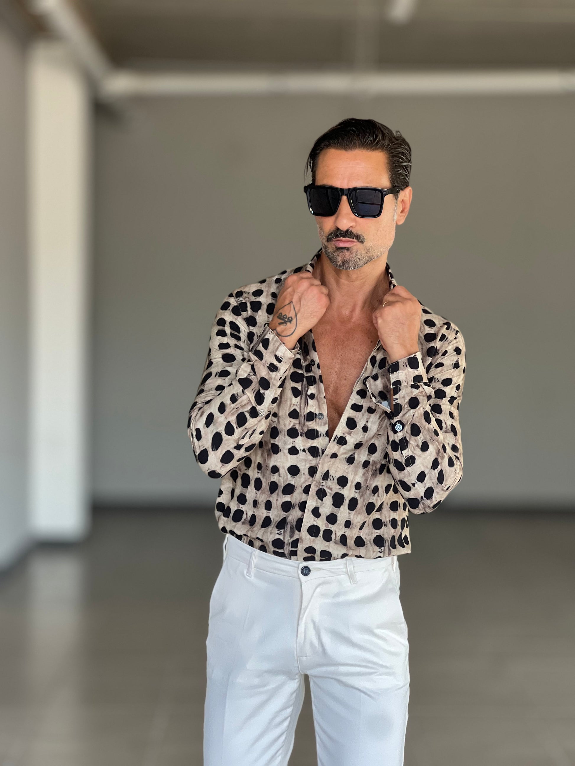 CAMICIA VISCOSA FONDO CAMMELLO POIS NERO ALTATENSIONE