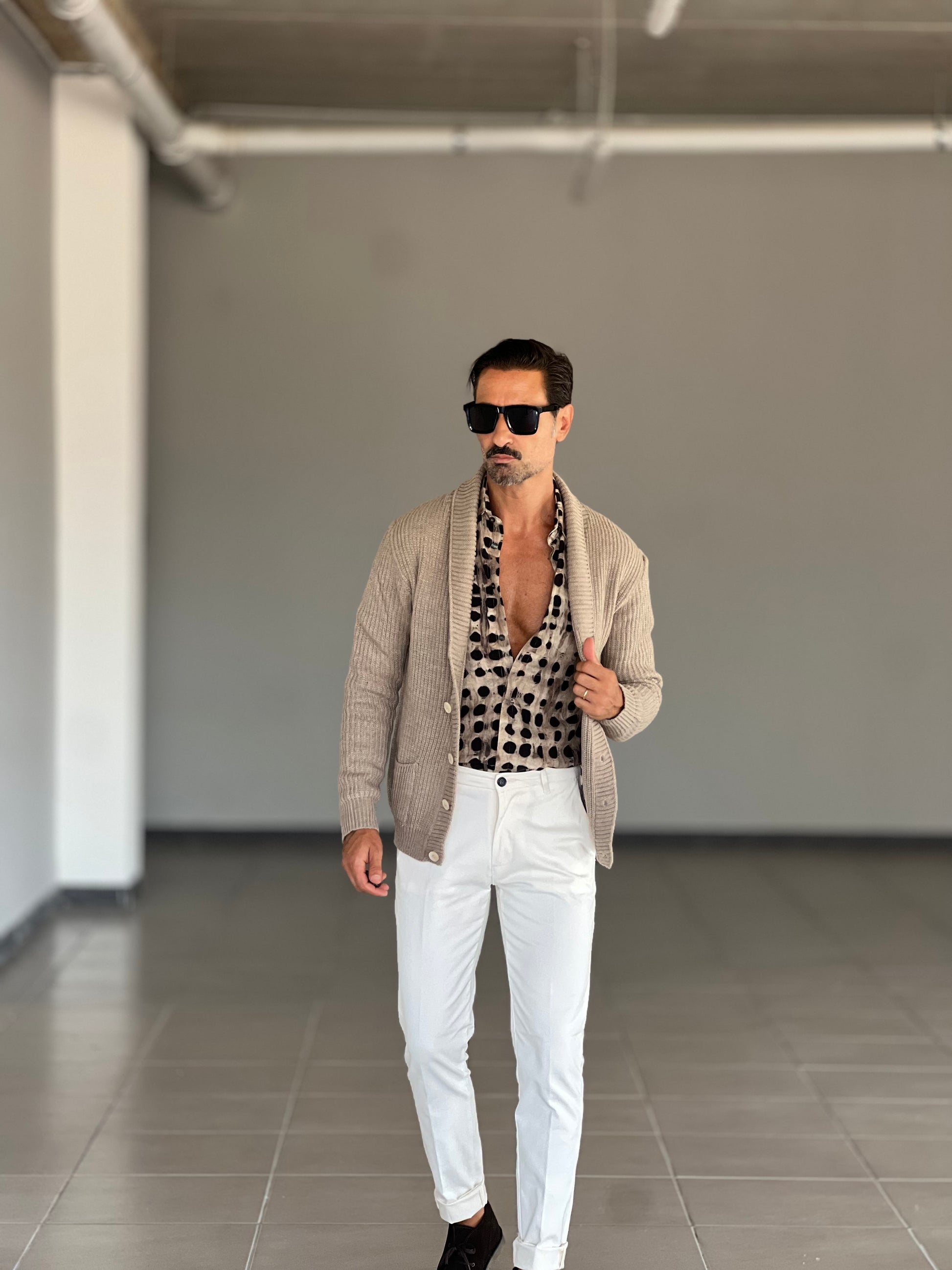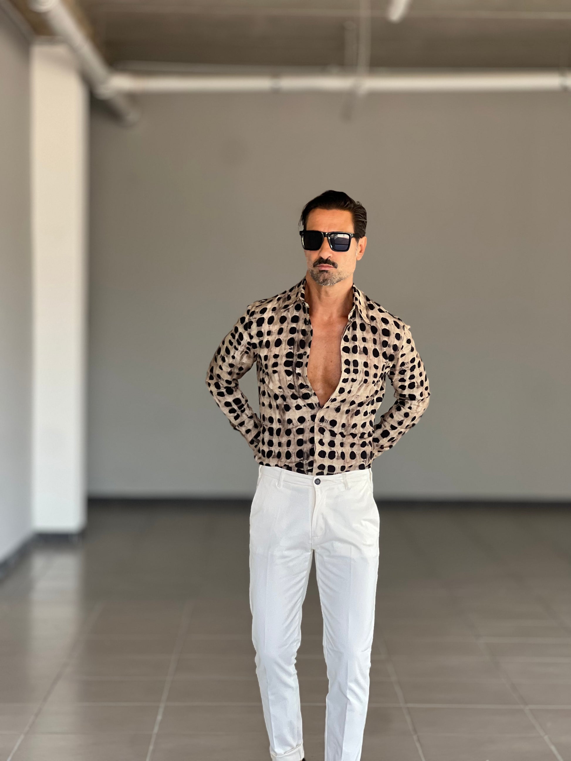 Arricchisci il tuo guardaroba con la CAMICIA VISCOSA FONDO CAMMELLO POIS NERO ALTATENSIONE. Realizzata in morbida viscosa, questa camicia offre comfort e traspirabilità eccezionali, perfetta per essere indossata tutto il giorno. L'elegante sfondo cammello punteggiato da delicati pois neri aggiunge un tocco raffinato ma giocoso a qualsiasi outfit. Ideale per look chic e disinvolti, questo capo versatile unisce stile e disinvoltura, rendendolo un must-have per chi apprezza la sobria raffinatezza.