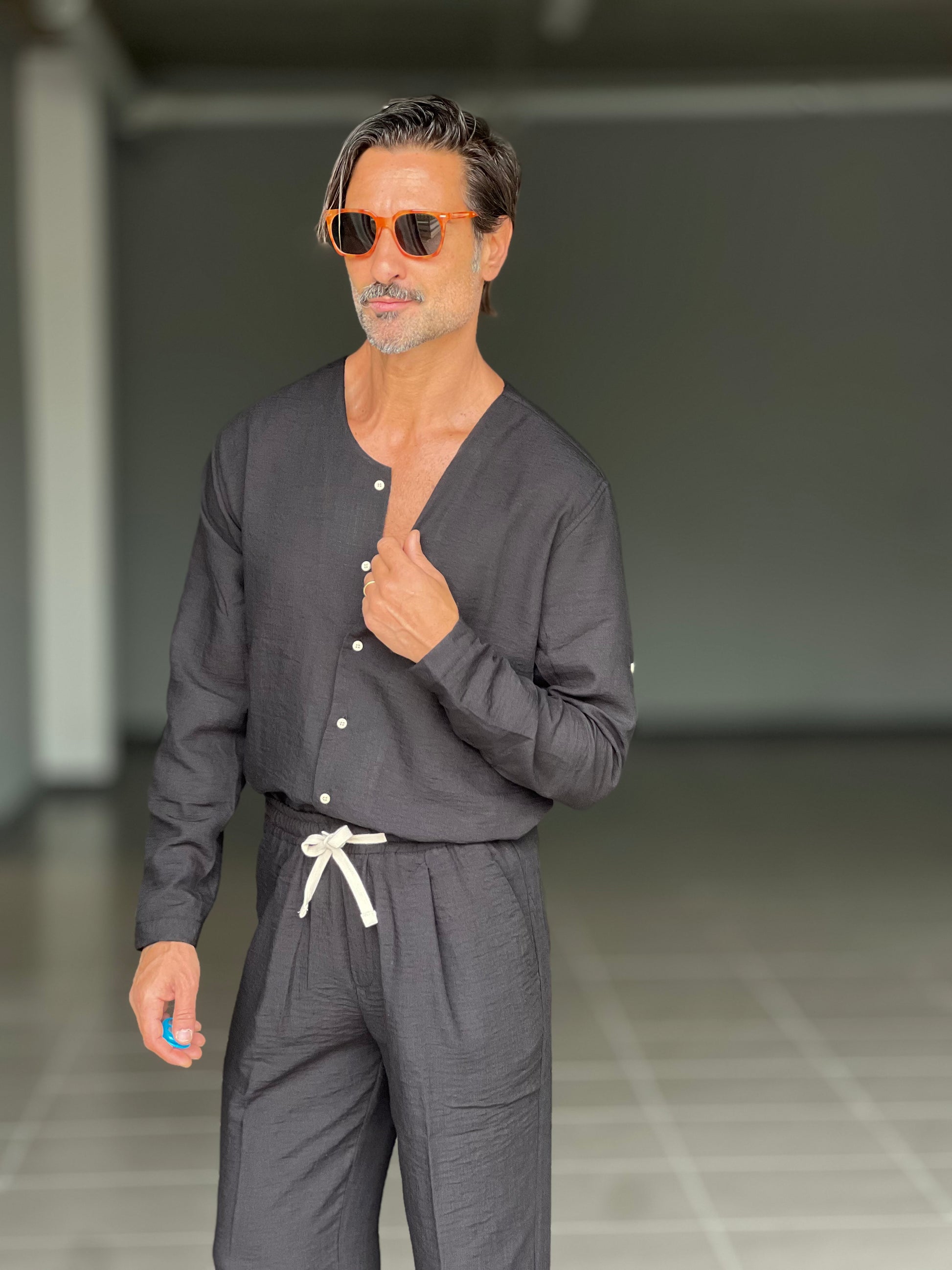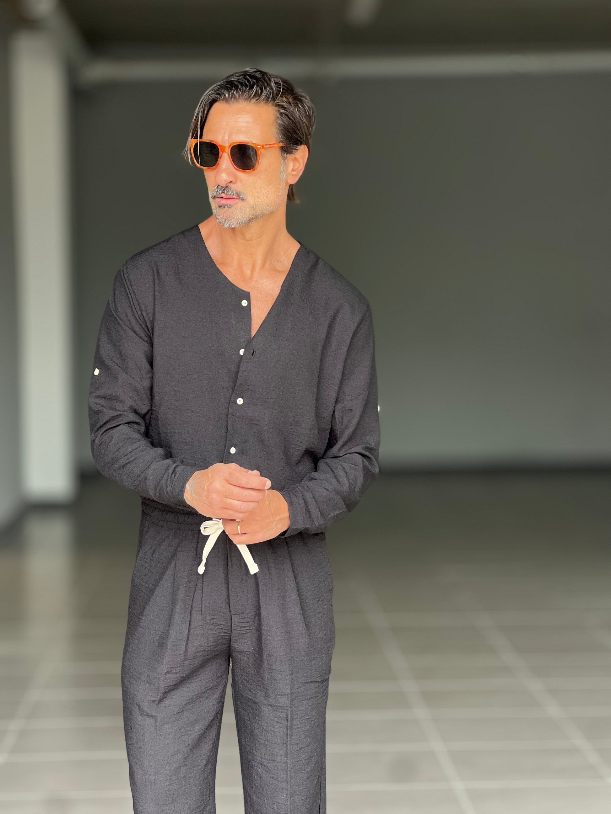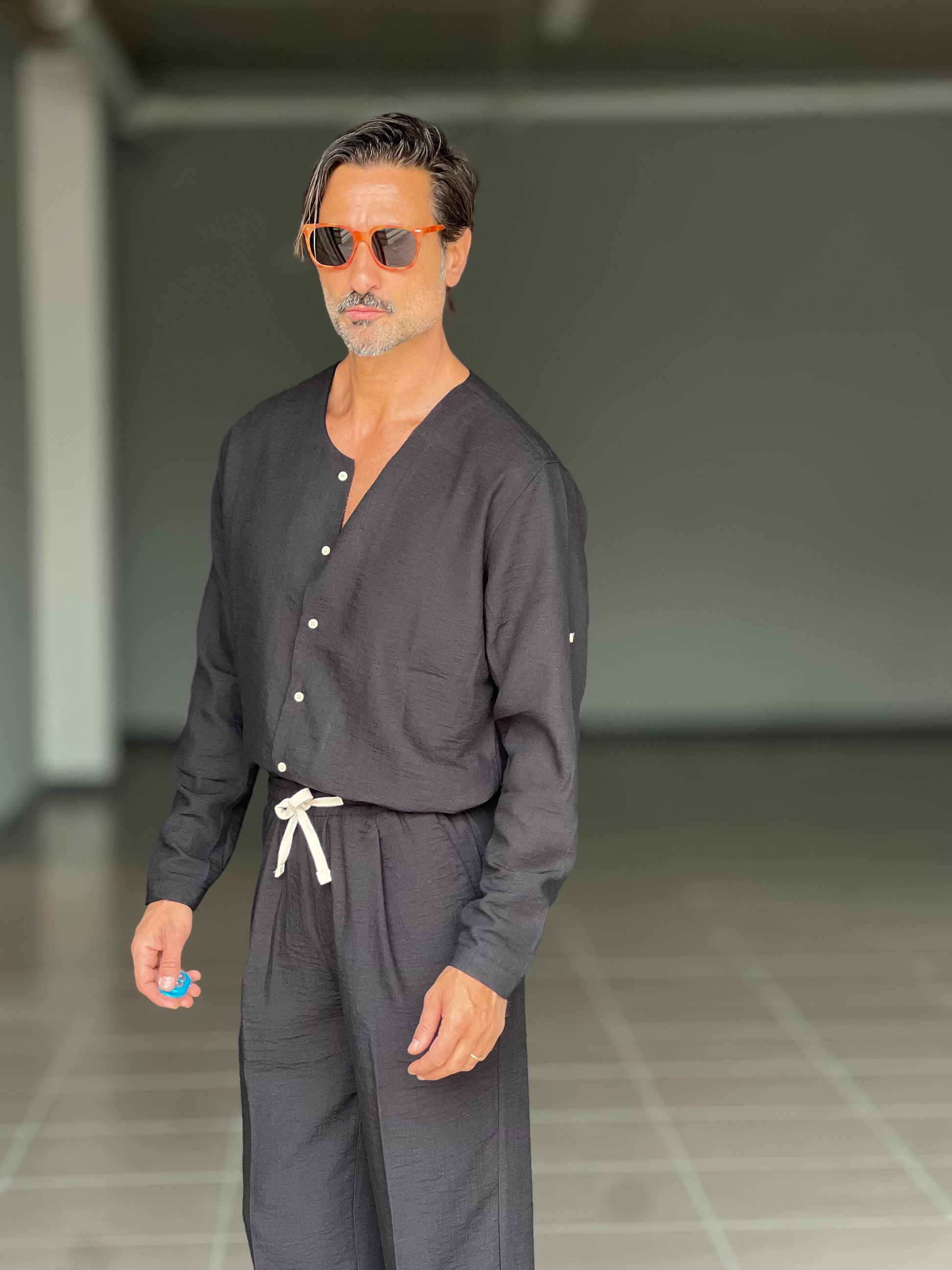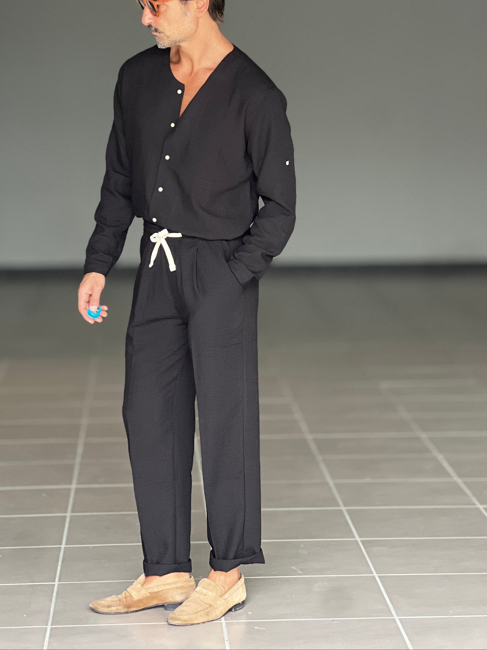 COORDINATO CAMICIA E PANTALACCIO NERA COREANA GIROCOLLO COTENE VISCOSA EFFETTO LINO. 00201