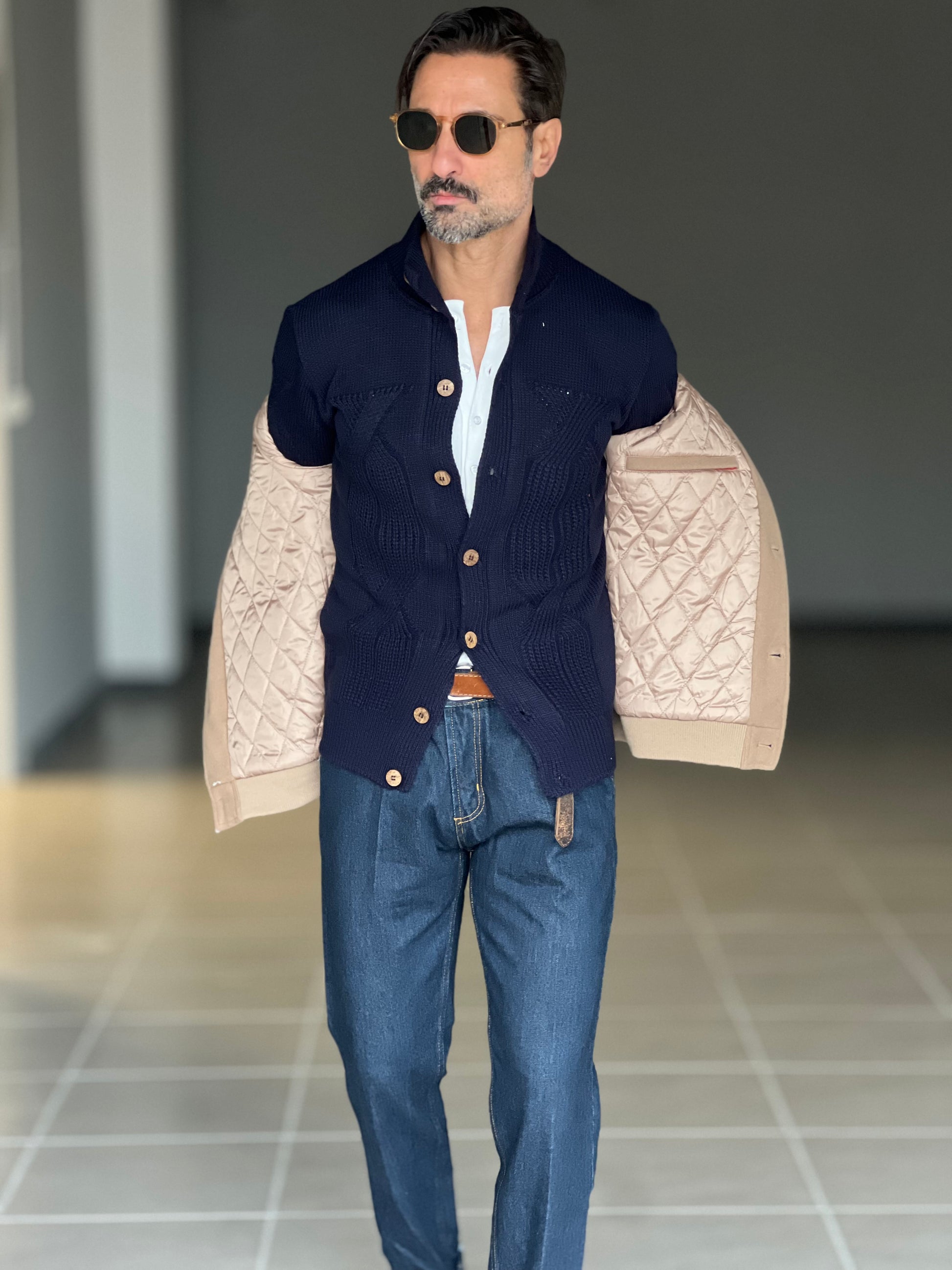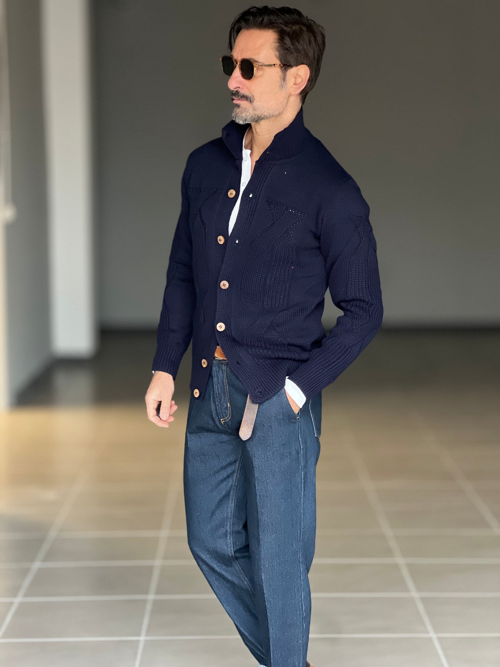 # CARDIGAN BLU OPERATO COLLO IN PIEDI Elegante cardigan in tonalità blu operato, caratterizzato da un distintivo collo in piedi che conferisce un'estetica moderna e sofisticata. La costruzione attenta ai dettagli e la scelta dei materiali garantiscono comfort e durabilità nel tempo. Perfetto per composizioni versatili, si adatta sia a look casual che a outfit più ricercati. Un pezzo essenziale per chi ricerca qualità e stile senza compromessi nella propria guardaroba.