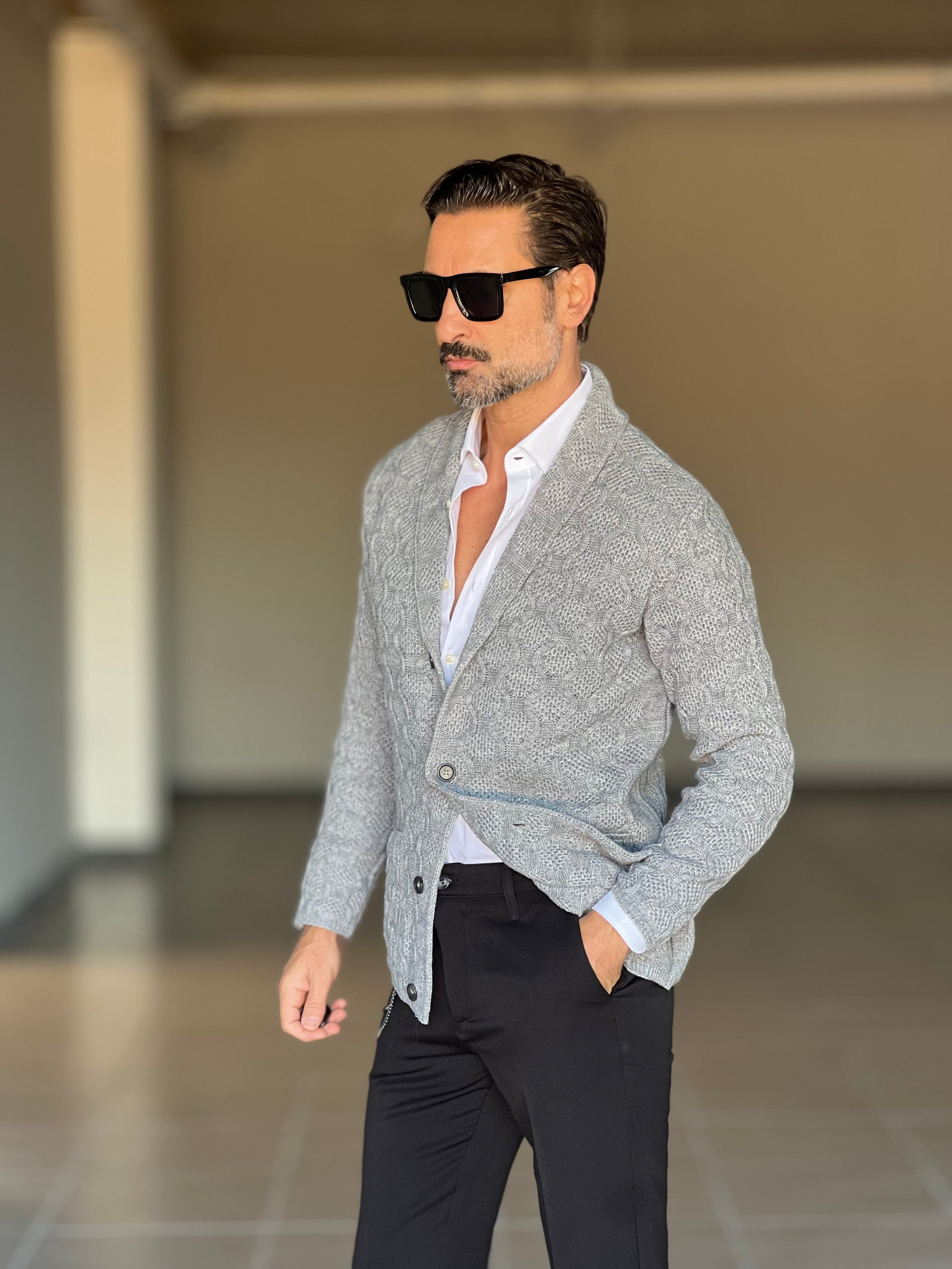 CARDIGAN GIACCA GRIGIO LAVORAZIONE A RILIEVO Questo cardigan giacca in grigio rappresenta un capo versatile e sofisticato, caratterizzato da una lavorazione a rilievo che conferisce profondità e texture al tessuto. La costruzione strutturata lo rende ideale sia per composizioni casual che semi-formali, adattandosi facilmente a diversi contesti e stagioni. La tonalità grigia neutra garantisce massima compatibilità con il resto del guardaroba, mentre la lavorazione in rilievo aggiunge un elemento di interesse visivo che lo distingue dai capi standard. Perfetto per chi ricerca qualità costruttiva e dettagli curati nel proprio abbigliamento.