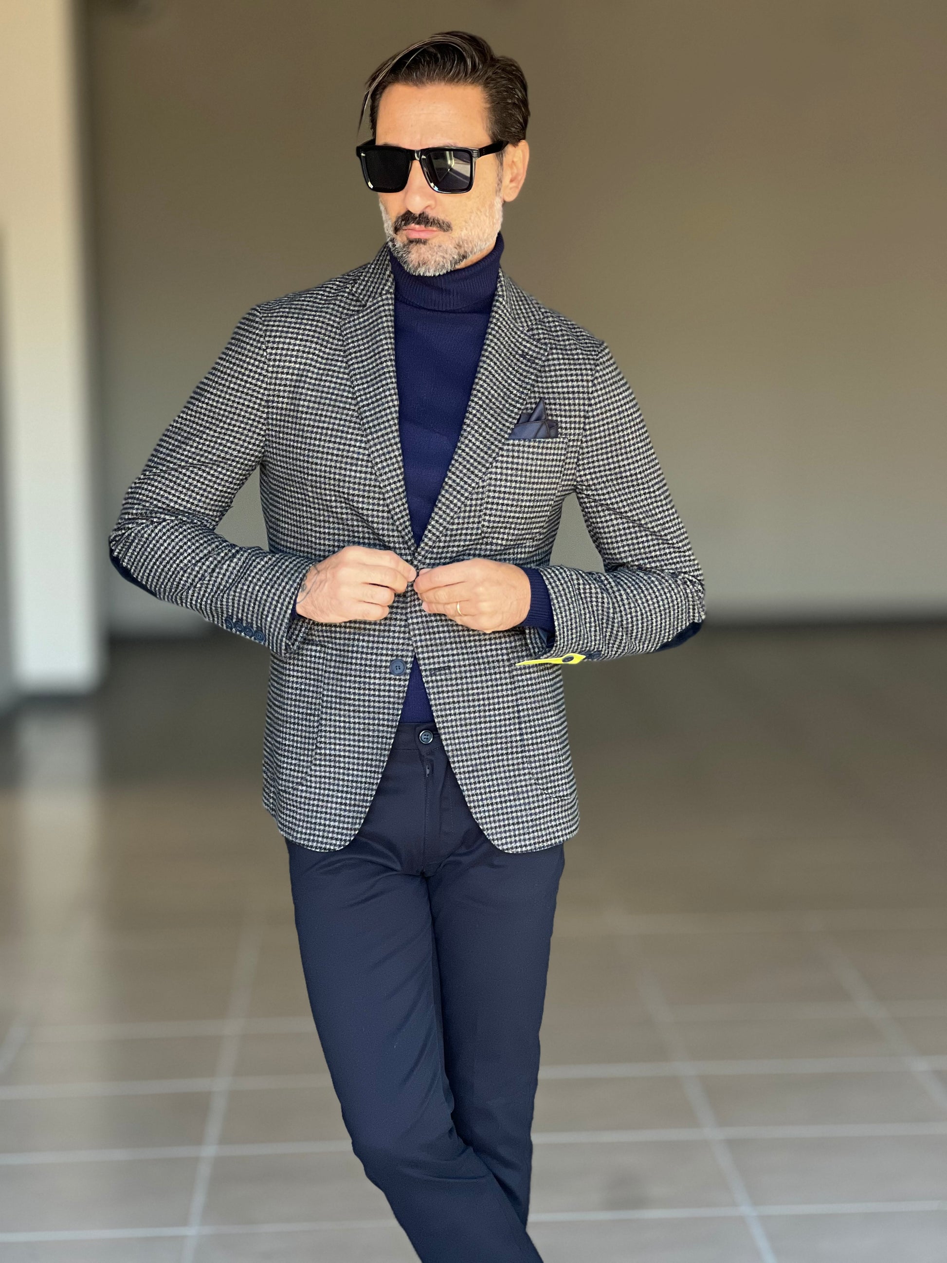 GIACCA PANNO GRIGIA MORO E BLU PIE DE POULE TOPPE AI GOMITI