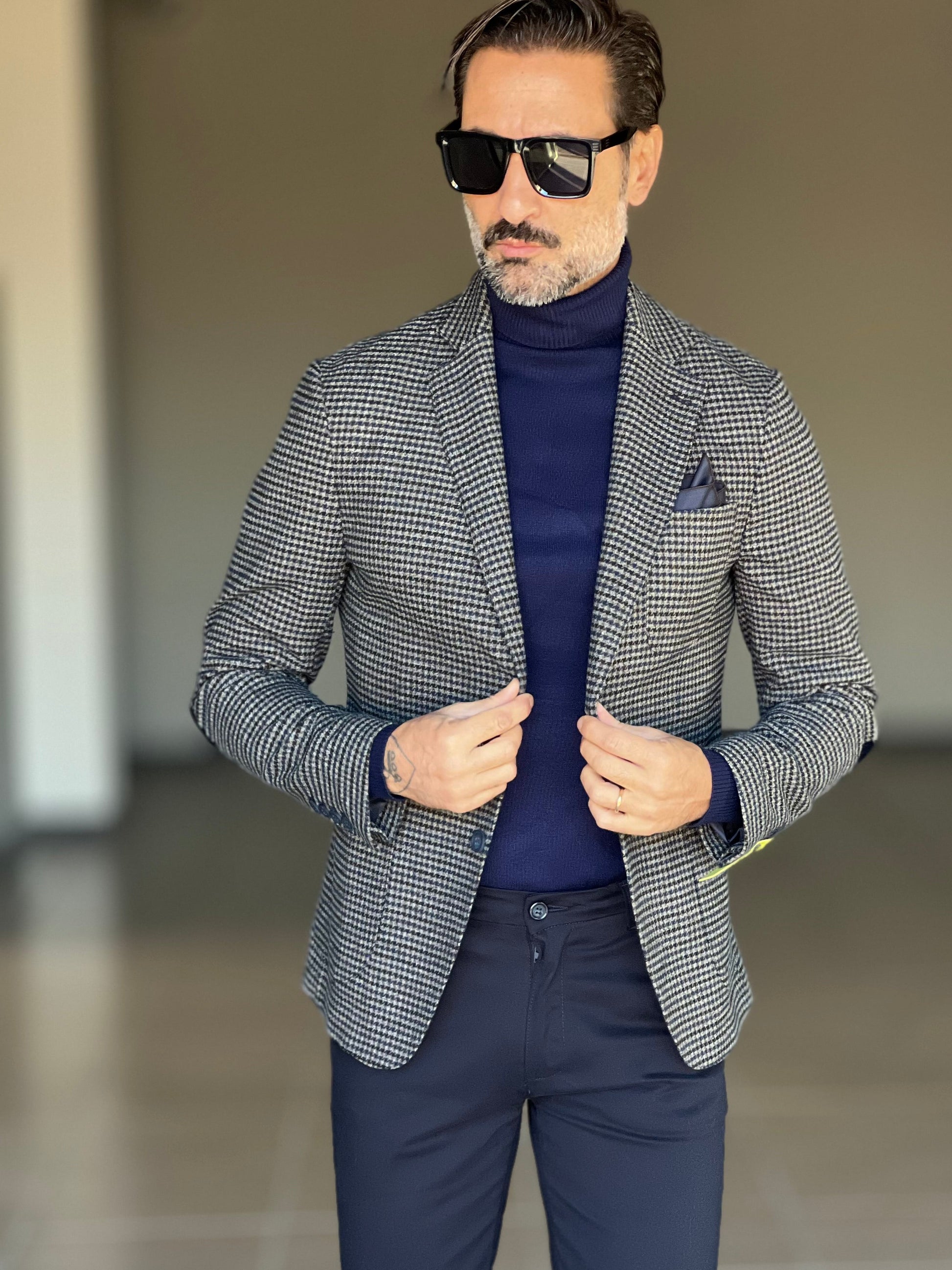 This double-breasted jacket features a refined micro houndstooth pattern in crafted from high-quality wool fabric for durability and comfort. Designed with expert tailoring, it offers a sophisticated fit that enhances your silhouette while providing warmth and style. Ideal for elevating formal and semi-formal looks with a touch of timeless elegance.