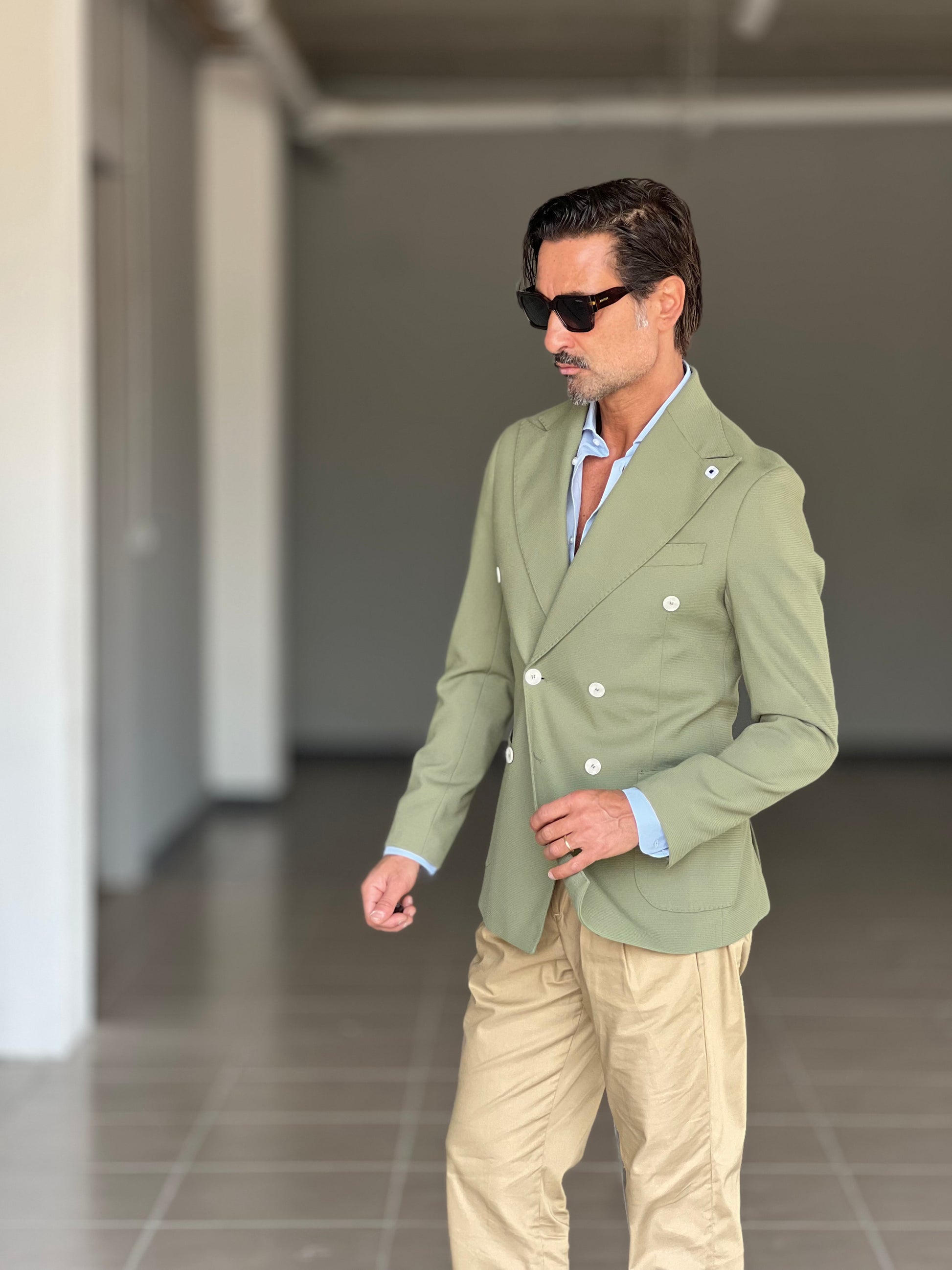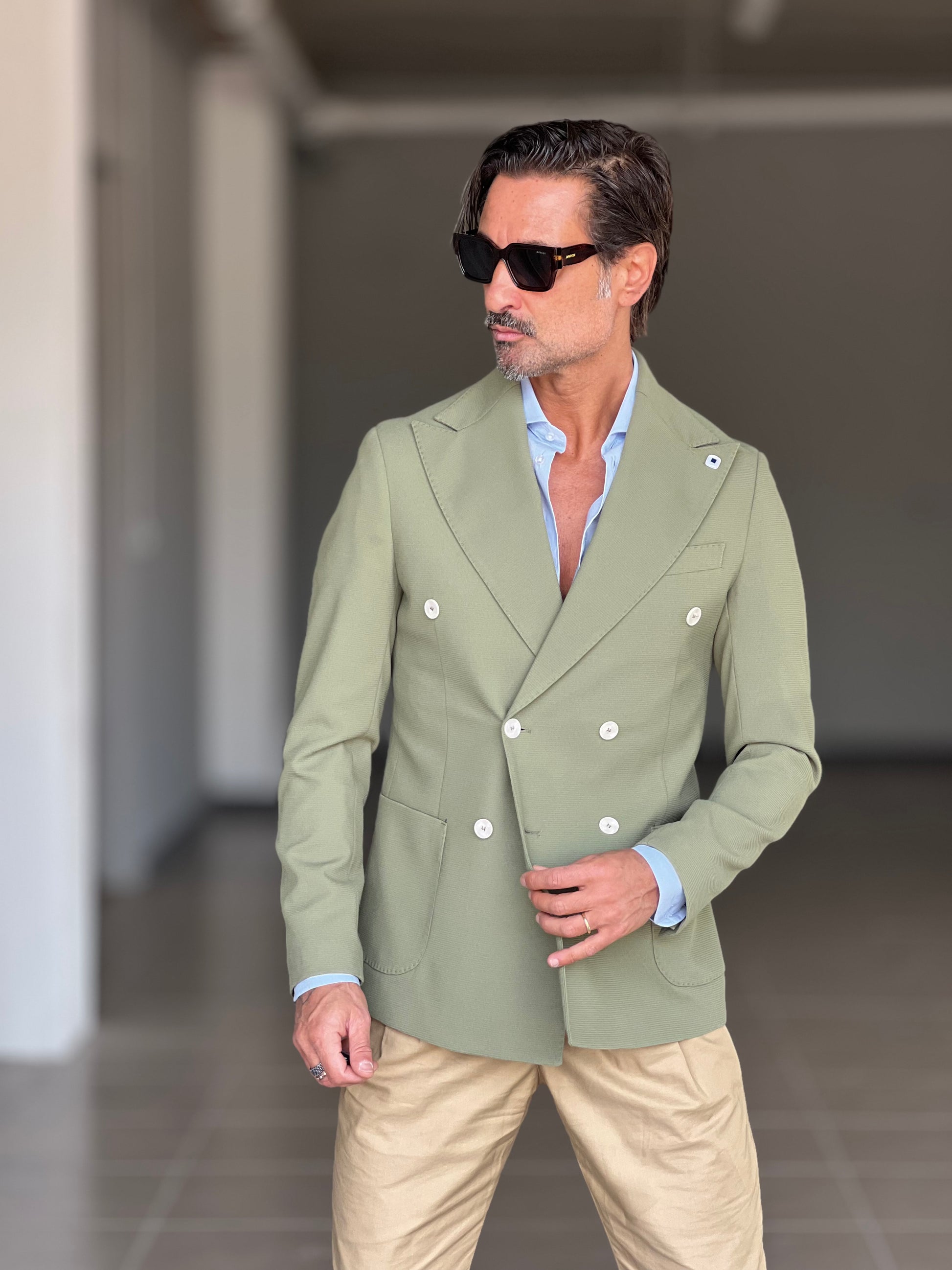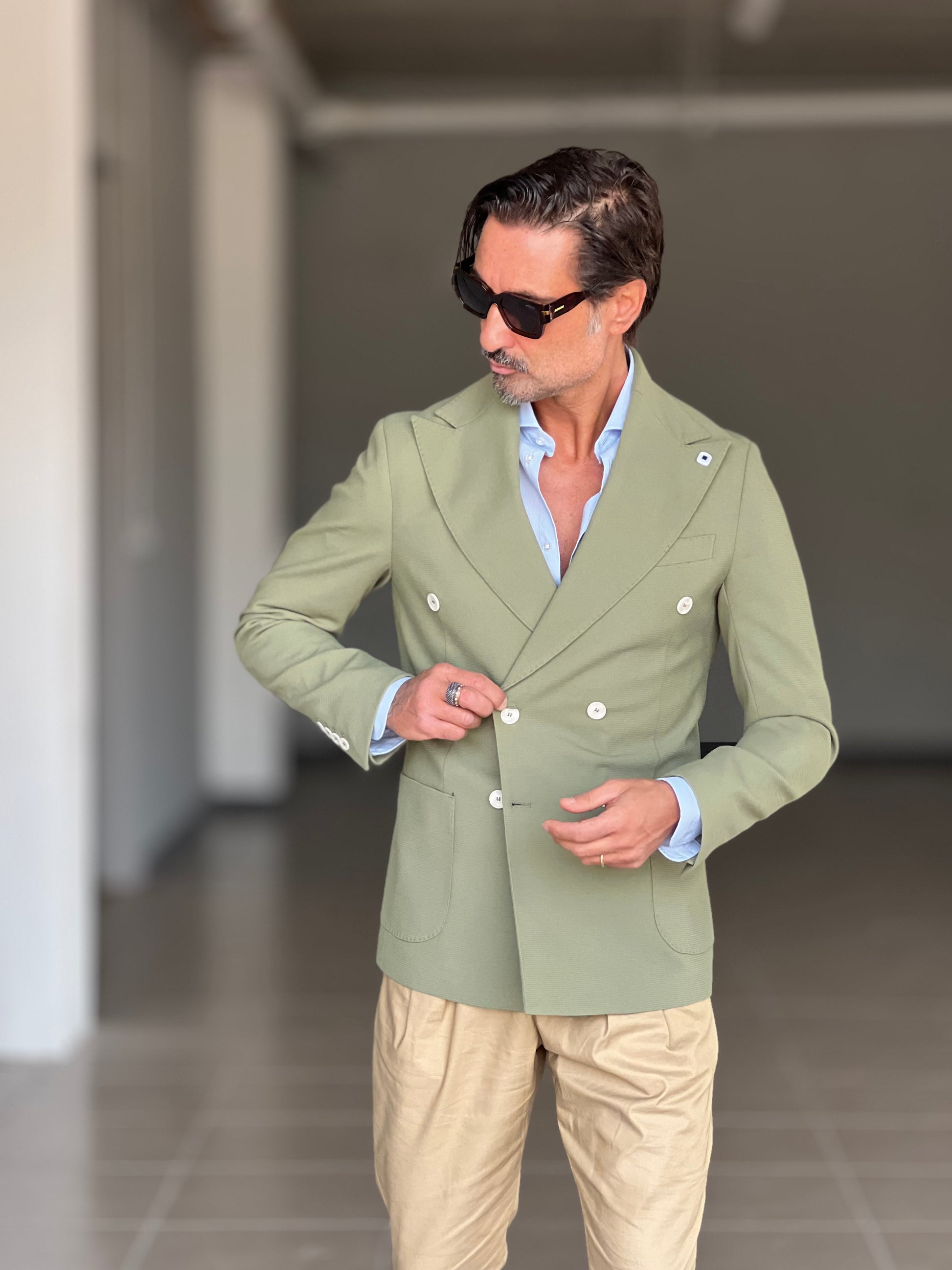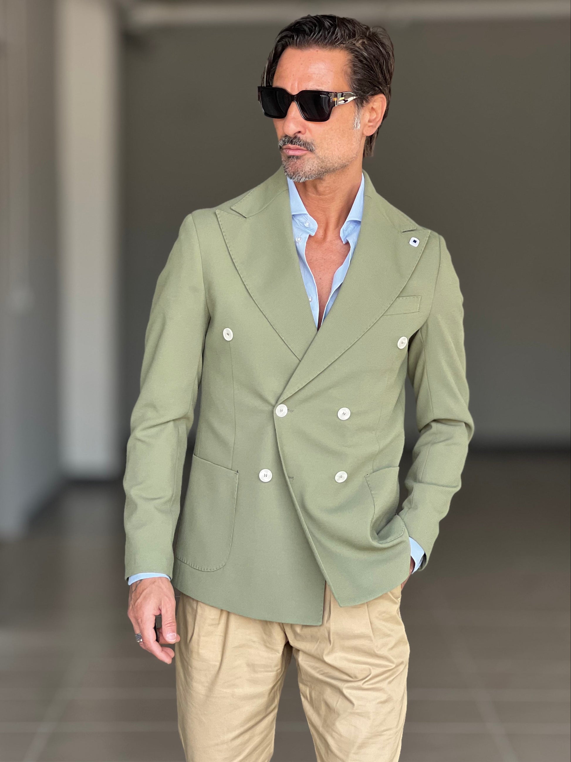 GIACCA VERDE SALVIA DOPPIOPETTO BOTTONE A CONTRASTO petro'. 0078