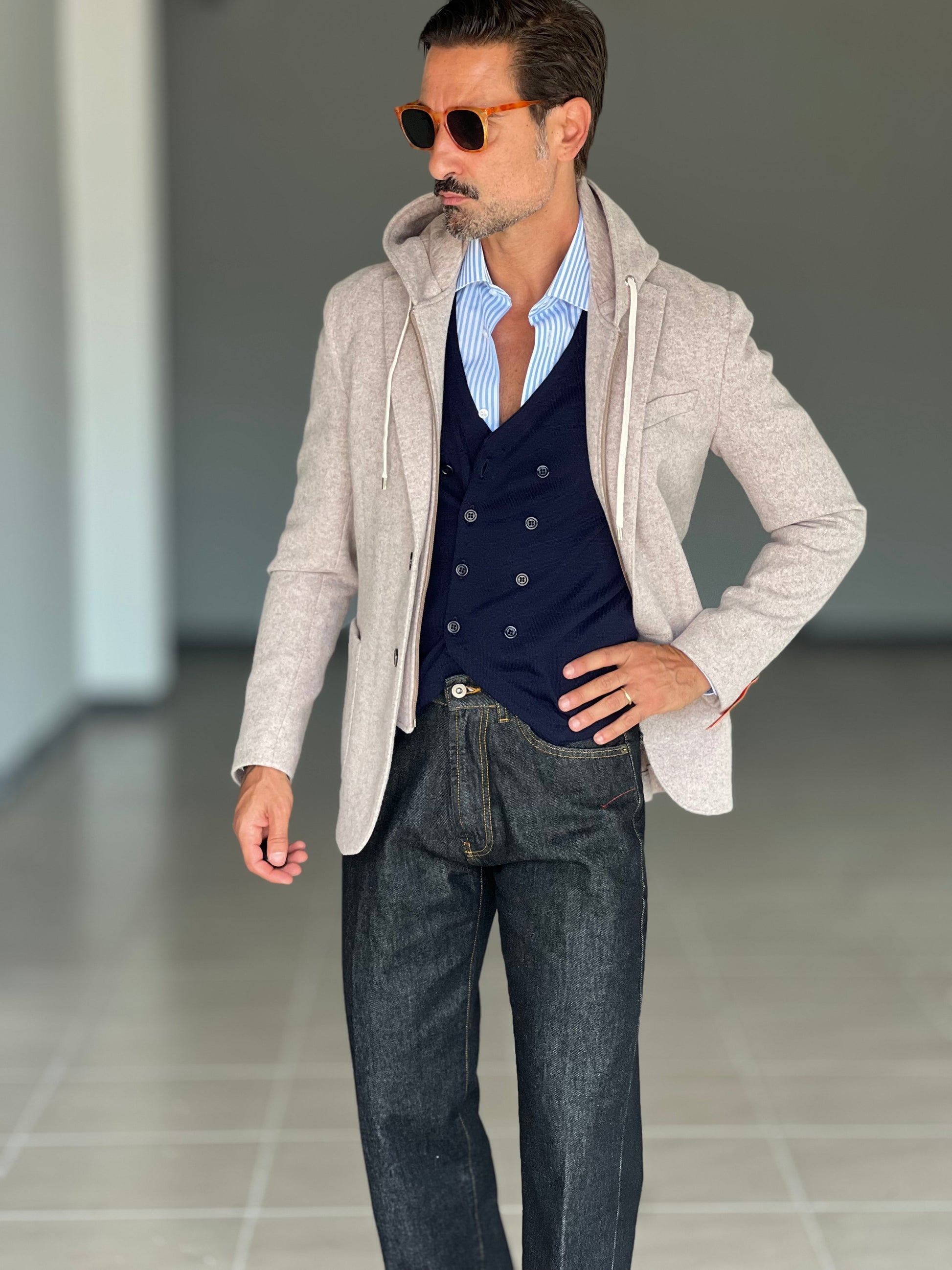 This double-breasted knitted vest combines classic tailoring with modern knitwear comfort. Crafted for a refined silhouette, it provides versatility for both formal and casual occasions. Its structured design enhances presence while offering the flexibility and softness of quality knit fabric, making it an essential layering piece for a sophisticated wardrobe.