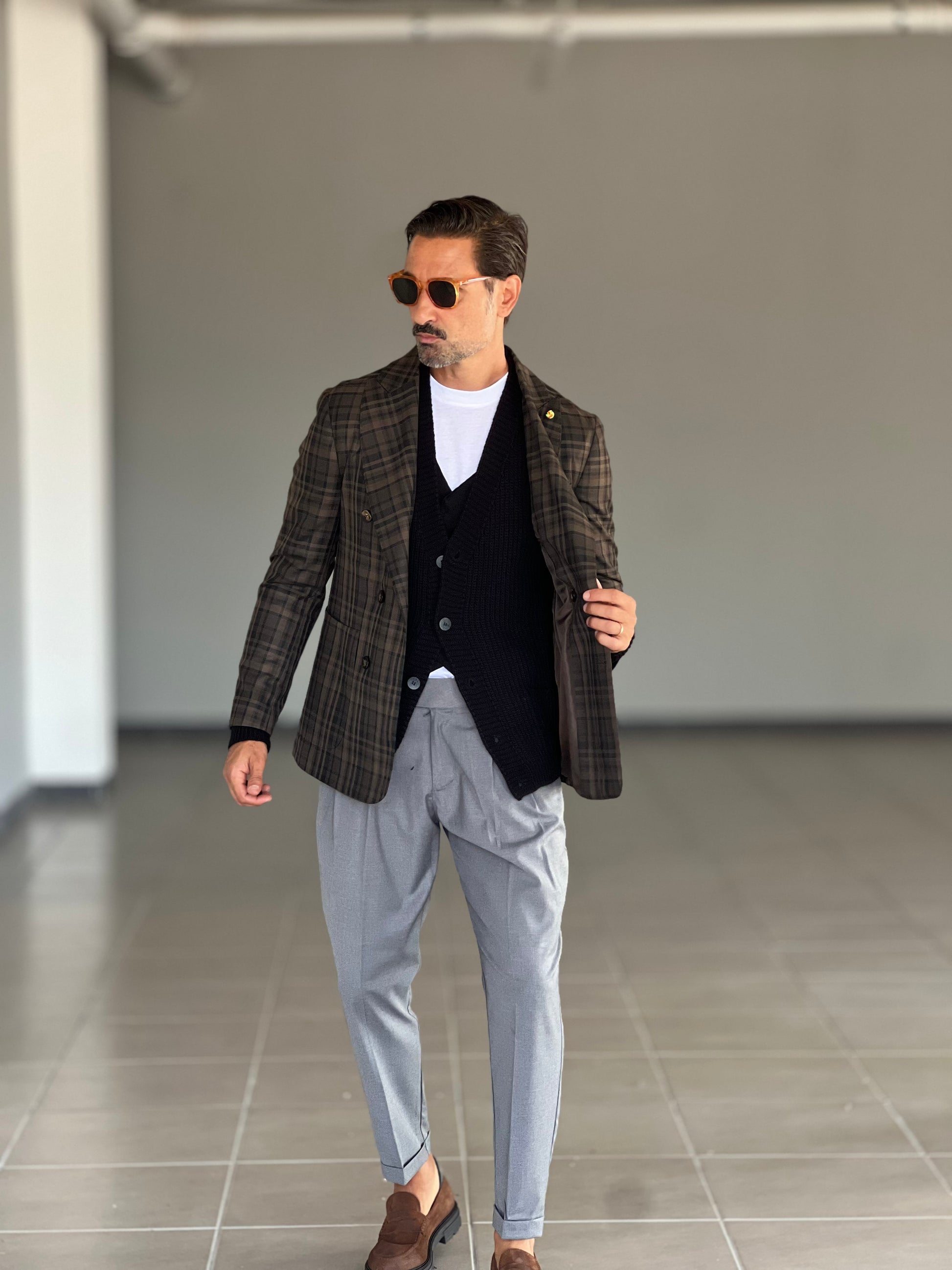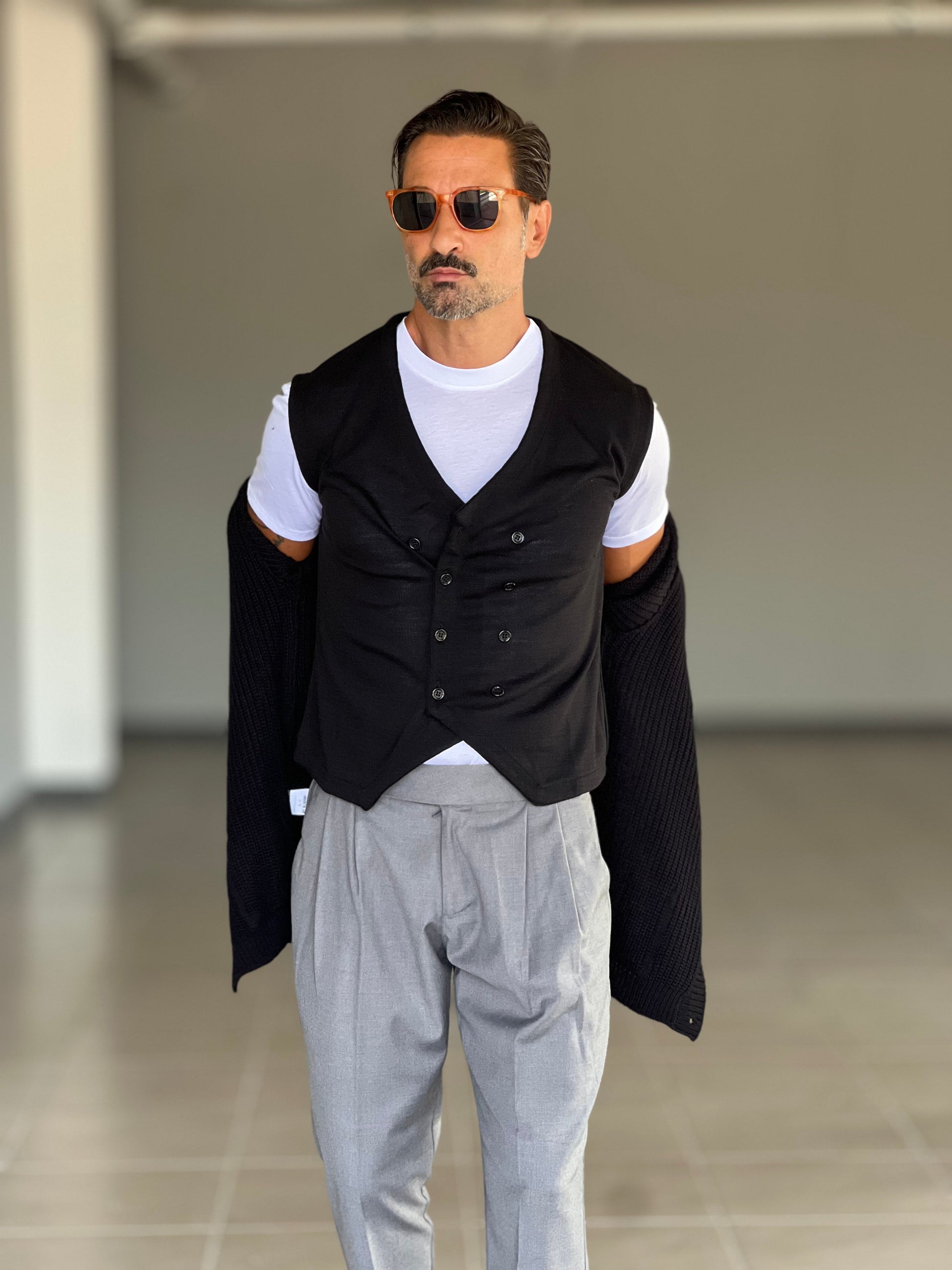 This double-breasted knitted vest combines classic tailoring with modern knitwear comfort. Crafted for a refined silhouette, it provides versatility for both formal and casual occasions. Its structured design enhances presence while offering the flexibility and softness of quality knit fabric, making it an essential layering piece for a sophisticated wardrobe.