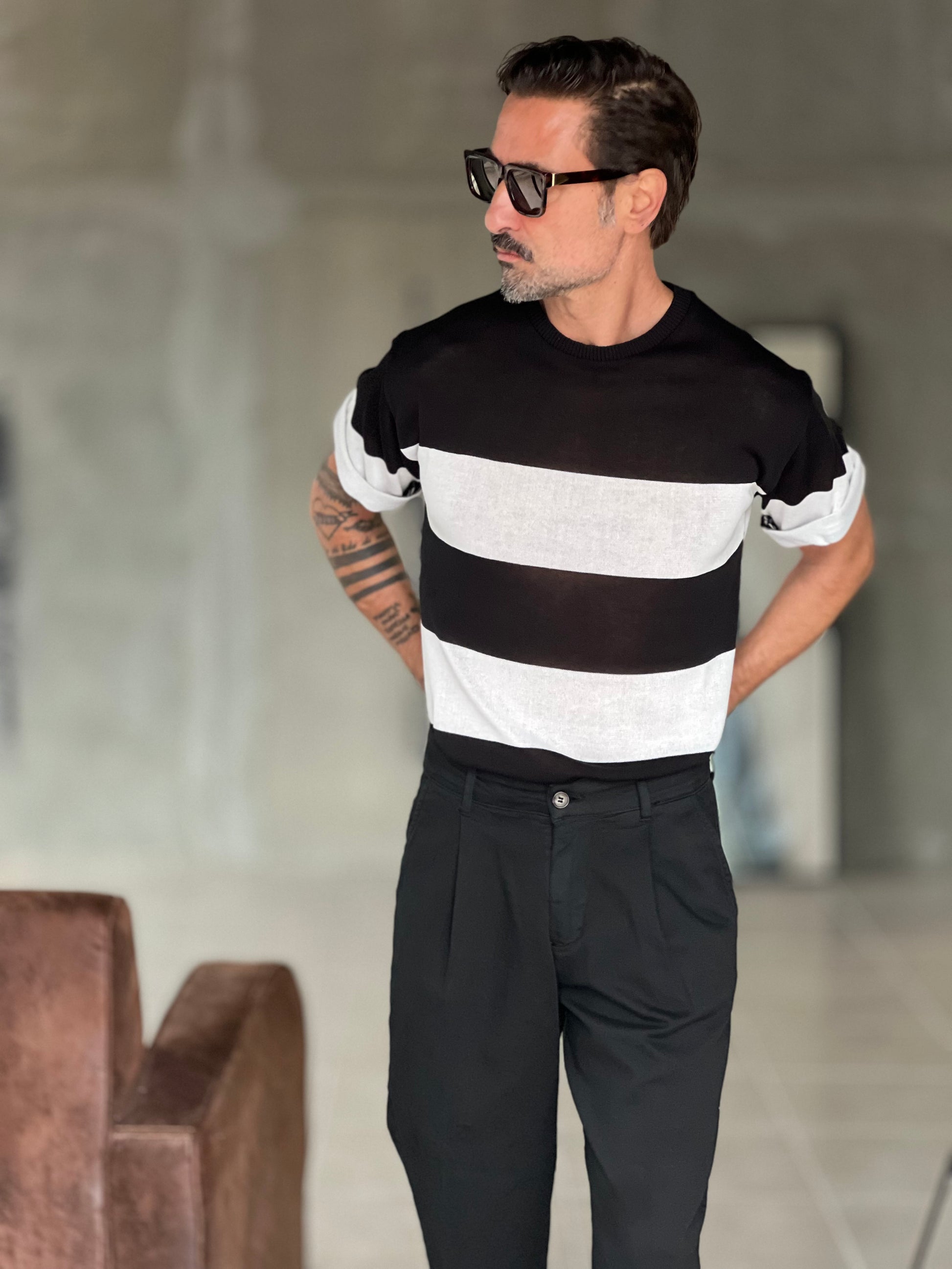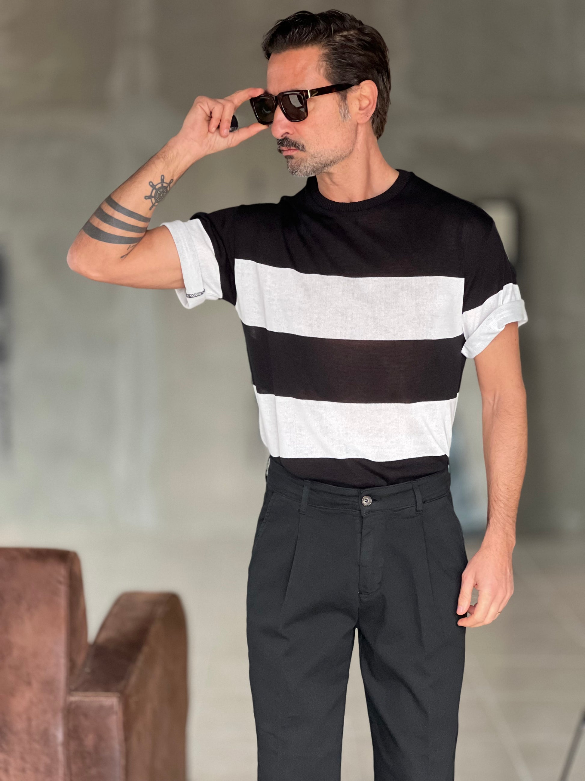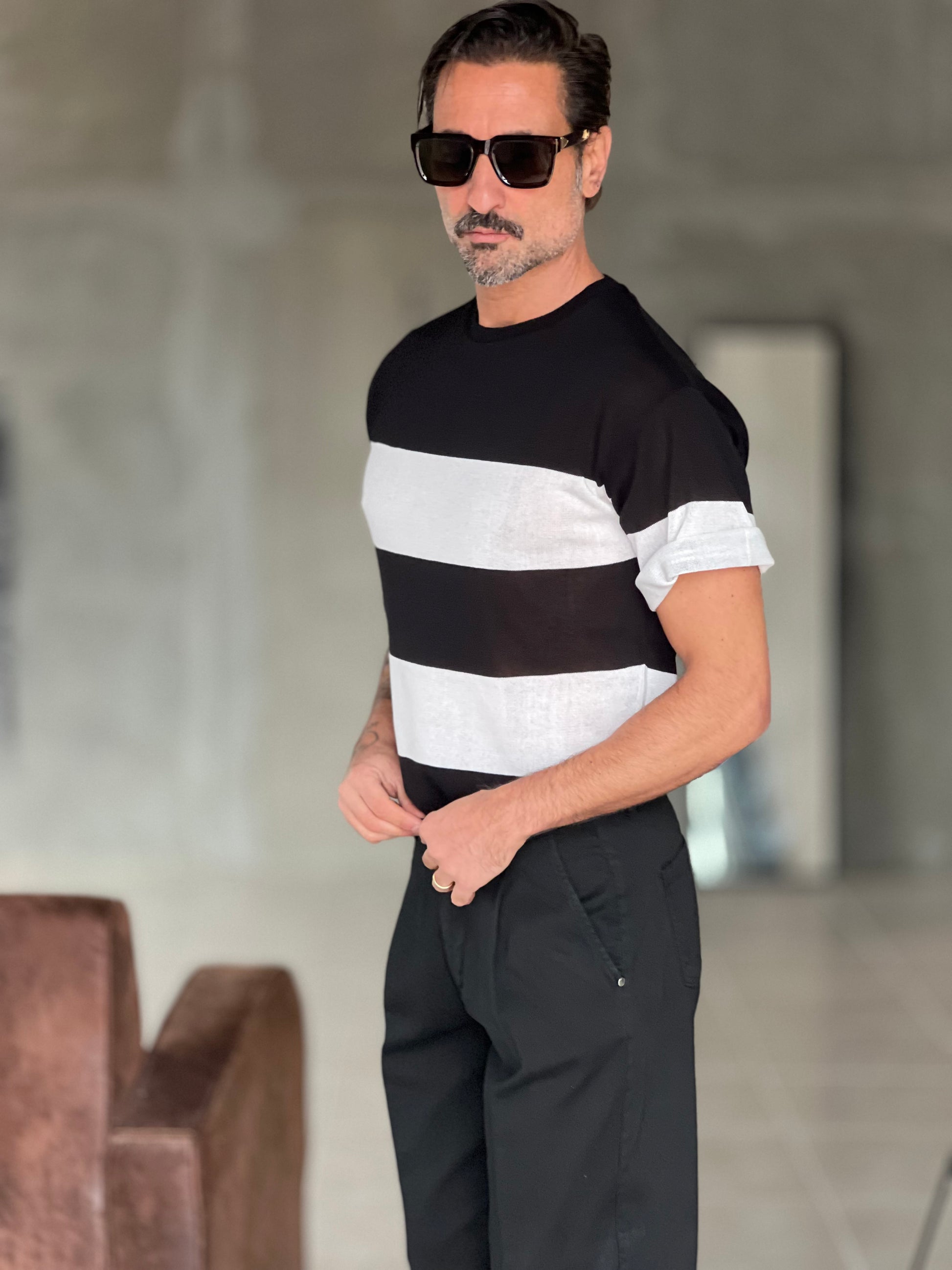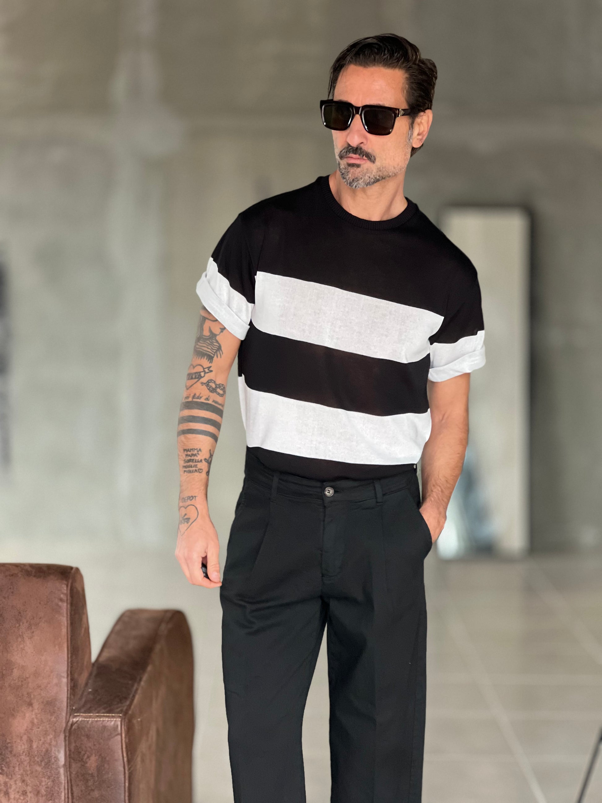 MAGLIA BIANCA RIGA GRANDE NERA IN FILO CROP