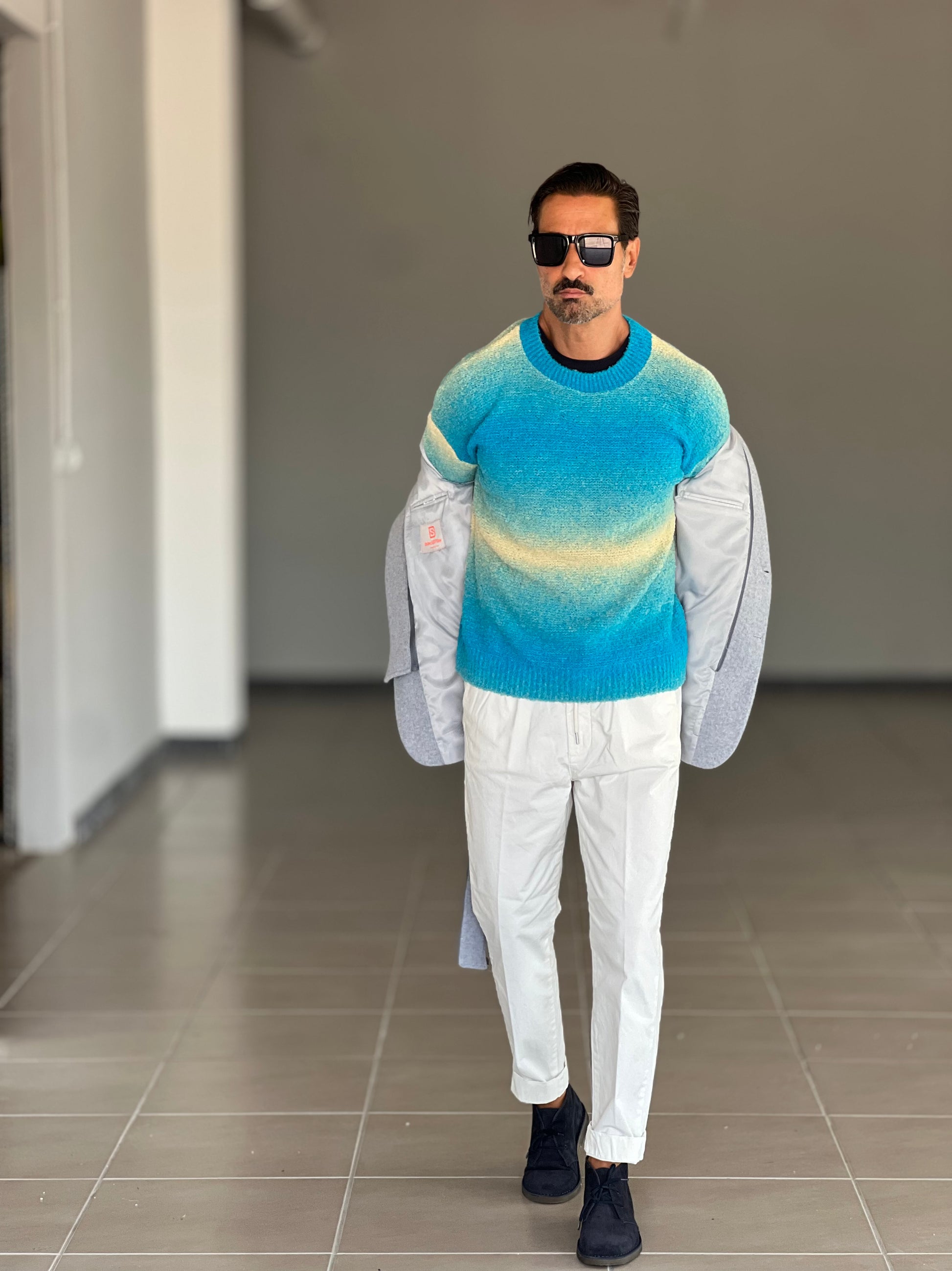 This crew neck sweater features an elegant degradé effect in shades of LIGHT BLU and cream, adding a refined and modern touch to your outfit. Crafted from high-quality materials, it ensures comfort and an optimal fit all day long. Perfect for those seeking a contemporary style without sacrificing practicality.