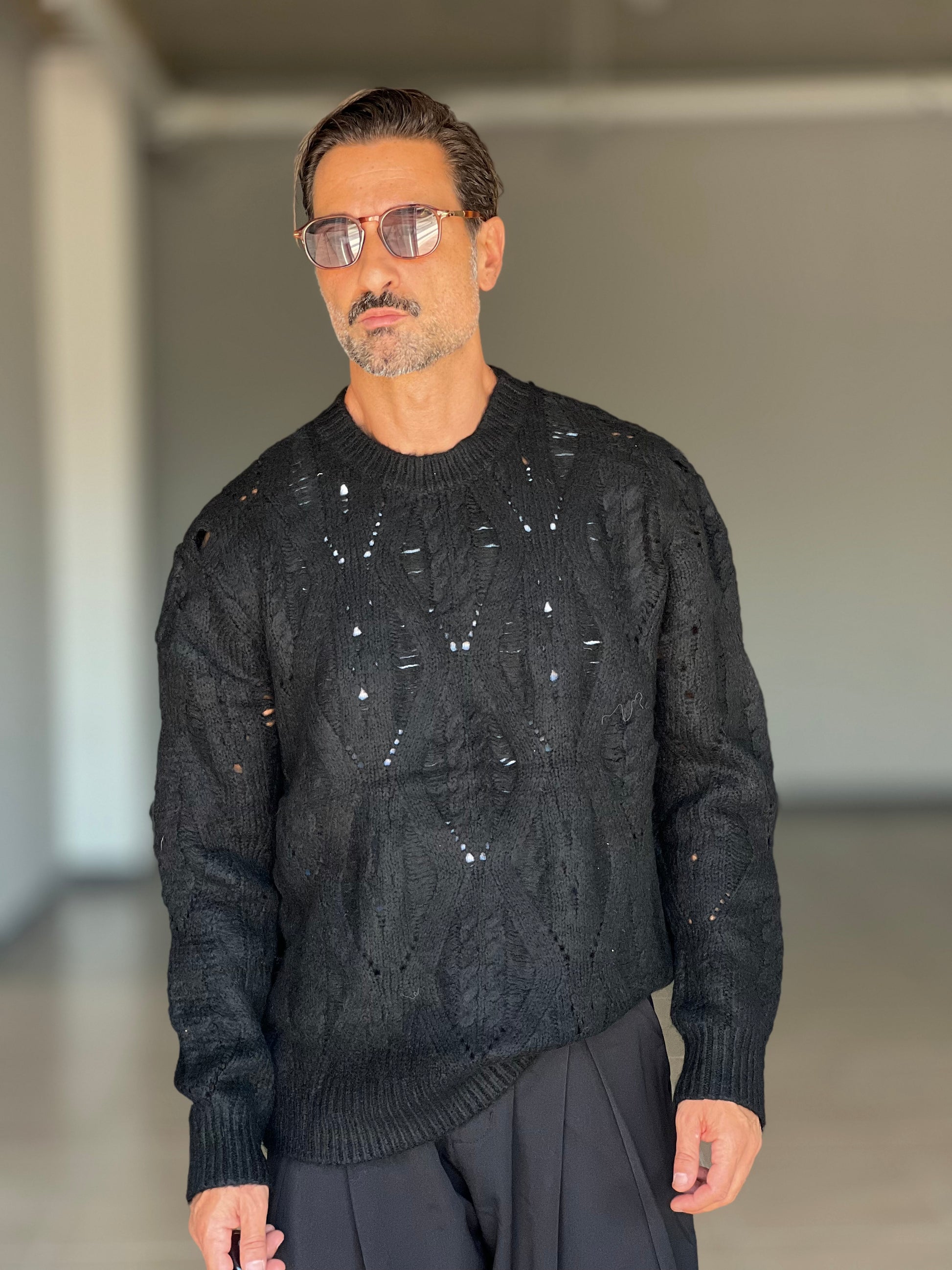 This crewneck sweater features a unique torn design that adds an edgy, contemporary touch to classic knitwear. Crafted for both style and comfort, it offers a versatile layering option suitable for modern wardrobes seeking a bold yet refined look. The distressed details provide character without compromising wearability, making it ideal for fashion-forward individuals wanting to express personality through their attire.