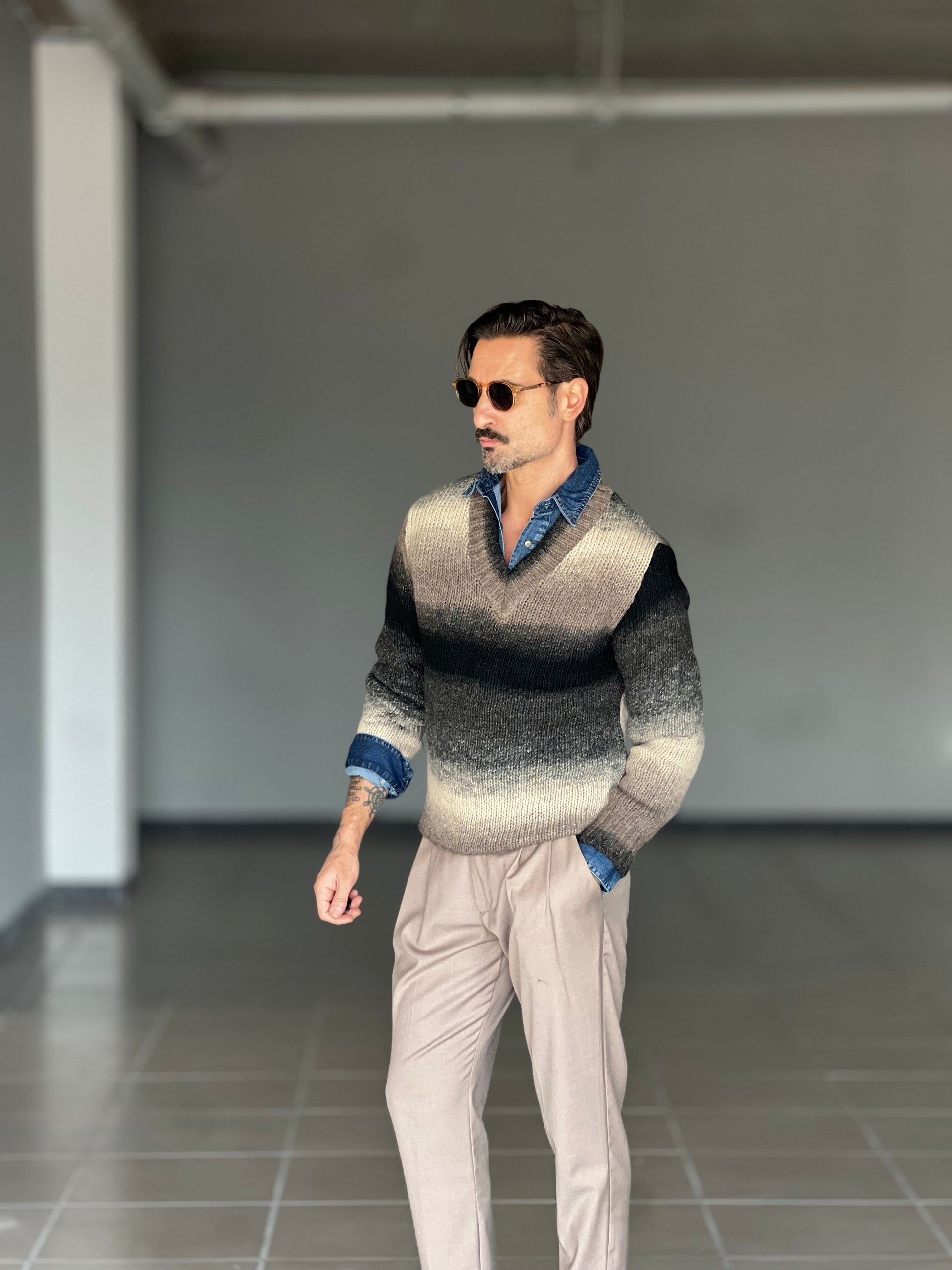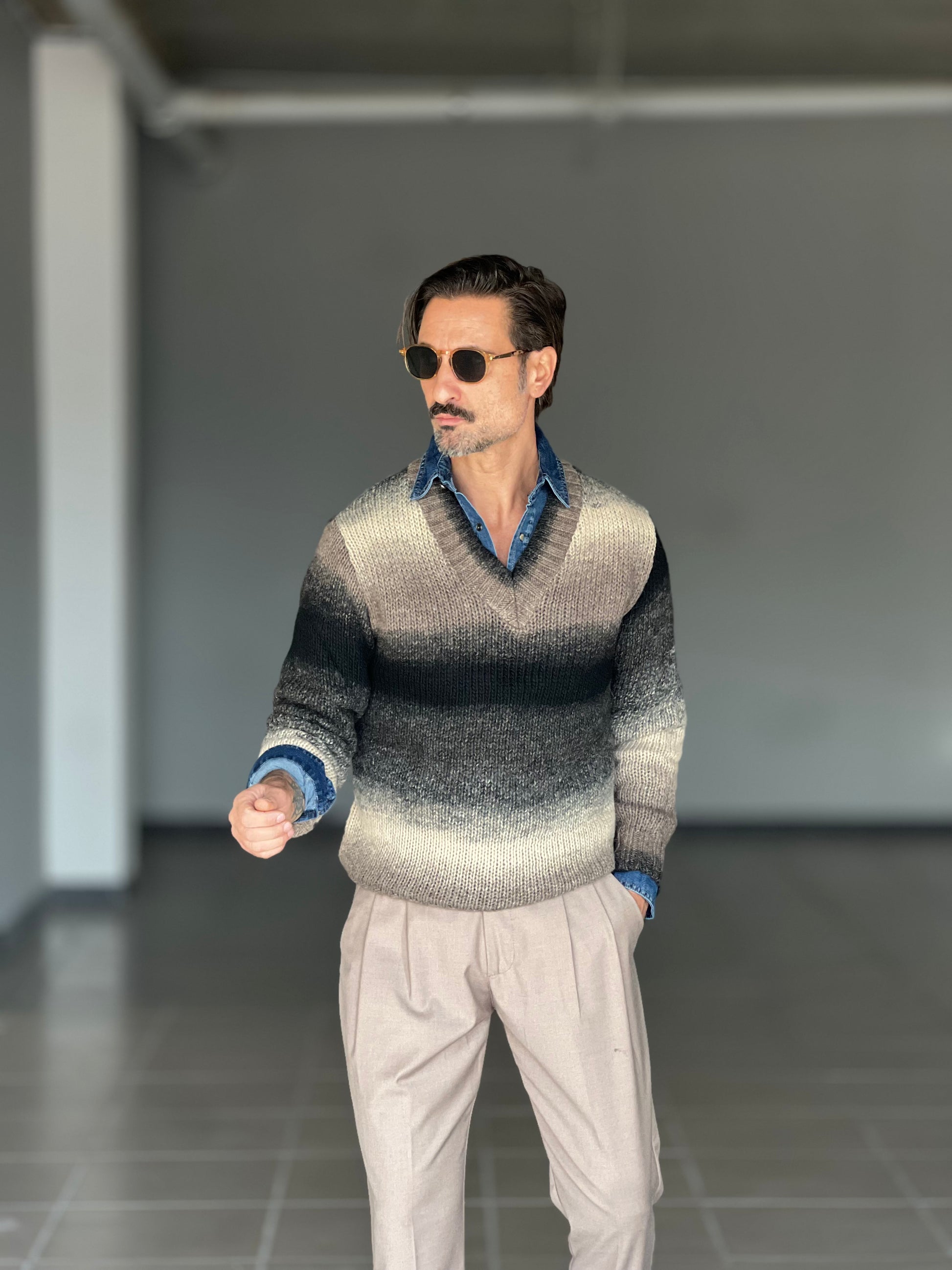 MAGLIA SCOLLO V DEGRADE' MORO E PANNA MISTI LANA E ALPACA