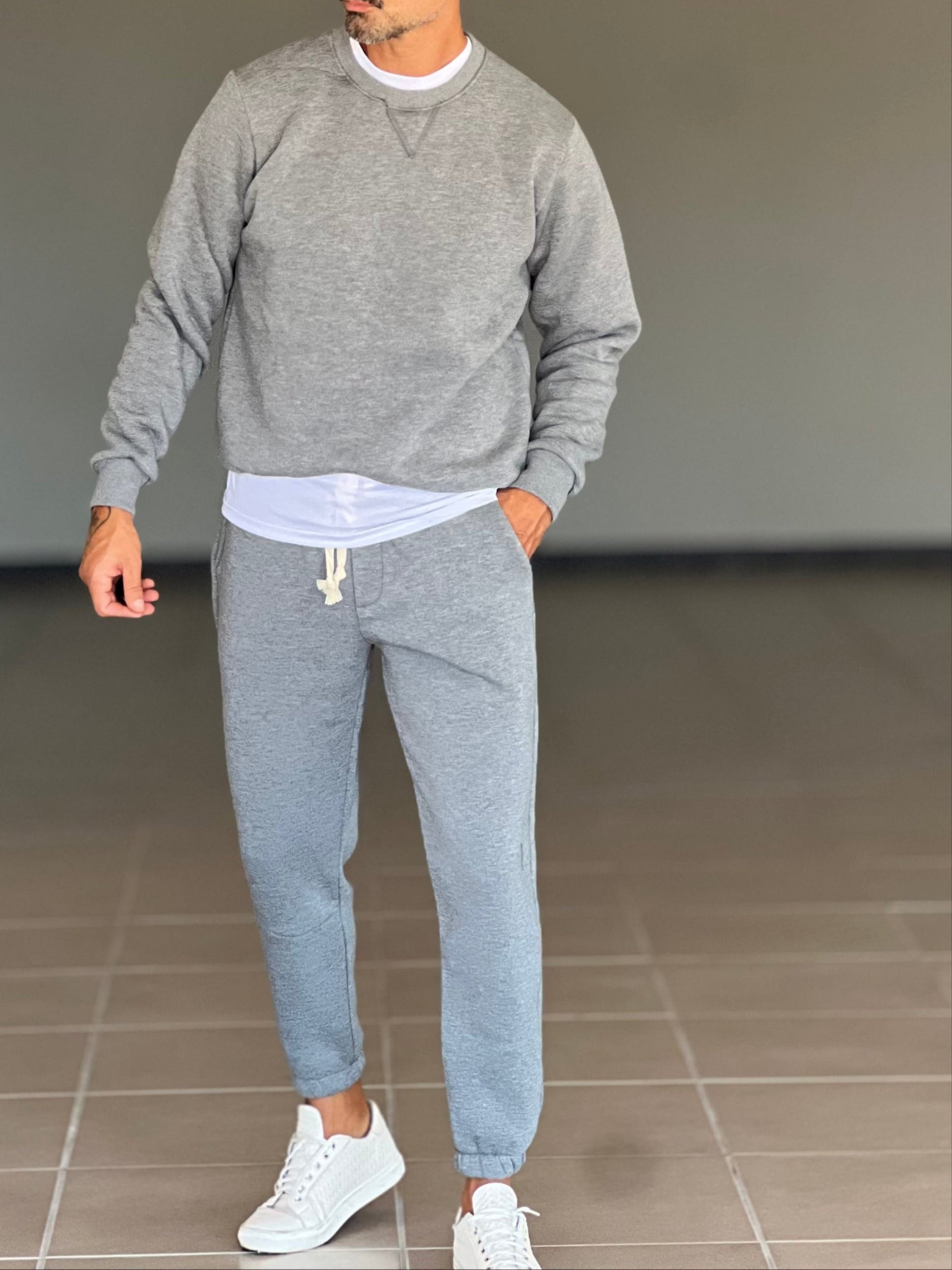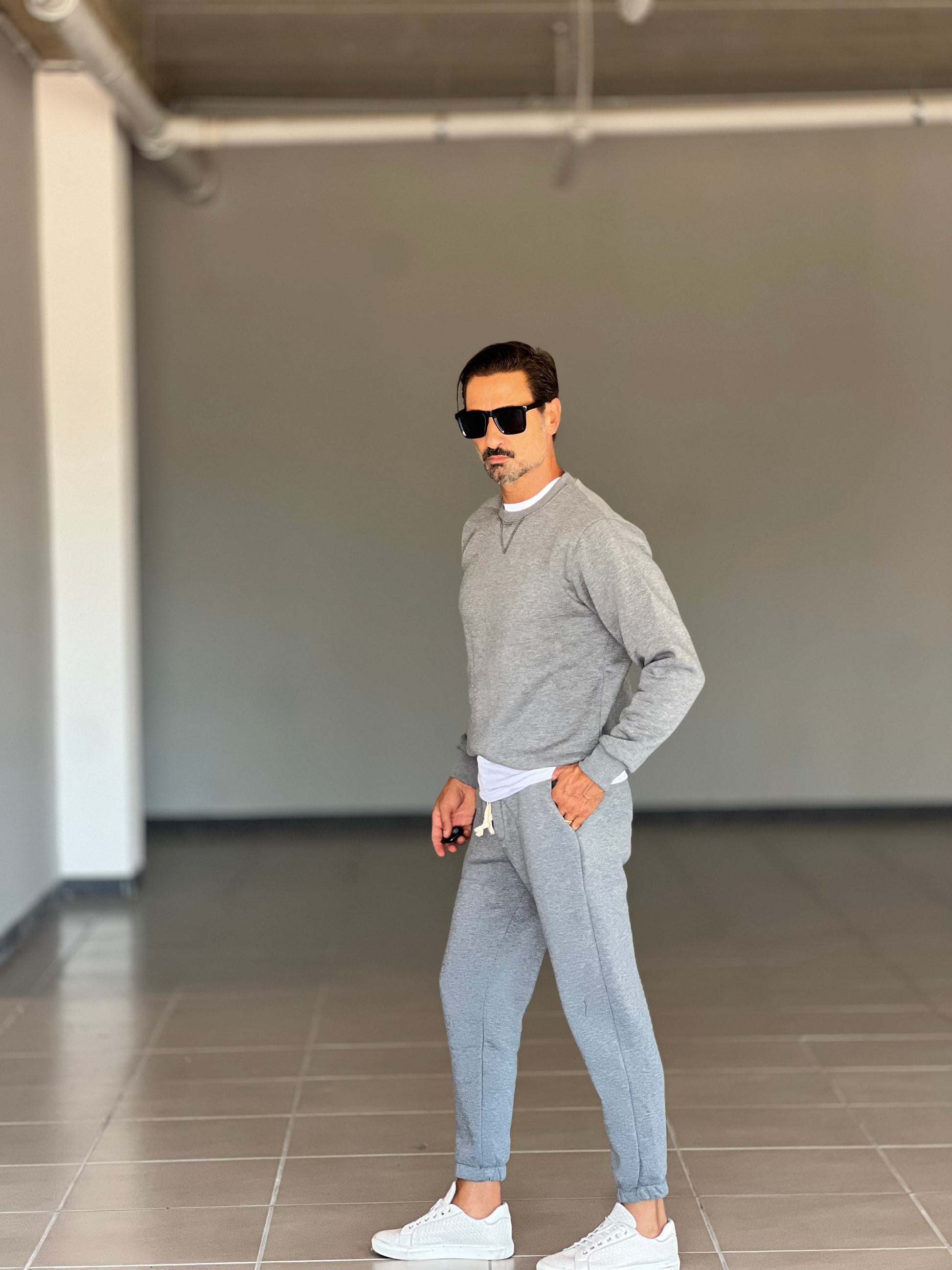 This gray sweatshirt tracksuit combines comfort and style with its soft fleece fabric, ideal for maintaining warmth during cooler days. Designed for versatile use, it offers a relaxed fit that supports easy movement for both casual wear and light physical activity. Its neutral color ensures effortless pairing with other wardrobe essentials, making it a practical choice for everyday wear.