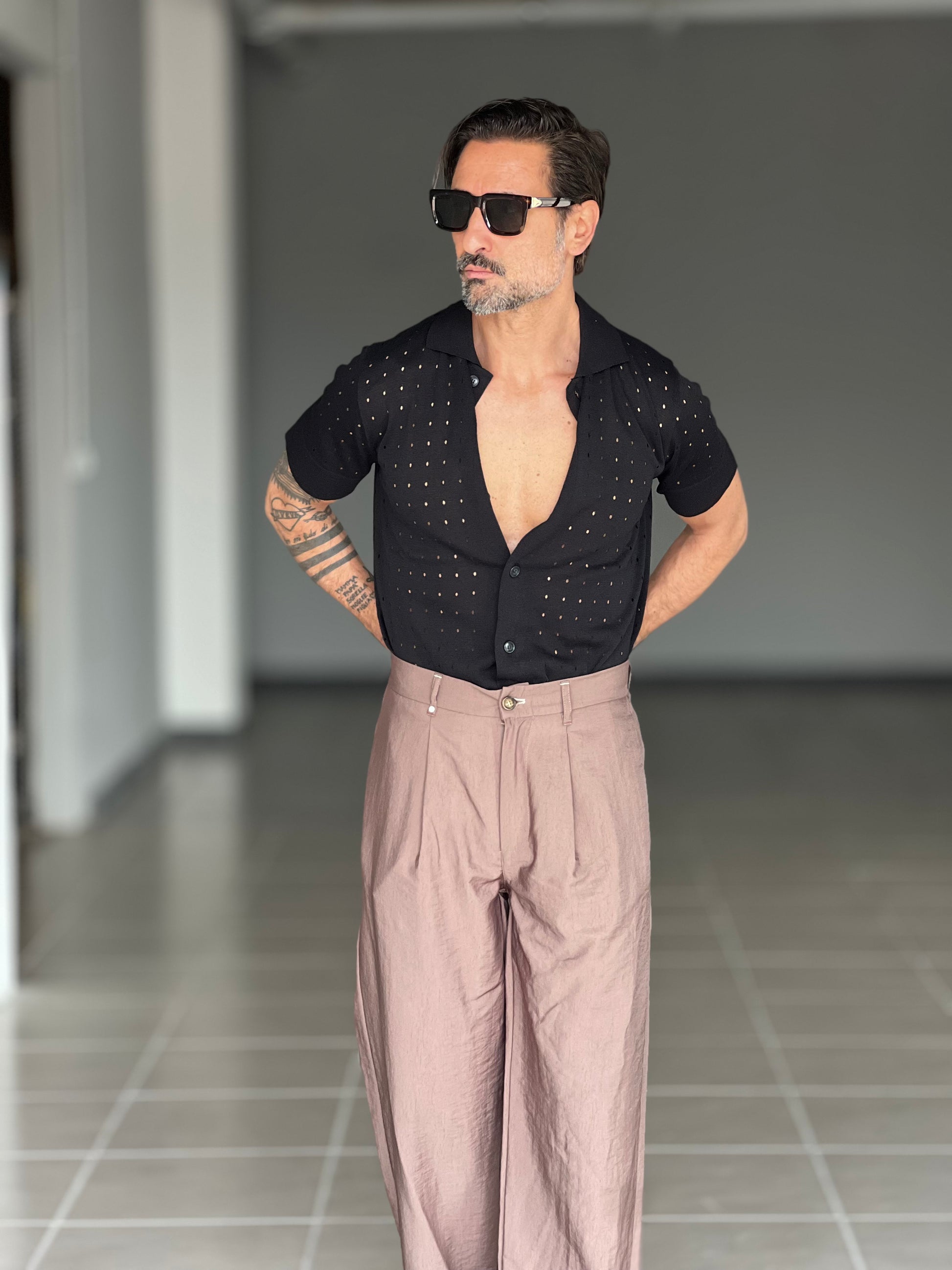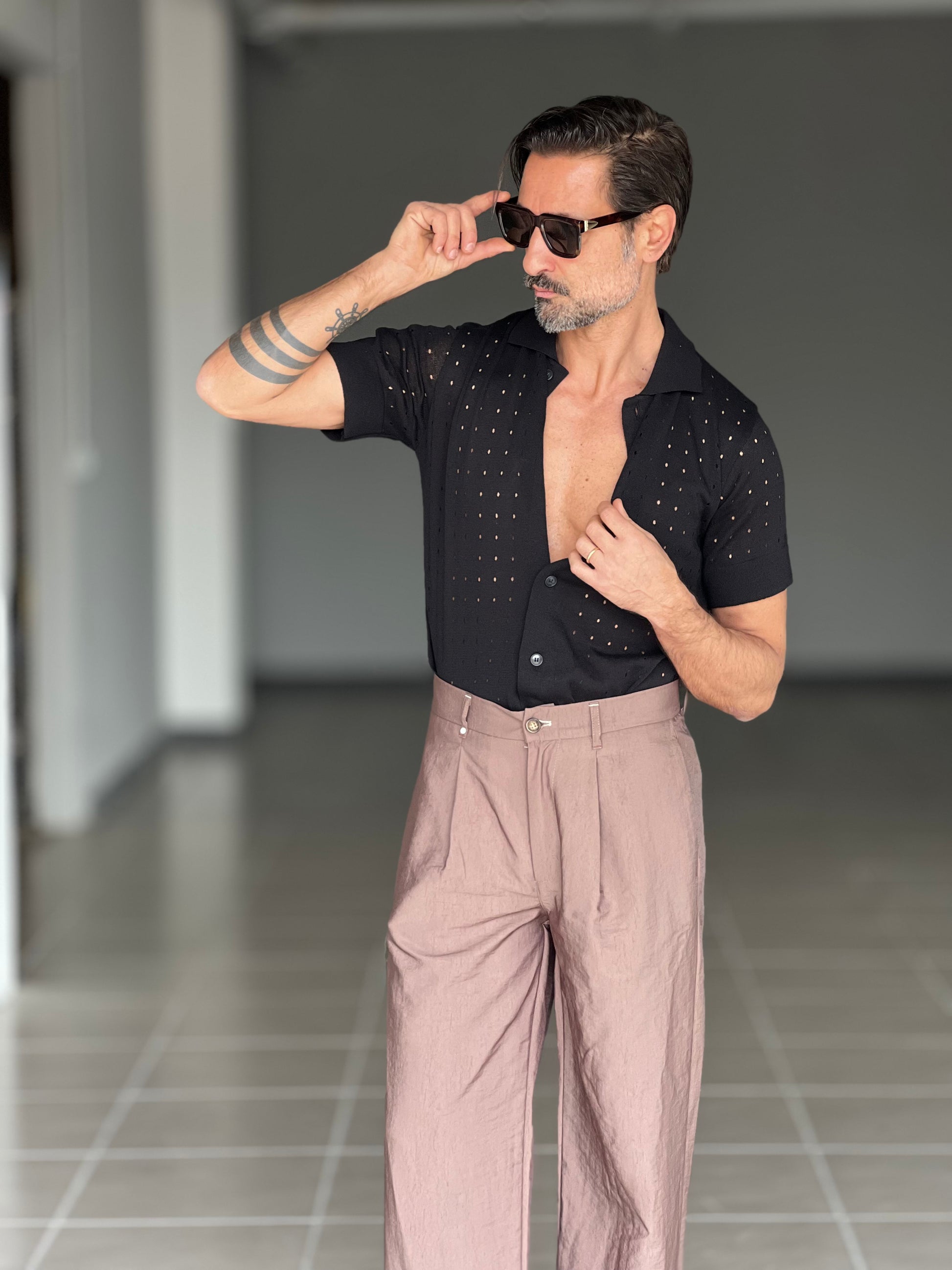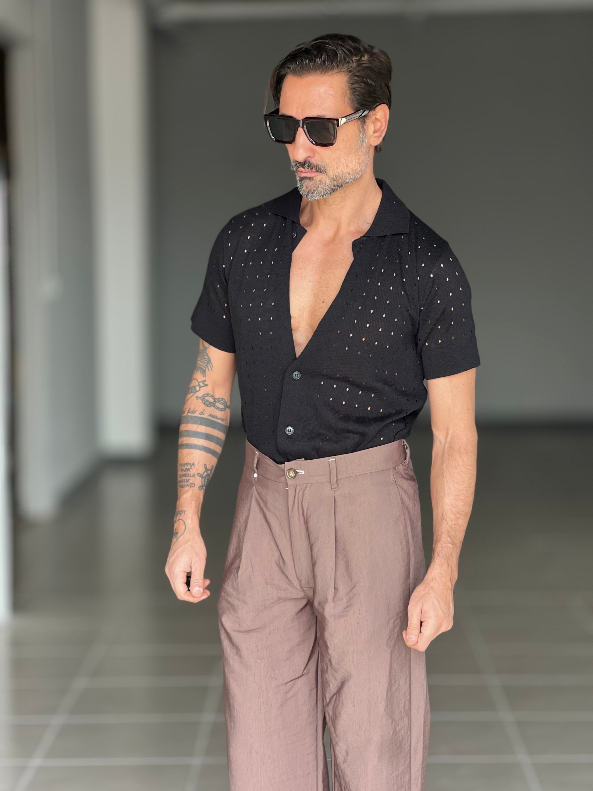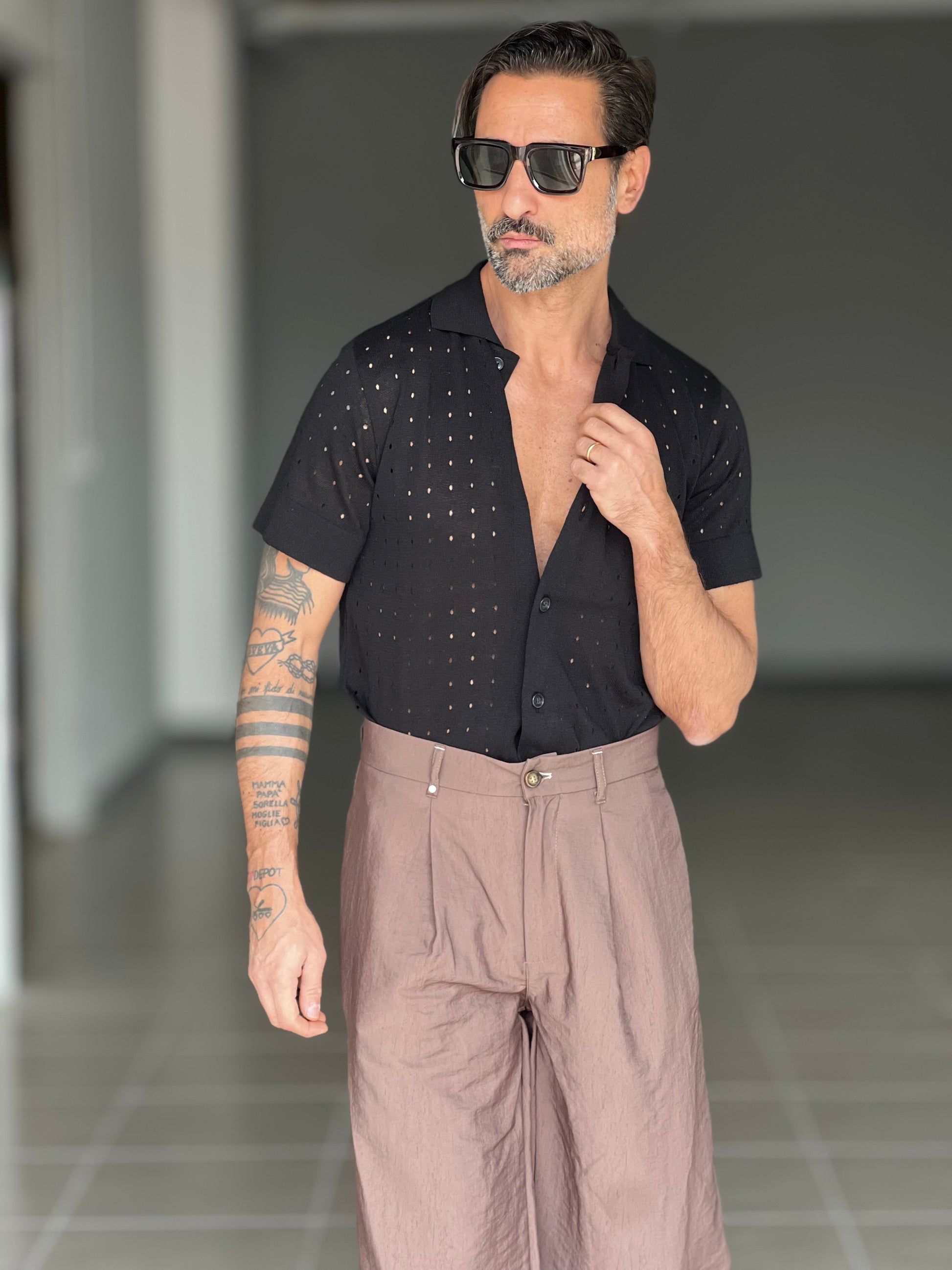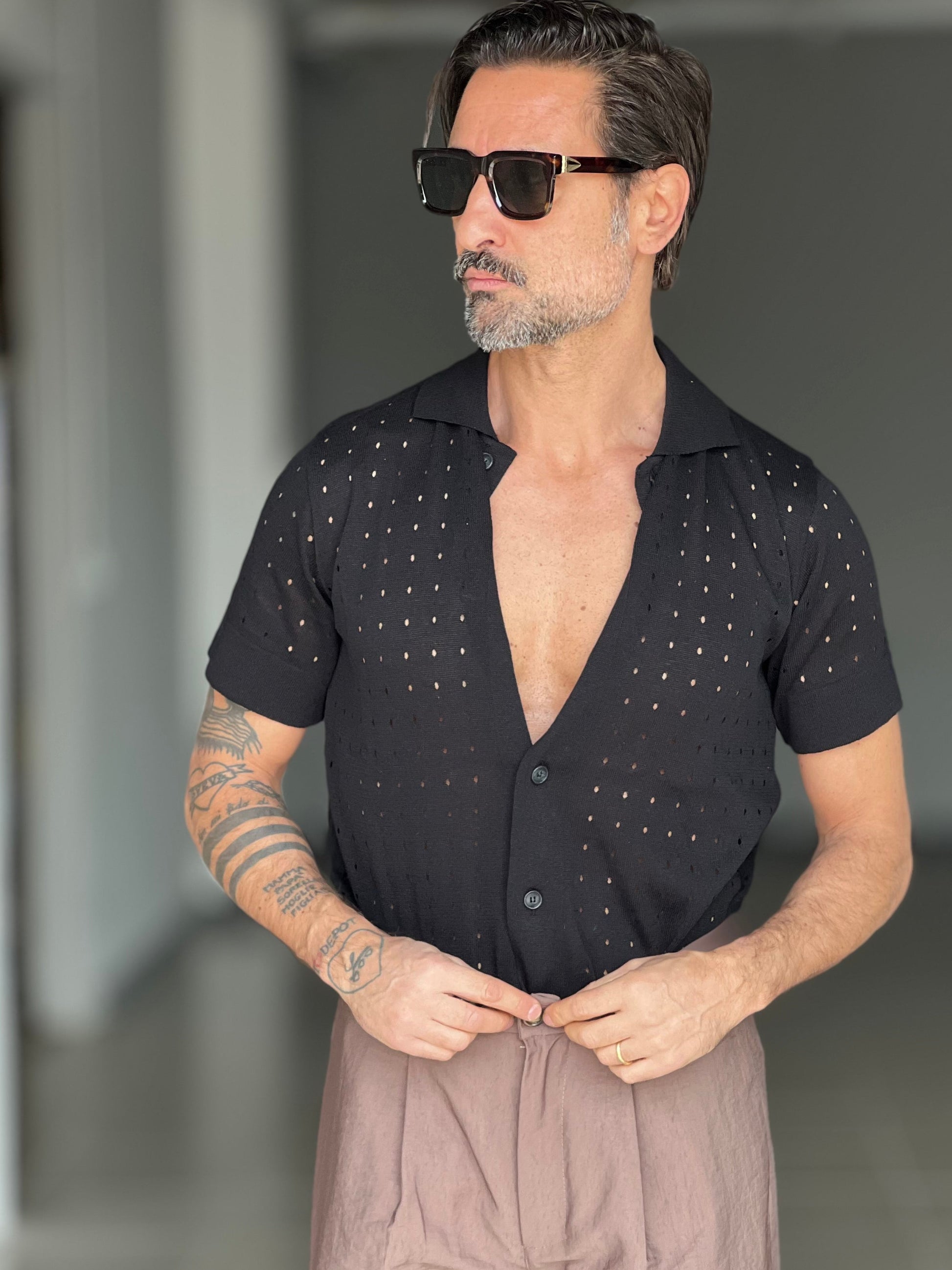 POLO CAMICIA NERA TRAMATURA FORATA BL11