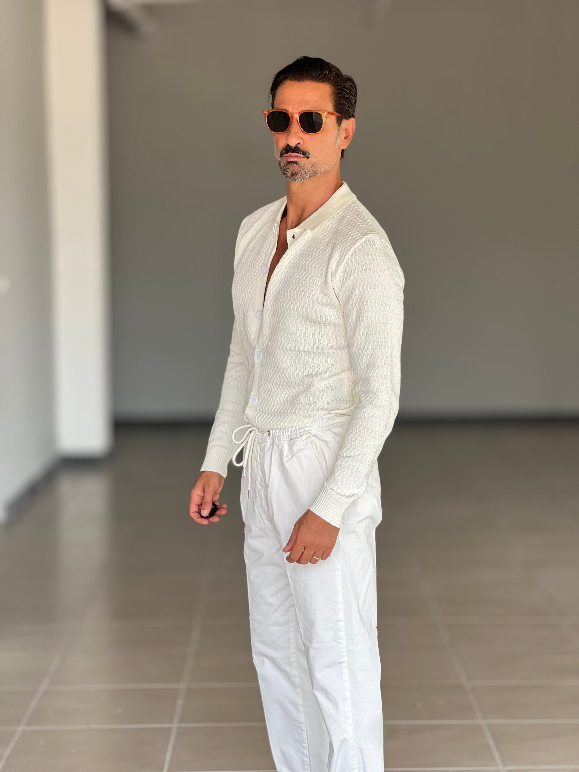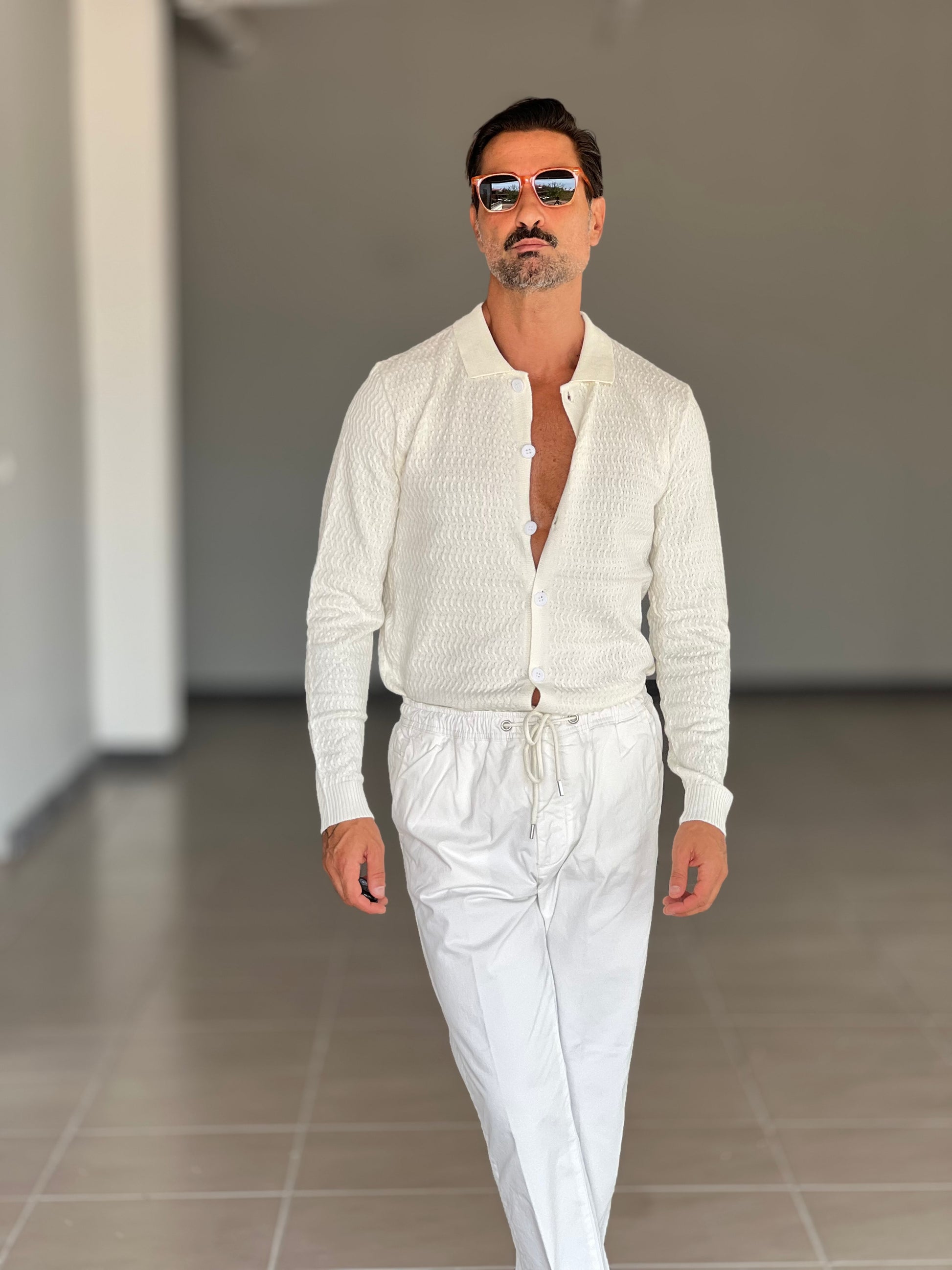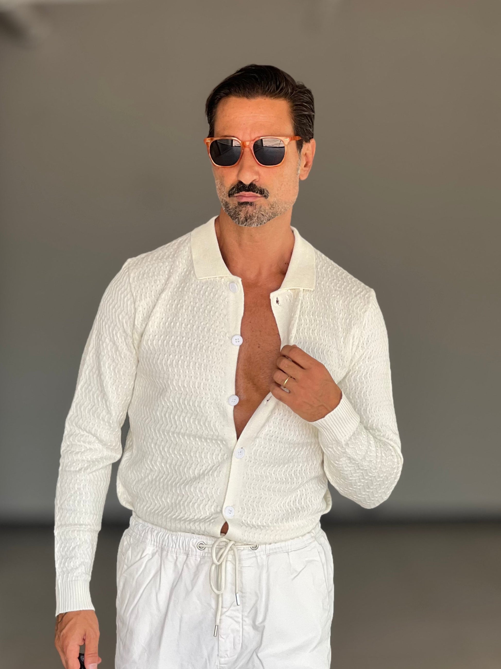 LA POLO CARDIGAN TRAMATA è realizzato in un tessuto nero meticolosamente lavorato che coniuga resistenza e texture raffinata. Progettato per offrire comfort e versatilità, il suo taglio sartoriale consente un'ampia vestibilità senza soluzione di continuità, mantenendo una silhouette impeccabile. Questo capo è ideale per chi apprezza la sartorialità impeccabile abbinata alla praticità, adatto sia per contesti professionali che per look casual sofisticati.