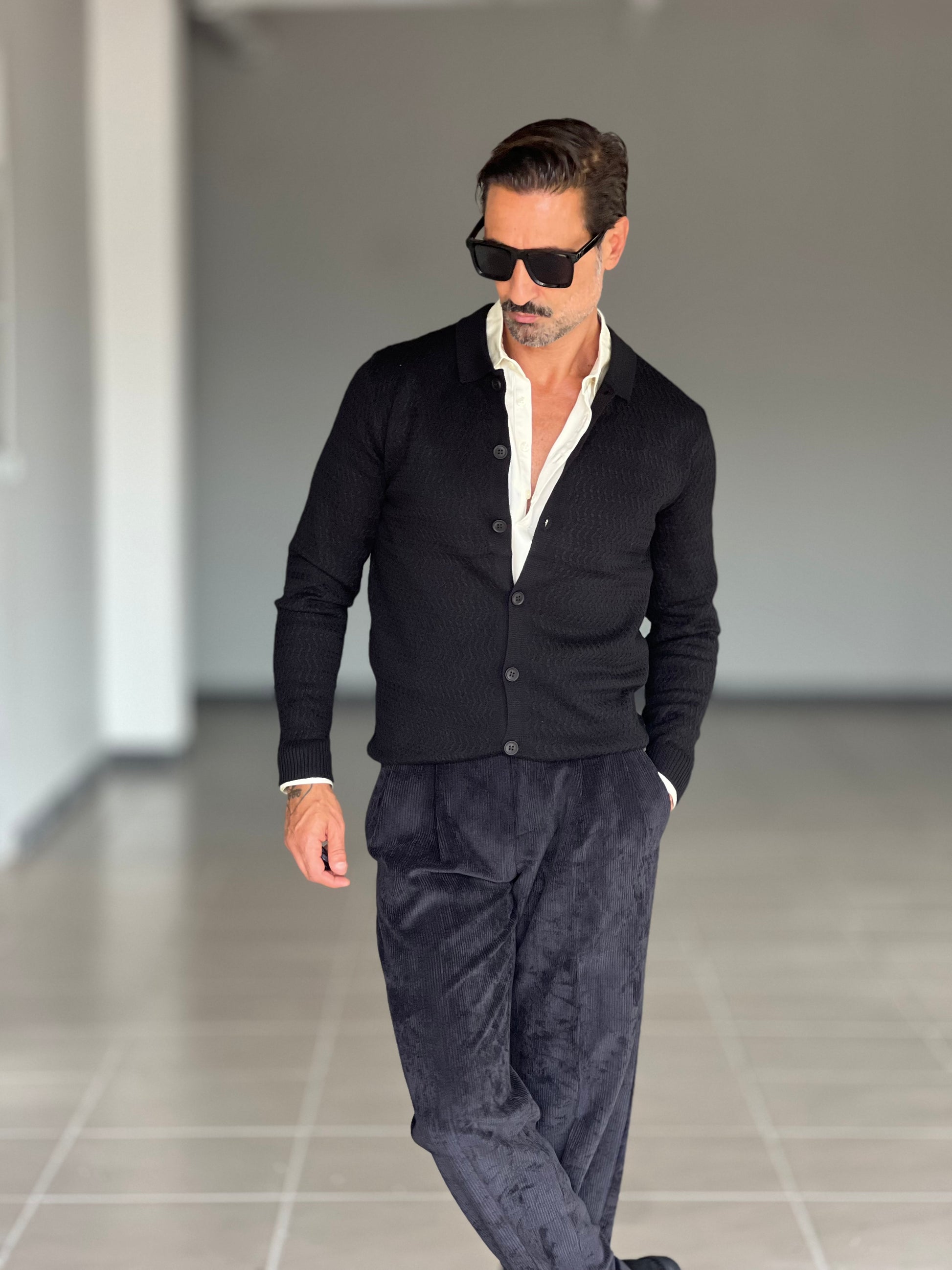 The POLO CARDIGAN TRAMATA features a meticulously crafted black woven fabric that balances durability with refined texture. Engineered for comfort and versatility, its tailored fit allows seamless layering while maintaining a sharp silhouette. This piece is ideal for those who appreciate expert tailoring combined with practical wearability, suitable for both professional settings and sophisticated casual looks.