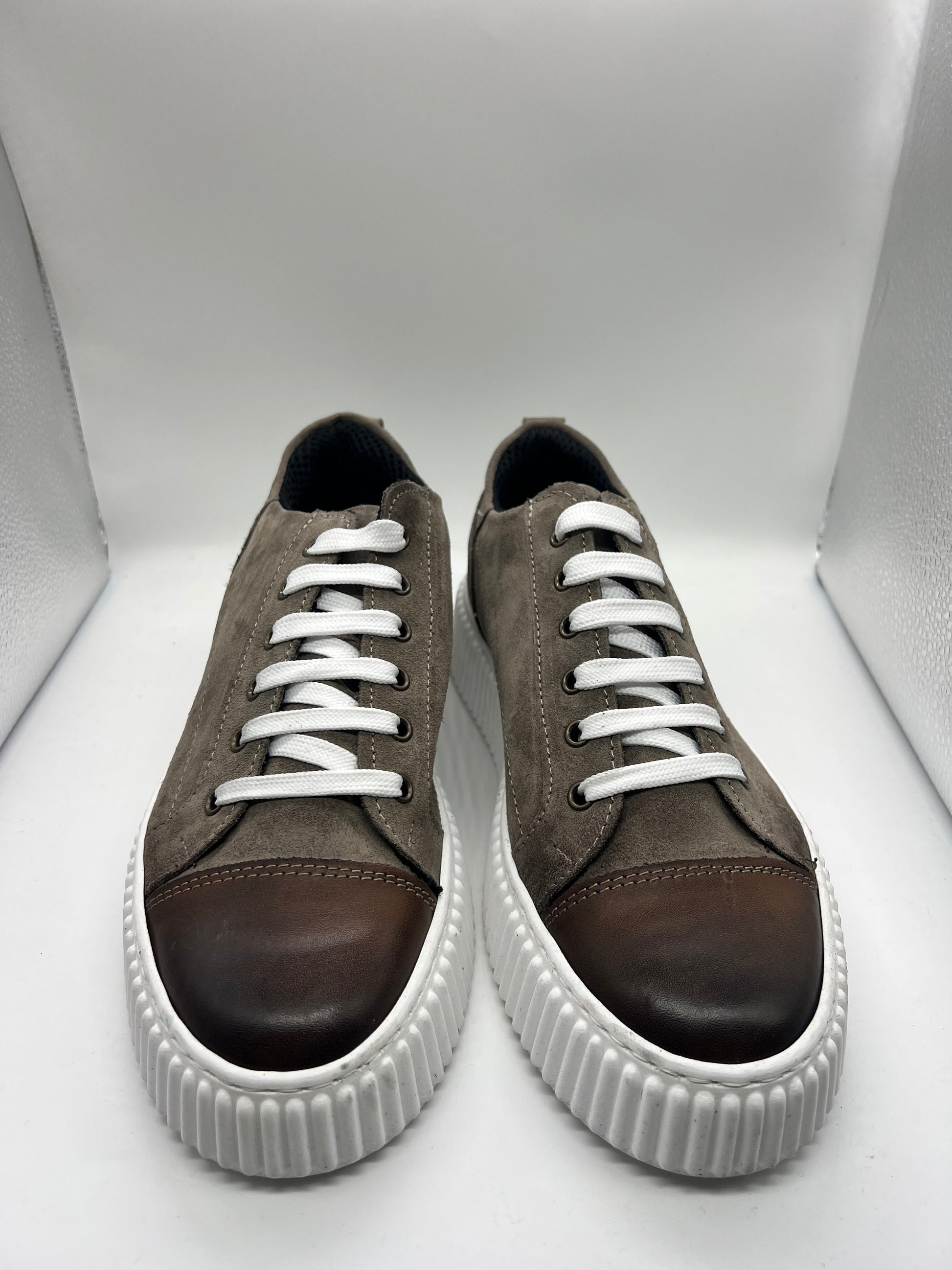 Queste sneaker combinano una sofisticata tomaia color fango con una raffinata punta in pelle bottalata, esaltandone resistenza e stile. La suola bianca offre un netto contrasto, garantendo al contempo supporto e stabilità confortevoli. Perfette per chi cerca un mix di materiali di alta qualità e lavorazione artigianale, queste scarpe offrono un comfort duraturo e un look raffinato, adatte a diverse occasioni.